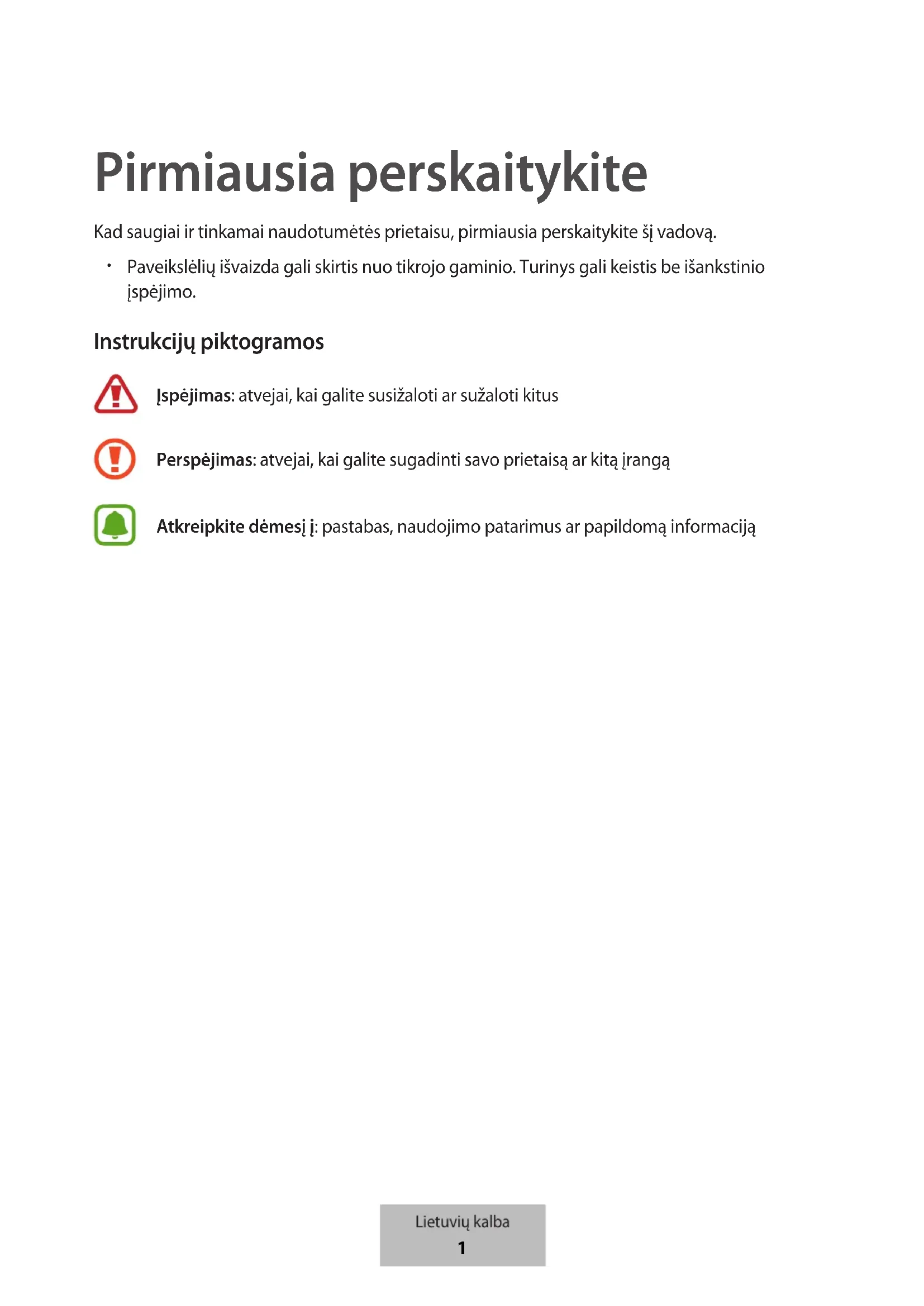 Paveikslėlių išvaizda gali skirtis nuo tikrojo gaminio. Turinys gali keistis be išankstinio įspėjimo. Instrukcijų piktogramos Įspėjimas: atvejai, kai galite susižaloti ar sužaloti kitus Perspėjimas: atvejai, kai galite sugadinti savo prietaisą ar kitą įrangą Atkreipkite dėmesį į: pastabas, naudojimo patarimus ar papildomą informaciją Lietuvių kalba