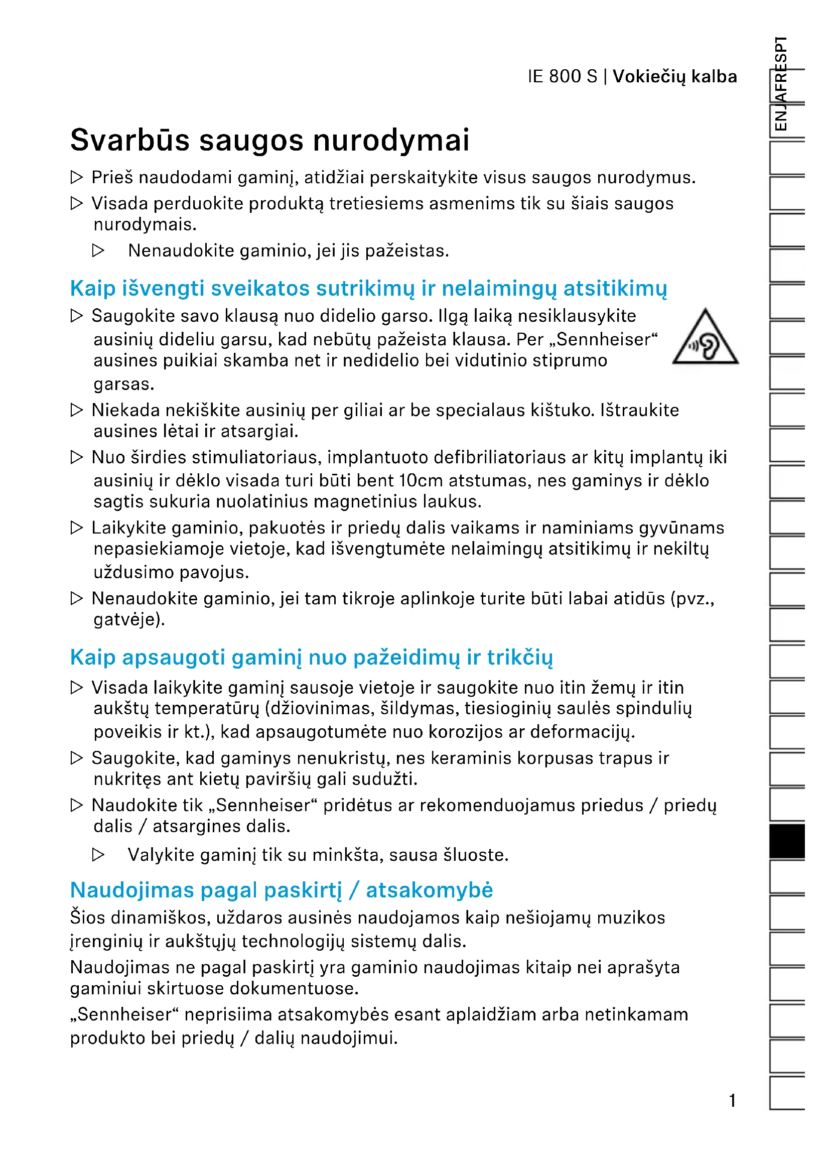 - EEIA direktīva (2012/19/ES) Simbols ar pārsvītrotu atkritumu tvertni ar riteņiem, kas atrodas uz produkta, baterijas/akumulatora (ja piemērojams) un/vai iepakojuma, informē jūs par to, ka šo produktu tā kalpošanas termiņa beigās nedrīkst izmest kopā ar saimniecības atkritumiem, bet gan jānodod atsevišķai utilizācijai. Attiecībā uz iepakojumu, lūdzu, ievērojiet izmantošanas valsts atkritumu šķirošanas noteikumus. Plašāku informāciju par šo produktu utilizāciju varat saņemt savā pašvaldībā, komunālajos savākšanas vai atgriešanas punktos vai pie sava Sennheiser partnera. Atsevišķa nolietoto elektronisko un elektroiekārtu, bateriju/akumulatoru (ja piemērojams) un iepakojuma savākšana veicina otrreizēju izmantošanu un/vai pārstādi, kā arī palīdz izvairīties no negatīvām sekām, piemēram, ja atkritumi satur kaitīgas vielas. Tādā veidā jūs dodat svarīgu pienesumu vides un veselības aizsardzībai.1 IE 800 S | Vokiečių kalba ENJAFRESPTNLITDASVFIELPLTRRUZHTWKOIDEELVLTCSSKHUROBGSLHR DE Svarbūs saugos nurodymai ▷ Prieš naudodami gaminį, atidžiai perskaitykite visus saugos nurodymus. ▷ Visada perduokite produktą tretiesiems asmenims tik su šiais saugos nurodymais. ▷ Nenaudokite gaminio, jei jis pažeistas. Kaip išvengti sveikatos sutrikimų ir nelaimingų atsitikimų ▷ Saugokite savo klausą nuo didelio garso. Ilgą laiką nesiklausykite ausinių dideliu garsu, kad nebūtų pažeista klausa. Per „Sennheiser“ ausines puikiai skamba net ir nedidelio bei vidutinio stiprumo garsas. ▷ Niekada nekiškite ausinių per giliai ar be specialaus kištuko. Ištraukite ausines lėtai ir atsargiai. ▷ Nuo širdies stimuliatoriaus, implantuoto defibriliatoriaus ar kitų implantų iki ausinių ir dėklo visada turi būti bent 10cm atstumas, nes gaminys ir dėklo sagtis sukuria nuolatinius magnetinius laukus. ▷ Laikykite gaminio, pakuotės ir priedų dalis vaikams ir naminiams gyvūnams nepasiekiamoje vietoje, kad išvengtumėte nelaimingų atsitikimų ir nekiltų uždusimo pavojus. ▷ Nenaudokite gaminio, jei tam tikroje aplinkoje turite būti labai atidūs (pvz., gatvėje). Kaip apsaugoti gaminį nuo pažeidimų ir trikčių ▷ Visada laikykite gaminį sausoje vietoje ir saugokite nuo itin žemų ir itin aukštų temperatūrų (džiovinimas, šildymas, tiesioginių saulės spindulių poveikis ir kt.), kad apsaugotumėte nuo korozijos ar deformacijų. ▷ Saugokite, kad gaminys nenukristų, nes keraminis korpusas trapus ir nukritęs ant kietų paviršių gali sudužti. ▷ Naudokite tik „Sennheiser“ pridėtus ar rekomenduojamus priedus / priedų dalis / atsargines dalis. ▷ Valykite gaminį tik su minkšta, sausa šluoste. Naudojimas pagal paskirtį / atsakomybė Šios dinamiškos, uždaros ausinės naudojamos kaip nešiojamų muzikos įrenginių ir aukštųjų technologijų sistemų dalis. Naudojimas ne pagal paskirtį yra gaminio naudojimas kitaip nei aprašyta gaminiui skirtuose dokumentuose. „Sennheiser“ neprisiima atsakomybės esant aplaidžiam arba netinkamam produkto bei priedų / dalių naudojimui. LT Naudojimo instrukcija2 Vokiečių kalba | IE 800 S Pakete: 1 Į ausies kanalą kišamos ausinės IE800S, laido ilgis– 0,25m jungiamasis kabelis 1 2,5 mm stereokištukas, simetrinis, ilgis apie 1 m 1 3,5 mm stereokištukas, ilgis apie 1 m 1 4,4 mm „Pentaconn“ stereokištukas, simetrinis, ilgis apie 1,1 m Pagalvėlės (poromis): 3 silikoninės, S, M (uždėtos ant ausinių) ir L dydžio 3 Comply™, S, M ir L dydžio 1 naudojimo instrukcija 1 krepšys 1 mikropluošto šluostė Jūsų IE 800 S