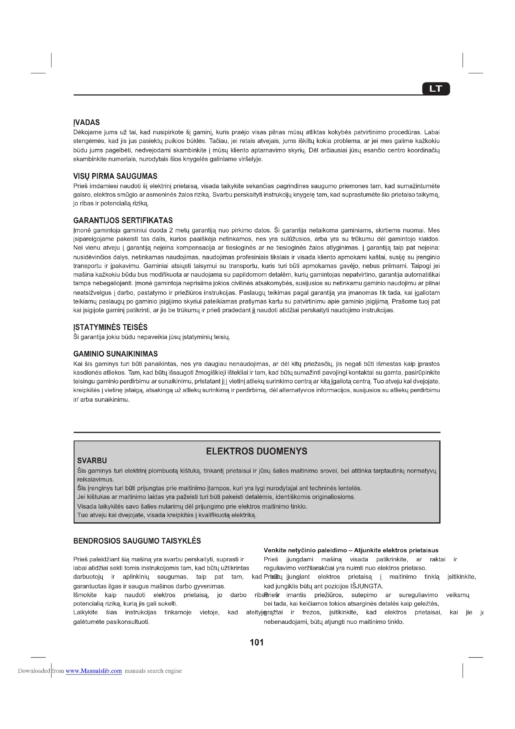 Priešimdamiesinaudotišįelektrinįprietaisą,visadataikykitesekančiaspagrindinessaugumopriemonestam,kadsumažintumėte gaisro,elektrossmūgioarasmeninėsžalosriziką.Svarbuperskaitytiinstrukcijųknygelętam,kadsuprastumėtešioprietaisotaikymą, joribasirpotencialiąriziką. GARANTIJOS SERTIFIKATAS Įmonėgamintojagaminiuiduoda2metųgarantijąnuopirkimodatos.Šigarantija netaikomagaminiams,skirtiemsnuomai.Mes įsipareigojame pakeisti tas dalis, kurios paaiškėja netinkamos, nes yra sulūžusios, arba yra su trūkumu dėl gamintojo klaidos. Neivienu atveju į garantijąneįeina kompensacija ar tiesioginės arne tiesioginės žalos atlyginimas. Įgarantiją taip pat neįeina: nusidėvinčiosdalys,netinkamasnaudojimas,naudojimasprofesiniaistikslaisirvisadaklientoapmokamikaštai,susijęsuįrenginio transportu ir įpakavimu. Gaminiai atsiųsti taisymui su transportu, kuris turibūti apmokamas gavėjo, nebus priimami. Taipogi jei mašinakažkokiubūdubusmodifikuotaarnaudojamasupapildomomdetalėm,kuriųgamintojasnepatvirtino,garantijaautomatiškai tampanebegaliojanti.Įmonėgamintojaneprisiimajokioscivilinėsatsakomybės,susijusiossunetinkamugaminionaudojimuarpilnai neatsižvelgusįdarbo,pastatymoirpriežiūrosinstrukcijas.Paslaugųteikimaspagalgarantijąyraįmanomastiktada,kaiįgaliotam teikiamųpaslaugųpogaminioįsigijimoskyriuipateikiamasprašymaskartusupatvirtinimuapiegaminioįsigijimą.Prašometuojpat kaiįsigijotegaminįpatikrinti,arjisbetrūkumųirpriešpradedantjįnaudotiatidžiaiperskaitytinaudojimoinstrukcijas.