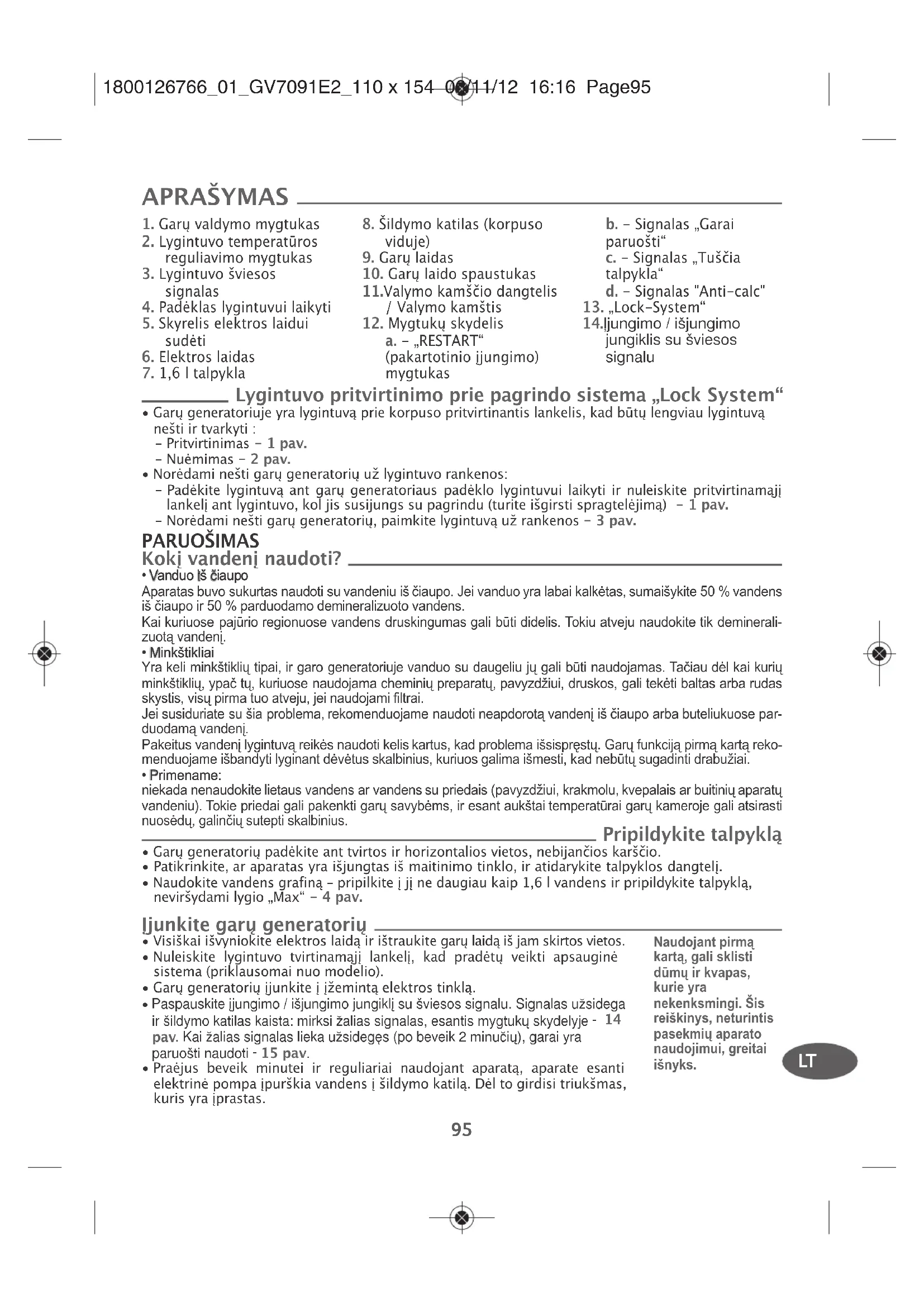 1800126766_01_GV7091E2_110 x 154 06/11/12 16:16 Page9798 R.807.Z628/607T,-6-+-80Z.<8/30;A8.v6,-8.,h04A.8;48-ç,0â0>.7-Ach0âZ6283-c06-284-80;A8.v8åAc0;3 ;6A<6s8/3B FA312./3, J628/3,0;A8.v6,-+, *;A.7<8/68 Neužsidega garų generato- riaus signalas arba lygin- tuvo šviesos signalas. Nėra aparatui reikiamos įtampos. Patikrinkite, ar aparatas gerai i$jungtas i$ veikianti$ elektros lizda$ ir yra jam reikalinga i$tampa (uz¨sidega i$jungimo ¶ iéjungimo jungiklis su éviesos signalu). Vanduo teka per pado sky- lutes. Naudojate garus, kai lygintuvas nėra pa- kankamai įkaitęs. Vamzdeliuose susikondensavo vanduo, nes garus naudojate pirmą kartą arba kurį laiką jų nenaudojote. Patikrinkite, kaip nustatytas termostatas. Prieš įjungdami garų valdymo mygtuką palaukite, kol lygintuvo šviesos signalas užges. Garų valdymo mygtuką spauskite lygin- tuvą laikydami toliau nuo lyginimo stalo, kol iš lygintuvo pradės eiti garai. Ant skalbinių atsiranda van- dens pėdsakų. Į lyginimo stalo užtiesalą prisigeria van- dens, nes jis nepritaikytas prie garų ge- neratoriaus galingumo. Įsigykite pritaikytą lyginimo stalą (padėklą su grotelėmis, ant kurio nesikaupia van- duo). Per pado skylutes teka bal- tas skystis. Šildymo katilas išmeta kalkių nuosėdas, nes jis nėra reguliariai plaunamas. Šildymo katilo plovimas (žr. skyrelį „Šil- dymo katilo plovimas“). Per pado skylutes teka rudas skystis ir tepa skalbi- nius. Naudojate chemines nukalkinimo prie- mones arba į lyginimo vandenį dedate priedų. Praplaukite kalkių surinkimo įtaisą, kaip yra aprašyta skyr. „Kalkių nuosėdų pašalinimas iš jūsų garo generatoriaus. Padas yra nešvarus arba rudas ir gali sutepti skalbi- nius. Naudojate per aukštą temperatūrą. Skalbiniai nebuvo pakankamai išskalauti arba lyginote naują drabužį prieš jį skalbdami. Naudojate krakmolą. Perskaitykite mūsų patarimus dėl tempe- ratūros reguliavimo. Įsitikinkite, ar skalbiniai pakankamai gerai išskalauti, kad būtų pašalintos galimos muilo ar cheminių priemonių liekanos nuo naujų drabužių. Krakmolą visada purkškite ant išvirkščio- sios lyginamo drabužio pusės. Garų yra nedaug arba visai nėra. Mirksi raudona lemputė „Vandens talpy- kla“. Pado temperatūra nustatyta ties didžiausia riba. Pripilkite į talpyklą vandens ir spauskite „RESTART“ mygtuką, kol signalas užges. Garų generatorius veikia įprastai, bet labai įkaitę garai išdžiūna, todėl mažiau matomi. Garai sklinda aplink kamštį. Kalkių surinkimo įtaisas yra blogai įsta- tytas į skyrelį. Pažeistas dangtelio sandariklis. Aparatas yra su defektu. Patikimai įstatykite kalkių surinkimo įtaisą. Kreipkitės į įgaliotą priežiūros centrą. Nebenaudokite garų generatoriaus ir kreipkitės į įgaliotą priežiūros centrą. Mirksi raudona lemputė „Vandens talpykla“. Nepaspaudėte pakartotinio aparato įjun- gimo mygtuko „RESTART“. Spauskite perjungimo mygtuką „RE- START“, esantį skydelyje, kol lemputė užges. Iš aparato apačios sklinda garai arba teka vanduo. Aparatas yra su defektu. Nebenaudokite garų generatoriaus ir kreipkitės į įgaliotą priežiūros centrą. Mirksi „nukalkinimo„ lemputė. Nepaspaude[te pakartotinio aparato ijungimo mygtuko =RESTART =. Spauskite perjungimo mygtuką „RE- START“, esantį skydelyje, kol lemputė užges. bP@K0FGKp@Qoè0*Y0JNGè0JQOQGNLKGPYoPV 1800126766_01_GV7091E2_110 x 154 06/11/12 16:16 Page9899