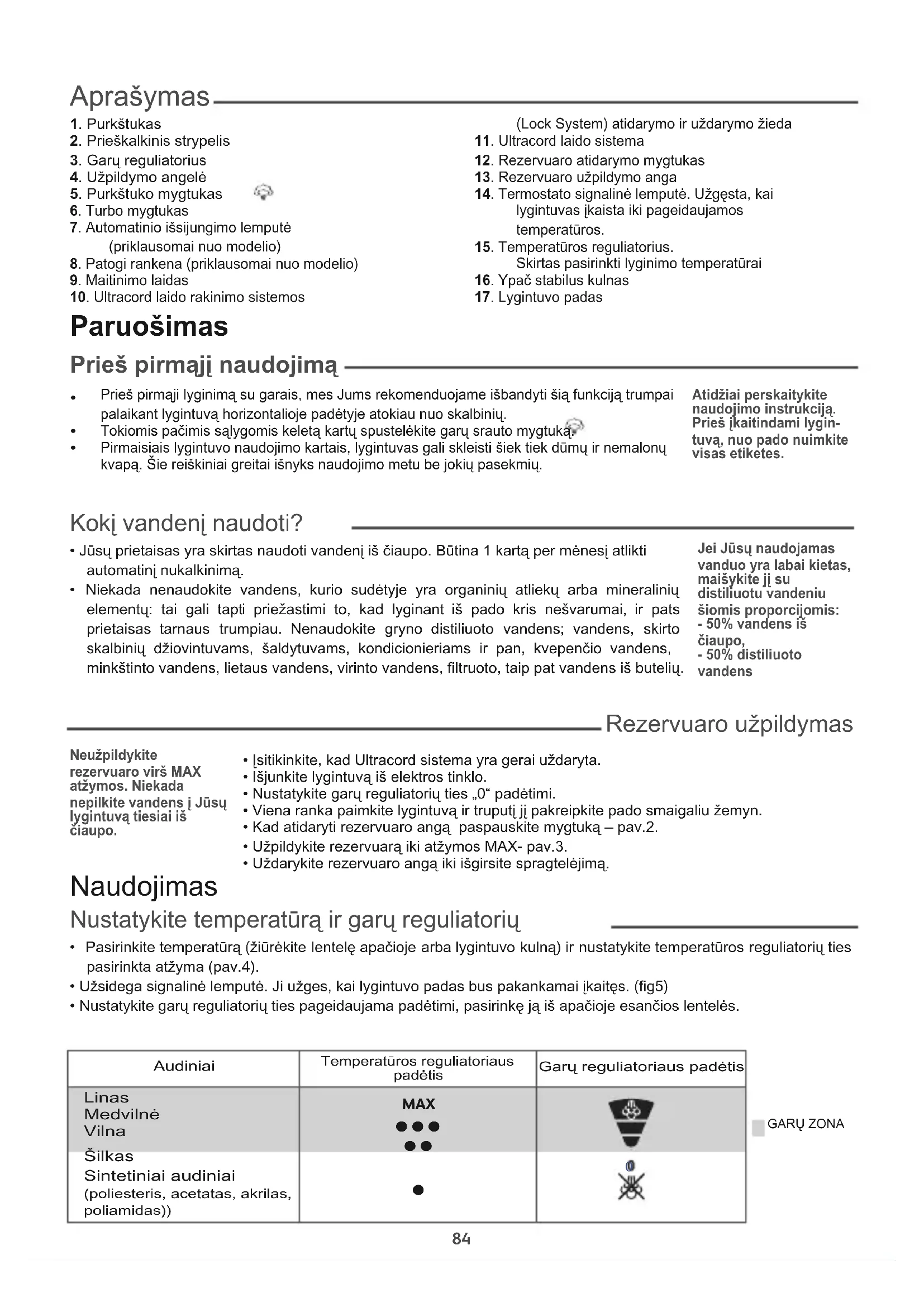 Prieš pirmąji lyginimą su garais, mes Jums rekomenduojame išbandyti šią funkciją trumpaipalaikant lygintuvą horizontalioje padėtyje atokiau nuo skalbinių. Tokiomis pačimis sąlygomis keletą kartų spustelėkite garų srauto mygtuką. Pirmaisiais lygintuvo naudojimo kartais, lygintuvas gali skleisti šiek tiek dūmų ir nemalonųkvapą. Šie reiškiniai greitai išnyks naudojimo metu be jokių pasekmių.Atidžiai perskaitykitenaudojimo instrukciją.Prieš įkaitindami lygin-tuvą, nuo pado nuimkitevisas etiketes. Aprašymas 1. Purkštukas2. Prieškalkinis strypelis 3. Garų reguliatorius4. Užpildymo angelė5. Purkštuko mygtukas 6. Turbo mygtukas7. Automatinio išsijungimo lemputė(priklausomai nuo modelio)8. Patogi rankena (priklausomai nuo modelio)9. Maitinimo laidas10. Ultracord laido rakinimo sistemos(Lock System) atidarymo ir uždarymo žieda11. Ultracord laido sistema12. Rezervuaro atidarymo mygtukas13. Rezervuaro užpildymo anga14. Termostato signalinė lemputė. Užgęsta, kailygintuvas įkaista iki pageidaujamostemperatūros.15. Temperatūros reguliatorius.Skirtas pasirinkti lyginimo temperatūrai16. Ypač stabilus kulnas17. Lygintuvo padas Paruošimas Kokį vandenį naudoti?