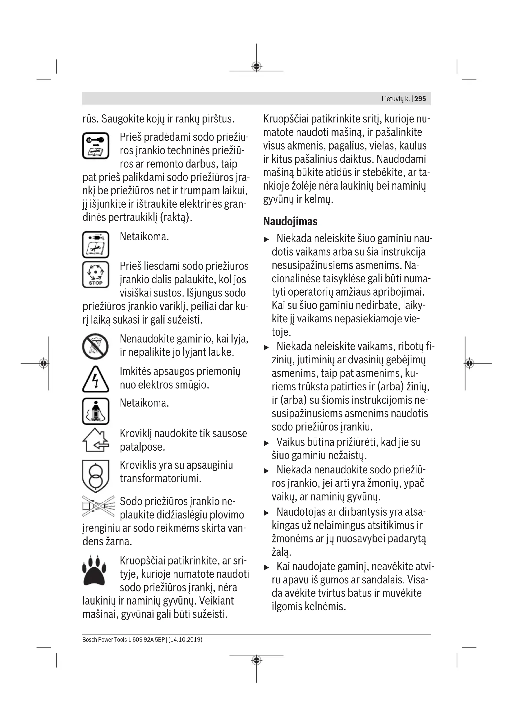 Lai palielinātu instrumenta darbības laiku, ieteicams iegādāties papildu akumulatoru Bosch pilnvarotā dārza instrumentu tehniskās apkalpošanas uzņēmumā. Kļūmju uzmeklēšana un novēršana Simptoms Iespējamais cēlonis Kļūmes novēršana Nedarbojas motors Ir bojāti dārza instrumenta iekšējie savienojumi Griezieties Bosch klientu apkalpošanas uzņēmumā Akumulators ir izlādējies Uzlādējiet akumulatoru Akumulatora temperatūra ir par zemu vai par augstu Nogaidiet, līdz akumulators ir sasilis vai atdzisis 1 609 92A 5BP | (14.10.2019) Bosch Power ToolsLatviešu | 293 Simptoms Iespējamais cēlonis Kļūmes novēršana Zāle ir pārāk gara Maks. pieļaujamais zāles garums ir 30 cm pie lielākā appļaušanas augstuma iestatījuma Ir nostrādājusi motora aizsardzība Ļaujiet dzinējam atdzist un palieliniet appļaušanas augstumu Strāvas ķēdes pārtraucējs nav pareizi vai pilnīgi ievietots instrumentā Ievietojiet pārtraucēju pareizi Dārza instruments darbojas ar pārtraukumiem Ir bojāti dārza instrumenta iekšējie savienojumi Griezieties Bosch klientu apkalpošanas uzņēmumā Ir nostrādājusi motora aizsardzība Ļaujiet dzinējam atdzist un palieliniet appļaušanas augstumu Aiz dārza instrumenta paliek nevienmērīgs pļāvums un/vai motors darbojas smagi Appļaušanas augstums ir pārāk mazs Palieliniet appļaušanas augstumu Asmeņi ir kļuvuši neasi Asmens nomaiņa (attēls J) Iespējams nosprostojums Izslēdziet dārza instrumentu un atvienojiet tā strāvas ķēdes pārtraucēju Pārbaudiet telpu zem dārza instrumenta un vajadzības gadījumā atbrīvojiet asmeni (vienmēr uzvelciet dārznieka aizsargcimdus) Asmens ir nepareizi iestiprināts Iestipriniet asmeni pareizi Pēc dārza instrumenta ieslēgšanas tā asmens negriežas Asmens ir iestrēdzis zālē Izslēdziet dārza instrumentu un atvienojiet tā strāvas ķēdes pārtraucēju Novērsiet nosprostojumu (vienmēr uzvelciet dārznieka aizsargcimdus) Ir vaļīgs asmens stiprinājuma uzgrieznis/skrūve Pieskrūvējiet asmens stiprinājuma uzgriezni/ skrūvi (ar griezes momentu 27Nm) Dārza instruments stipri vibrē un/vai trokšņo Ir vaļīgs asmens stiprinājuma uzgrieznis/skrūve Pieskrūvējiet asmens stiprinājuma uzgriezni/ skrūvi (ar griezes momentu 27Nm) Ir bojāti asmeņi Asmens nomaiņa (attēls J) Akumulators un uzlādes ierīce Pazīme Iespējamais cēlonis Kļūmju novēršana Uz uzlādes ierīces mirgo sarkanais uzlādes indikators Akumulatora uzlāde nenotiek Akumulators nav (pareizi) ievietots uzlādes ierīcē Pareizi ievietojiet akumulatoru uzlādes ierīcē Akumulatora kontakti ir netīri Notīriet akumulatora kontaktus, piemēram, vairākkārt pievienojot akumulatoru uzlādes ierīcei un atvienojot no tās, vai arī nomainiet akumulatoru Akumulators ir bojāts Nomainiet akumulatoru Uzlādes ierīces akumulatora uzlādes indikatori neiedegas Uzlādes ierīces kontaktdakša nav pievienota vai ir slikti pievienota elektrotīkla kontaktligzdai (Līdz galam) iebīdiet uzlādes ierīces kontaktdakšu elektrotīkla kontaktligzdā Ir bojāta elektrotīkla kontaktligzda, elektrokabelis vai uzlādes ierīce Pārbaudiet spriegumu elektrotīkla kontaktligzdā vai nogādājiet uzlādes ierīci pārbaudei Bosch pilnvarotā elektroinstrumentu remonta darbnīcā Apkalpošana un apkope Akumulatora apkope u Uzmanību! Pirms apkalpošanas vai tīrīšanas izslēdziet dārza instrumentu, atvienojiet tā strāvas ķēdes pārtraucēju un izņemiet akumulatoru, kā arī noņemiet zāles savācējtvertni. u Rīkojoties ar asajiem asmeņiem vai strādājot to tuvumā, vienmēr uzvelciet dārznieka aizsargcimdus. Lai nodrošinātu optimālu akumulatora izmantošanu, ievērojiet šādus ieteikumus un veiciet šādas darbības. – Sargājiet akumulatoru no mitruma un ūdens. – Uzglabājiet dārza instrumentu tikai pie temperatūras vērtībām no 20°C līdz 50 °C. Vasaras laikā neatstājiet akumulatoru karstumā, piemēram, automašīnas salonā. Bosch Power Tools 1 609 92A 5BP | (14.10.2019)294 | Lietuvių k. – Uzglabājiet akumulatoru atsevišķi, neievietojot to dārza instrumentā. – Neatstājiet akumulatoru dārza instrumentā, ja tas ir pakļauts tiešai saules staru iedarbībai. – Optimālā temperatūra akumulatora uzglabāšanai ir 5°C. – Laiku pa laikam iztīriet akumulatora ventilācijas atvērumus ar mīkstu, tīru un sausu otu. Ja ievērojami samazinās mērinstrumenta darbības laiks starp divām akumulatora uzlādēm, tas liecina, ka akumulators ir nolietojies un to nepieciešams nomainīt. Klientu apkalpošanas dienests un konsultācijas par lietošanu www.bosch-garden.com Pieprasot konsultācijas un pasūtot rezerves daļas, noteikti paziņojiet 10 zīmju izstrādājuma numuru, kas norādīts uz izstrādājuma marķējuma plāksnītes. Latvijas Republika Robert Bosch SIA Bosch elektroinstrumentu servisa centrs Mūkusalas ielā 97 LV-1004 Rīga Tālr.: 67146262 Telefakss: 67146263 E-pasts: service-pt@lv.bosch.com Pārvietošana Uz izstrādājumam pievienotajiem litija-jonu akumulatoriem attiecas noteikumi par bīstamo kravu pārvadāšanu. Lietotājs var transportēt akumulatorus ielu transporta plūsmā bez papildu nosacījumiem. Ja akumulators tiek pārsūtīts caur trešajām pusēm (piemēram, ar gaisa transporta vai citu transporta aģentūru starpniecību), jāievēro īpaši sūtījuma iesaiņošanas un marķēšanas noteikumi. Tāpēc sūtījuma sagatavošanas laikā jāpieaicina kravu pārvadāšanas speciālists. Pārsūtiet akumulatoru tikai tad, ja tā korpuss nav bojāts. Aizlīmējiet vaļējos akumulatora kontaktus un iesaiņojiet akumulatoru tā, lai tas iesaiņojumā nepārvietotos. Ievērojiet arī ar akumulatoru pārsūtīšanu saistītos nacionālos noteikumus, ja tādi pastāv. Atbrīvošanās no nolietotajiem izstrādājumiem Nolietotais dārza instruments, akumulatori, piederumi un iesaiņojuma materiāli jāpakļauj otrreizējai pārstr