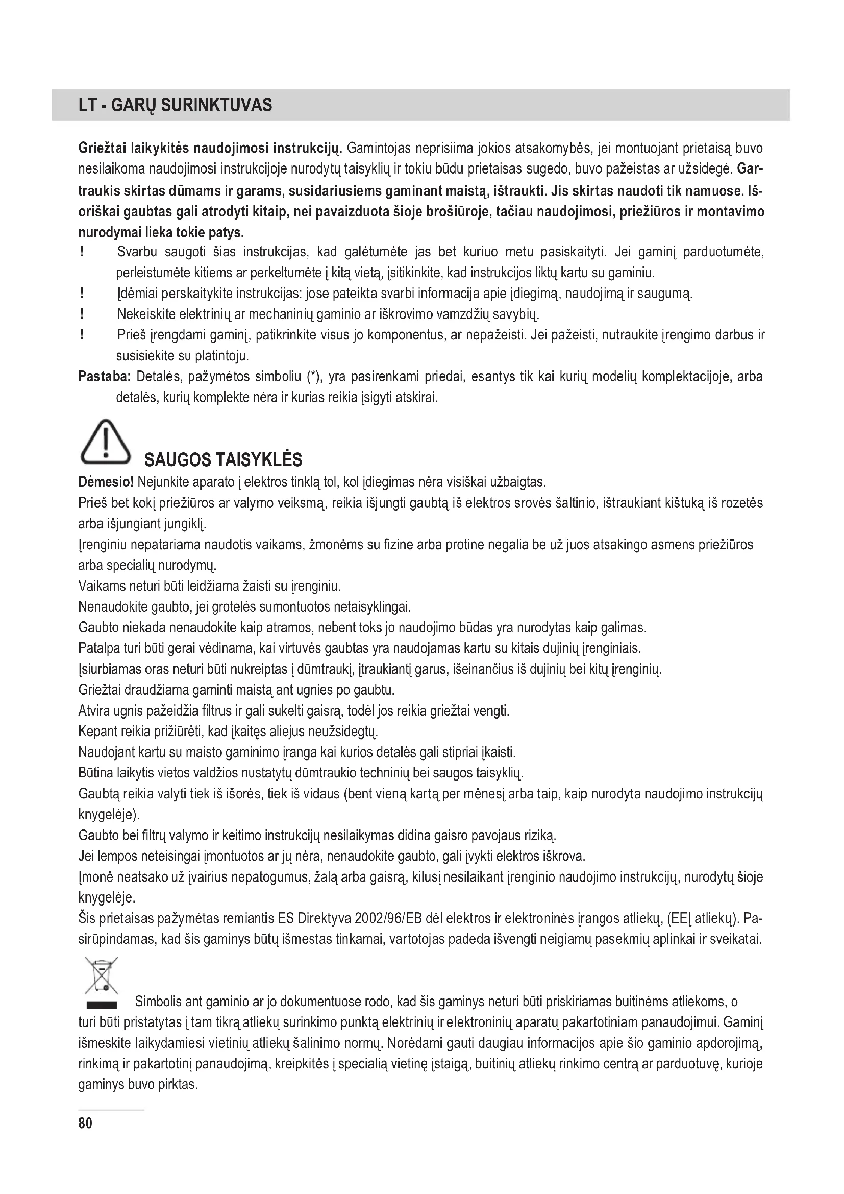 Dėmesio! Nejunkite aparato į elektros tinklą tol, kol įdiegimas nėra visiškai užbaigtas. Prieš bet kokį priežiūros ar valymo veiksmą, reikia išjungti gaubtą iš elektros srovės šaltinio, ištraukiant kištuką iš rozetės arba išjungiant jungiklį. Įrenginiu nepatariama naudotis vaikams, žmonėms su zine arba protine negalia be už juos atsakingo asmens priežiūros arba specialių nurodymų. Vaikams neturi būti leidžiama žaisti su įrenginiu. Nenaudokite gaubto, jei grotelės sumontuotos netaisyklingai. Gaubto niekada nenaudokite kaip atramos, nebent toks jo naudojimo būdas yra nurodytas kaip galimas. Patalpa turi būti gerai vėdinama, kai virtuvės gaubtas yra naudojamas kartu su kitais dujinių įrenginiais. Įsiurbiamas oras neturi būti nukreiptas į dūmtraukį, įtraukiantį garus, išeinančius iš dujinių bei kitų įrenginių. Griežtai draudžiama gaminti maistą ant ugnies po gaubtu. Atvira ugnis pažeidžia ltrus ir gali sukelti gaisrą, todėl jos reikia griežtai vengti. Kepant reikia prižiūrėti, kad įkaitęs aliejus neužsidegtų. Naudojant kartu su maisto gaminimo įranga kai kurios detalės gali stipriai įkaisti. Būtina laikytis vietos valdžios nustatytų dūmtraukio techninių bei saugos taisyklių. Gaubtą reikia valyti tiek iš išorės, tiek iš vidaus (bent vieną kartą per mėnesį arba taip, kaip nurodyta naudojimo instrukcijų knygelėje). Gaubto bei ltrų valymo ir keitimo instrukcijų nesilaikymas didina gaisro pavojaus riziką. Jei lempos neteisingai įmontuotos ar jų nėra, nenaudokite gaubto, gali įvykti elektros iškrova. Įmonė neatsako už įvairius nepatogumus, žalą arba gaisrą, kilusį nesilaikant įrenginio naudojimo instrukcijų, nurodytų šioje knygelėje. Šis prietaisas pažymėtas remiantis ES Direktyva 2002/96/EB dėl elektros ir elektroninės įrangos atliekų, (EEĮ atliekų). Pa- sirūpindamas, kad šis gaminys būtų išmestas tinkamai, vartotojas padeda išvengti neigiamų pasekmių aplinkai ir sveikatai. Simbolis ant gaminio ar jo dokumentuose rodo, kad šis gaminys neturi būti priskiriamas buitinėms atliekoms, o turi būti pristatytas į tam tikrą atliekų surinkimo punktą elektrinių ir elektroninių aparatų pakartotiniam panaudojimui. Gaminį išmeskite laikydamiesi vietinių atliekų šalinimo normų. Norėdami gauti daugiau informacijos apie šio gaminio apdorojimą, rinkimą ir pakartotinį panaudojimą, kreipkitės į specialią vietinę įstaigą, buitinių atliekų rinkimo centrą ar parduotuvę, kurioje gaminys buvo pirktas.81 Prietaisas suprojektuotas, išbandytas ir pagamintas pagal: