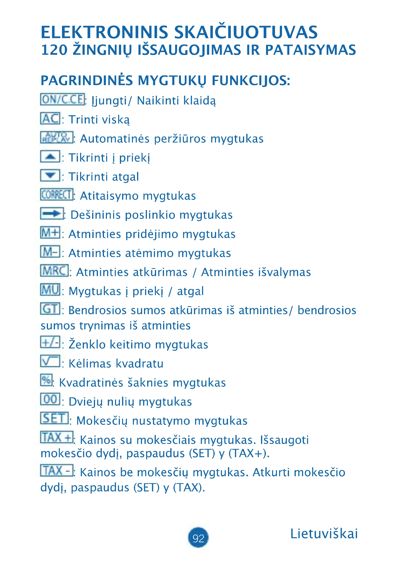 PAGRINDINĖS MYGTUKŲ FUNKCIJOS: : Įjungti/ Naikinti klaidą : Trinti viską : Automatinės peržiūros mygtukas : Tikrinti į priekį : Tikrinti atgal : Atitaisymo mygtukas : Dešininis poslinkio mygtukas : Atminties pridėjimo mygtukas : Atminties atėmimo mygtukas : Atminties atkūrimas / Atminties išvalymas : Mygtukas į priekį / atgal : Bendrosios sumos atkūrimas iš atminties/ bendrosios sumos trynimas iš atminties : Ženklo keitimo mygtukas : Kėlimas kvadratu : Kvadratinės šaknies mygtukas : Dviejų nulių mygtukas : Mokesčių nustatymo mygtukas : Kainos su mokesčiais mygtukas. Išsaugoti mokesčio dydį, paspaudus (SET) y (TAX+). : Kainos be mokesčių mygtukas. Atkurti mokesčio dydį, paspaudus (SET) y (TAX).93 JUNGIKLIO APRAŠYMAS: