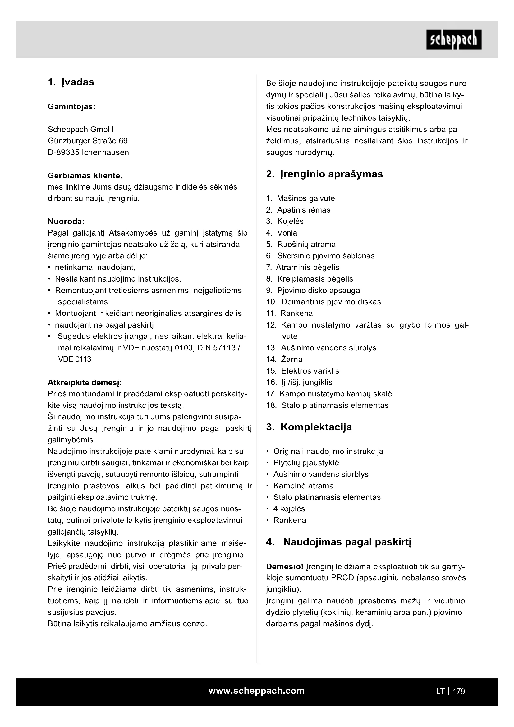 - Sugedus elektros įrangai, nesilaikant elektrai kelia- mai reikalavimų ir VDE nuostatų 0100, DIN 57113 / VDE 0113 Atkreipkite dėmesį: Prieš montuodami ir pradėdami eksploatuoti perskaity- kite visą naudojimo instrukcijos tekstą. Ši naudojimo instrukcija turi Jums palengvinti susipa- žinti su Jūsų įrenginiu ir jo naudojimo pagal paskirtį galimybėmis. Naudojimo instrukcijoje pateikiami nurodymai, kaip su įrenginiu dirbti saugiai, tinkamai ir ekonomiškai bei kaip išvengti pavojų, sutaupyti remonto išlaidų, sutrumpinti įrenginio prastovos laikus bei padidinti patikimumą ir pailginti eksploatavimo trukmę. Be šioje naudojimo instrukcijoje pateiktų saugos nuos- tatų, būtinai privalote laikytis įrenginio eksploatavimui galiojančių taisyklių. Laikykite naudojimo instrukciją plastikiniame maiše- lyje, apsaugoję nuo purvo ir drėgmės prie įrenginio. Prieš pradėdami dirbti, visi operatoriai ją privalo per- skaityti ir jos atidžiai laikytis. Prie įrenginio leidžiama dirbti tik asmenims, instruk- tuotiems, kaip jį naudoti ir informuotiems apie su tuo susijusius pavojus. Būtina laikytis reikalaujamo amžiaus cenzo.www.scheppach.com