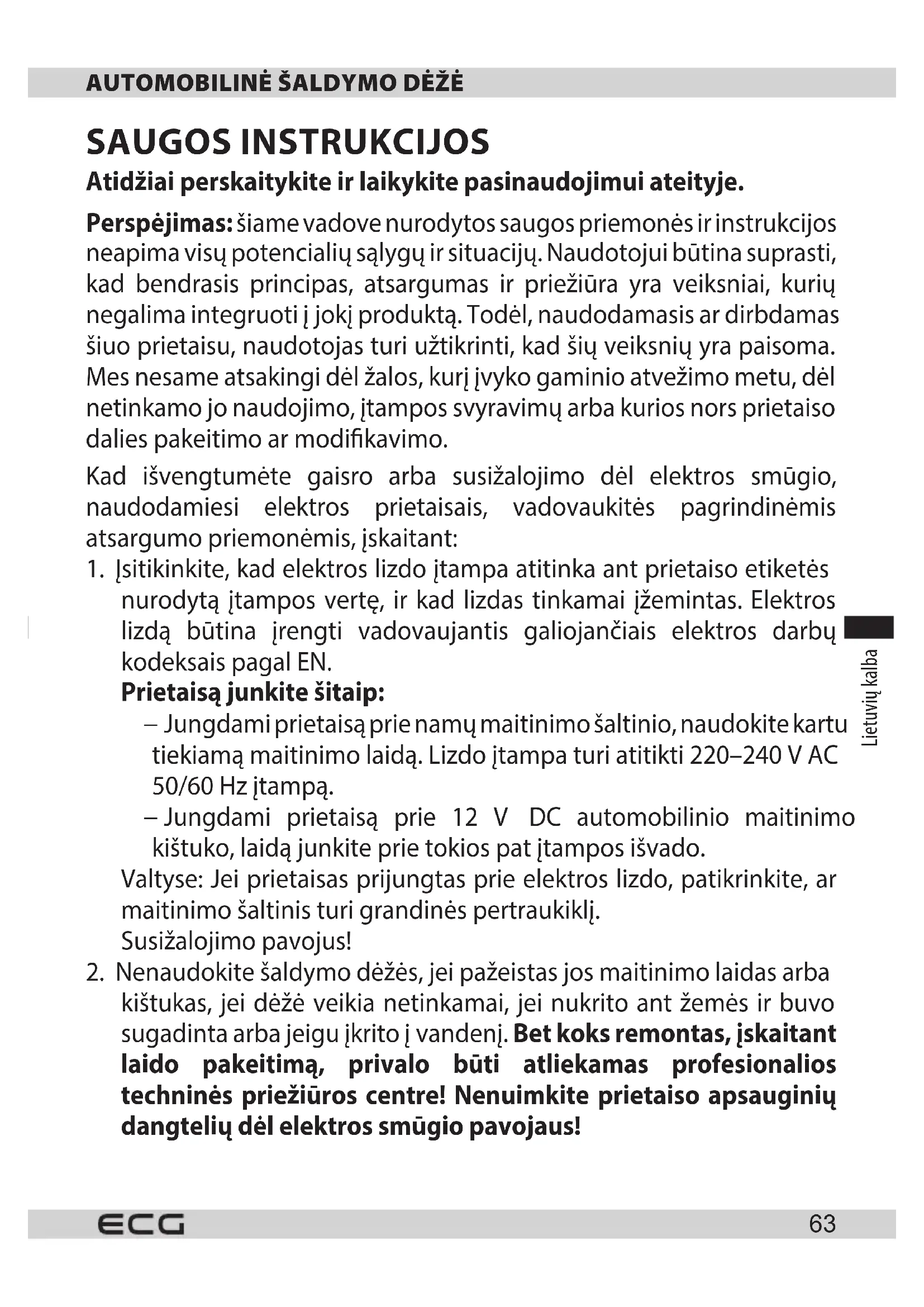 šiame instrukcijų vadove. Ši automobilinė šaldymo dėžė skirta tik namų naudojimui. Gamintojas neatsako už bet kokią žalą, atsiradusią dėl netinkamo šio prietaiso naudojimo.
