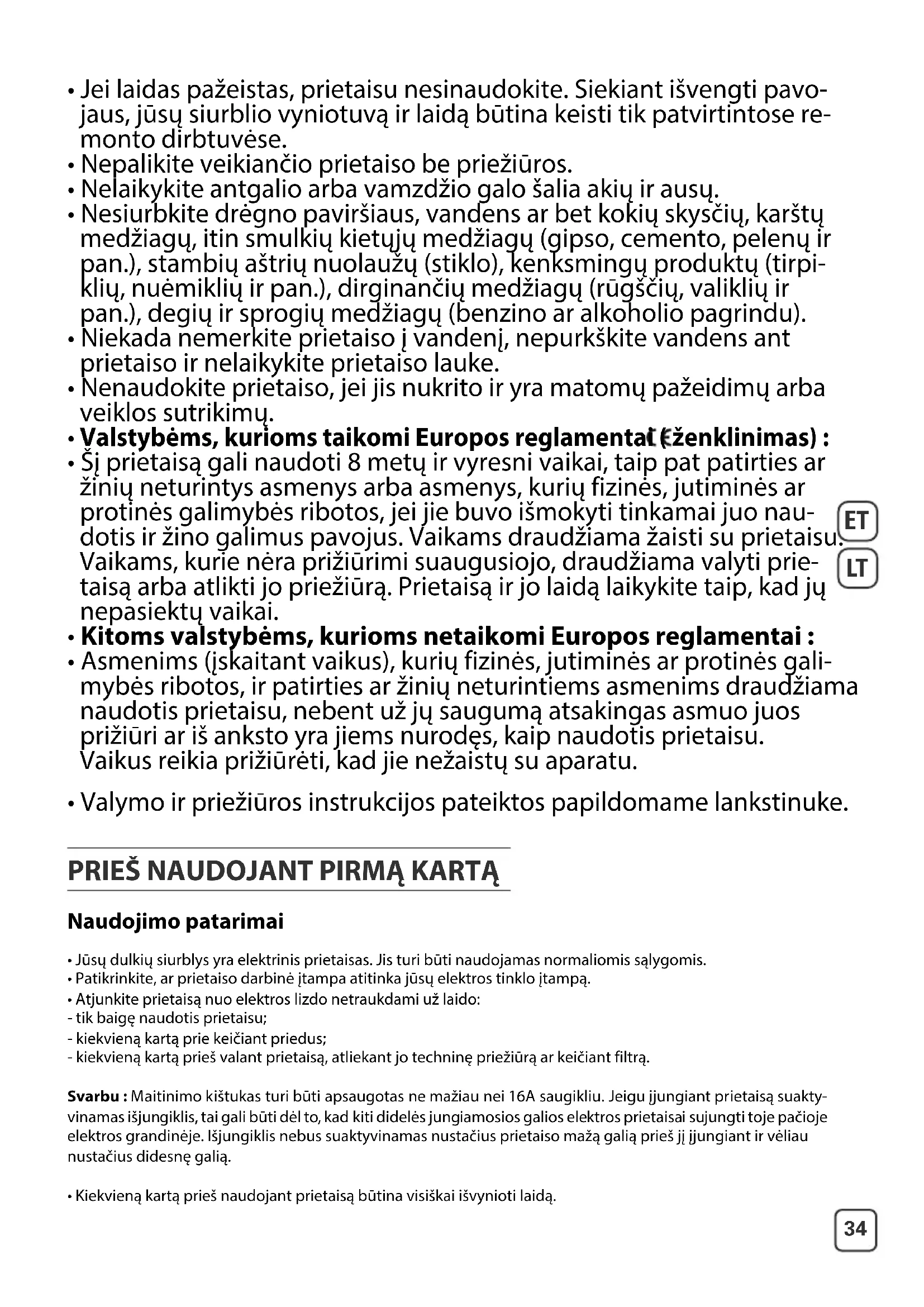 - Jūsų dulkių siurblys yra elektrinis prietaisas. Jis turi būti naudojamas normaliomis sąlygomis.• Patikrinkite, ar prietaiso darbinė įtampa atitinka jūsų elektros tinklo įtampą.• Atjunkite prietaisą nuo elektros lizdo netraukdami už laido:- tik baigę naudotis prietaisu;- kiekvieną kartą prie keičiant priedus;- kiekvieną kartą prieš valant prietaisą, atliekant jo techninę priežiūrą ar keičiant filtrą. Svarbu : Maitinimo kištukas turi būti apsaugotas ne mažiau nei 16A saugikliu. Jeigu įjungiant prietaisą suakty- vinamas išjungiklis, tai gali būti dėl to, kad kiti didelės jungiamosios galios elektros prietaisai sujungti toje pačioje elektros grandinėje. Išjungiklis nebus suaktyvinamas nustačius prietaiso mažą galią prieš jį įjungiant ir vėliaunustačius didesnę galią.• Kiekvieną kartą prieš naudojant prietaisą būtina visiškai išvynioti laidą.