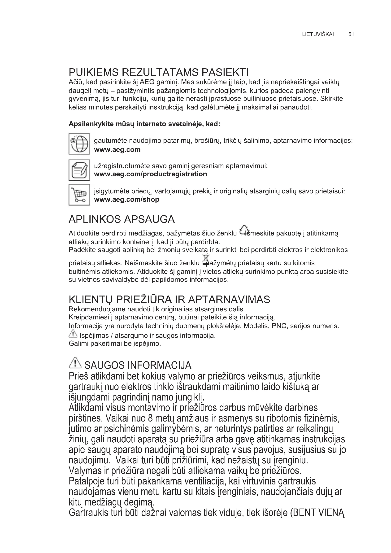 Ačiū, kad pasirinkite šį AEG gaminį. Mes sukūrėme jį taip, kad jis nepriekaištingai veiktų daugelį metų – pasižymintis pažangiomis technologijomis, kurios padeda palengvinti gyvenimą, jis turi funkcijų, kurių galite nerasti įprastuose buitiniuose prietaisuose. Skirkite kelias minutes perskaityti insktrukciją, kad galėtumėte jį maksimaliai panaudoti. Apsilankykite mūsų interneto svetainėje, kad: gautumėte naudojimo patarimų, brošiūrų, trikčių šalinimo, aptarnavimo informacijos: www.aeg.com užregistruotumėte savo gaminį geresniam aptarnavimui: www.aeg.com/productregistration įsigytumėte priedų, vartojamųjų prekių ir originalių atsarginių dalių savo prietaisui: www.aeg.com/shop APLINKOS APSAUGA Atiduokite perdirbti medžiagas, pažymėtas šiuo ženklu . Išmeskite pakuotę į atitinkamą atliekų surinkimo konteinerį, kad ji būtų perdirbta. Padėkite saugoti aplinką bei žmonių sveikatą ir surinkti bei perdirbti elektros ir elektronikos prietaisų atliekas. Neišmeskite šiuo ženklu pažymėtų prietaisų kartu su kitomis buitinėmis atliekomis. Atiduokite šį gaminį į vietos atliekų surinkimo punktą arba susisiekite su vietnos savivaldybe dėl papildomos informacijos.