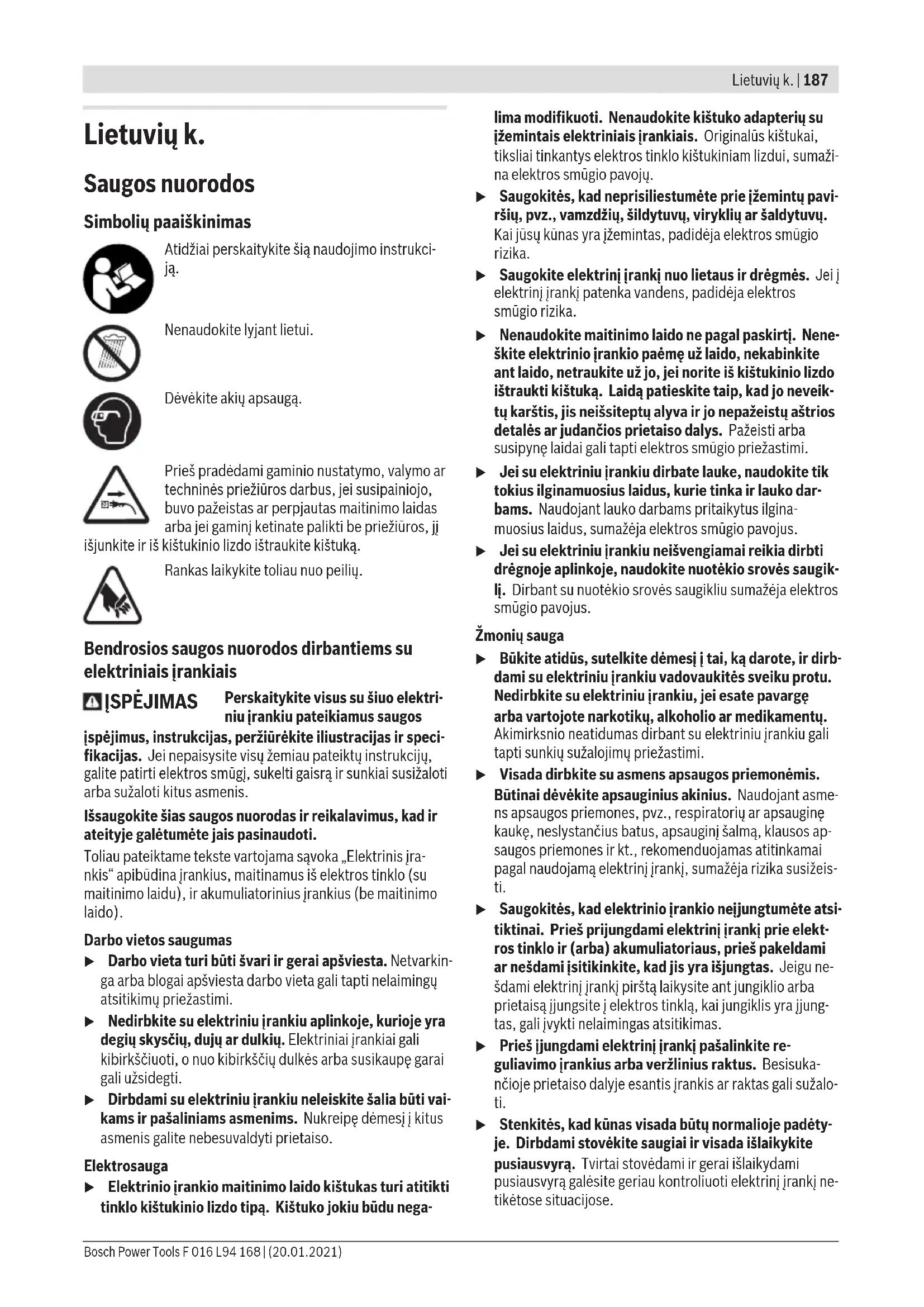 Lietošana u Pievadiet izstrādājumam pareizu elektrotīkla spriegumu! Elektrobarošanas avota spriegumam jāatbilst vērtībai, kas norādīta uz dārza instrumenta marķējuma plāksnītes. Ieslēgšana un izslēgšana (attēli C un D) Lai ieslēgtu dārza instrumentu, vispirms nospiediet ieslēdzēja atbloķ/ēšanas taustiņu (3) un turiet to nospiestu. Pēc tam nospiediet ieslēdzēju (2) un turiet to nospiestu. Lai izslēgtu dārza instrumentu, attlaidiet ieslēdzēja atbloķēšanas taustiņu (3) un pēc tam atlaidiet ieslēdzēju (2). Zāģēšanas funkcija Lai gan zobu atvērums ļauj apgriezt zarus ar diametru līdz Ø20mm, asmeņu vadotnes gala konstrukcija dod iespēju apzāģēt zarus ar diametru līdz Ø25mm. Darbs ar dzīvžoga šķērēm (attēls E) Vienmērīgi pārvietojiet dzīvžoga šķēres uz priekšu pa apgriešanas līniju. Instrumenta asmeņu vadotne ir divpusēja, tāpēc dzīvžogu iespējams apgriezt abos virzienos vai arī strādāt, pārvietojot asmeņu vadotni uz priekšu un atpakaļ. Vispirms apgrieziet dzīvžoga sānu malas un tad apstrādājiet tā augšējo malu. Lai panāktu līdzenas dzīvžoga sānu malas, dzīvžoga apgriešanu ieteicams veikt no apakšas augšup. Ja dzīvžogs tiek apgriezts no augšas lejup, krūmaugu tievākie zari izvirzās ārā no dzīvžoga un tiek apgriezti nelīdzeni, kā rezultātā dzīvžogā veidojas rievas un iekritumi. Lai līdzeni apgrieztu dzīvžoga augšējo malu, novelciet vajadzīgajā augstumā auklu, kas stiepjas gar dzīvžogu visā tā garumā. Pie tam sekojiet, lai netiktu griezti svešķermeņi, piemēram, stieples. Šādā gadījumā var tikt bojāts piedziņas mehānisms. Kļūmju uzmeklēšana Pazīme Iespējamais cēlonis Novēršana Dzīvžoga šķēres nedarbojas Elektrotīklā nav sprieguma Pārbaudiet elektrotīklu un ieslēdziet spriegumu Ir bojāta kontaktligzda Izmantojiet citu kontaktligzdu Bosch Power Tools F 016 L94 168 | (20.01.2021)186 | Latviešu Pazīme Iespējamais cēlonis Novēršana Ir bojāts elektrotīkla kabelis Pārbaudiet elektrotīkla kabeli un, ja tas ir bojāts, griezieties klientu apkalpošanas uzņēmumā Ir bojāts pagarinātājkabelis Pārbaudiet pagarinātājkabeli un nomainiet, ja tas ir bojāts Ir pārdedzis drošinātājs Nomainiet drošinātāju Dzīvžoga šķēres darbojas ar pārtraukumiem Ir bojāti dārza instrumenta iekšējie savienojumi Griezieties klientu apkalpošanas uzņēmumā Ir bojāts ieslēdzējs Griezieties klientu apkalpošanas uzņēmumā Dzinējs darbojas, bet griezējasmens nekustas Kļūme mehānismā Griezieties klientu apkalpošanas uzņēmumā Asmeņi karst Asmens ir kļuvis neass Pieslīpējiet asmeņu vadotni Asmeņos ir izveidojušies robi Pārbaudiet asmeņu vadotnes stāvokli Pārāk liela berze nepietiekošas eļļošanas dēļ Apsmidziniet asmeņu vadotni ar smēreļļu Izstrādājums stipri vibrē un/vai trokšņo Dārza instruments ir bojāts Griezieties klientu apkalpošanas uzņēmumā Apkalpošana un apkope Apkalpošana, tīrīšana un uzglabāšana u Pirms jebkura darba ar izstrādājumu atvienojiet tā kontaktdakšu no elektrotīkla kontaktligzdas. u Lai varētu strādāt droši un efektīvi, uzturiet izstrādājumu tīru. Nenovietojiet uz dārza instrumenta citus priekšmetus. Lai varētu strādāt droši un efektīvi, uzturiet tīru izstrādājumu un jo īpaši tā ventilācijas atveres. Neapsmidziniet izstrādājumu ar ūdeni. Neiegremdējiet izstrādājumu ūdenī. Uzglabājiet izstrādājumu sausā un drošā vietā, kur tam nevar piekļūt bērni. Nenovietojiet uz izstrādājuma citus priekšmetus. Lai būtu iespējams droši strādāt ar dārza instrumentu, pārbaudiet, vai ir stingri pieskrūvēti visi tā uzgriežņi un skrūves. Lai panāktu augstu darba drošību, regulāri pārbaudiet dārza instrumentu un nomainiet tā izdilušās vai bojātās daļas. Nodrošiniet, lai nomaiņai tiktu izmantotas vienīgi oriģinālās rezerves daļas, kas ražotas firmā Bosch. Klientu apkalpošanas dienests un konsultācijas par lietošanu Klientu apkalpošanas dienests atbildēs uz Jūsu jautājumiem par izstrādājumu remontu un apkalpošanu, kā arī par to rezerves daļām. Kopsalikuma attēlus un informāciju par rezerves daļām Jūs varat atrast interneta vietnē: www.bosch-pt.com Bosch konsultantu grupa palīdzēs Jums vislabākajā veidā rast atbildes uz jautājumiem par mūsu izstrādājumiem un to piederumiem. Pieprasot konsultācijas un pasūtot rezerves daļas, noteikti paziņojiet 10 zīmju izstrādājuma numuru, kas norādīts uz izstrādājuma marķējuma plāksnītes. Latvijas Republika Robert Bosch SIA Bosch elektroinstrumentu servisa centrs Mūkusalas ielā 97 LV-1004 Rīga Tālr.: 67146262 Telefakss: 67146263 E-pasts: service-pt@lv.bosch.com Papildu klientu apkalpošanas dienesta adreses skatiet šeit: www.bosch-pt.com/serviceaddresses Atbrīvošanās no nolietotajiem izstrādājumiem Nolietotie dārza instrumenti, to piederumi un iesaiņojuma materiāli jāpakļauj otrreizējai pārstrādei apkārtējai videi nekaitīgā veidā. Neizmetiet nolietotos izstrādājumus sadzīves atkritumu tvertnē! Tikai EK valstīm. Saskaņā ar Eiropas Savienības direktīvu 2012/19/ES par nolietotajām elektriskajām un elektroniskajām ierīcēm un šīs direktīvas atspoguļojumiem nacionālajā likumdošanā, lietošanai nederīgās elektriskās un elektroniskās ierīces jāsavāc atsevišķi un jāpakļauj otrreizējai pārstrādei apkārtējai videi nekaitīgā veidā. F 016 L94 168 | (20.01.2021) Bosch Power ToolsLietuvių k. | 187 Lietuvių k. Saugos nuorodos Simbolių paaiškinimas Atidžiai perskaitykite šią naudojimo instrukci- ją. Nenaudokite lyjant lietui. Dėvėkite akių apsaugą. Prieš pradėdami gaminio nustatymo, valymo ar techninės priežiūros darbus, jei susipainiojo, buvo pažeistas ar perpjautas maitinimo laidas arba jei gaminį ketinate palikti be priežiūros, jį išjunkite ir iš kištukinio