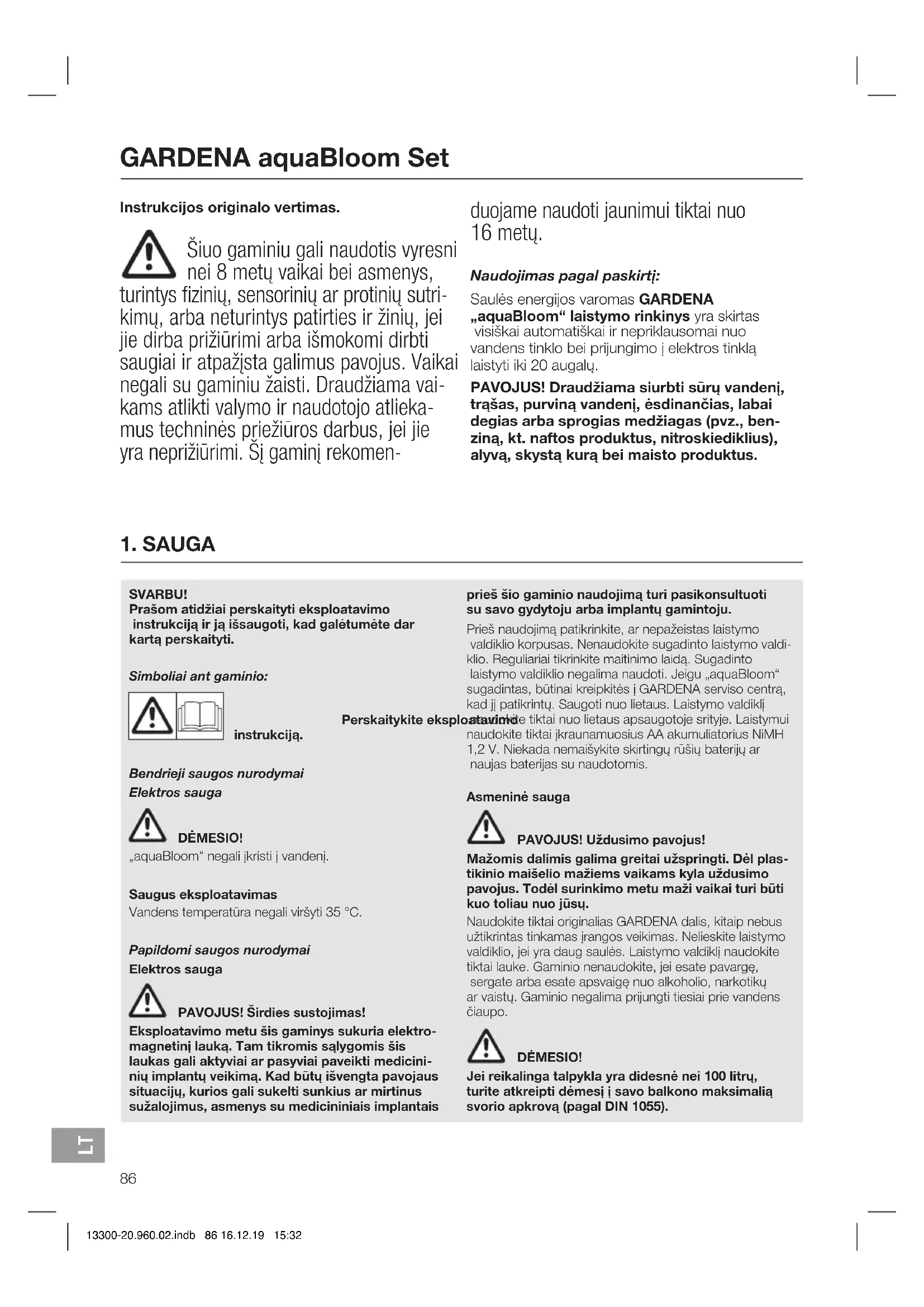 13300-20.960.02.indb 85 16.12.19 15:32Instrukcijos originalo vertimas. Šiuo gaminiu gali naudotis vyresni nei 8 metų vaikai bei asmenys, turintys fizinių, sensorinių ar protinių sutri- kimų, arba neturintys patirties ir žinių, jei jie dirba prižiūrimi arba išmokomi dirbti saugiai ir atpažįsta galimus pavojus. Vaikai negali su gaminiu žaisti. Draudžiama vai- kams atlikti valymo ir naudotojo atlieka- mus techninės priežiūros darbus, jei jie yra neprižiūrimi. Šį gaminį rekomen- duojame naudoti jaunimui tiktai nuo 16metų. Naudojimas pagal paskirtį: Saulės energijos varomas GARDENA „aquaBloom“ laistymo rinkinys yra skirtas visiškai automatiškai ir nepriklausomai nuo vandens tinklo bei prijungimo į elektros tinklą laistyti iki 20 augalų. PAVOJUS! Draudžiama siurbti sūrų vandenį, trąšas, purviną vandenį, ėsdinančias, labai degias arba sprogias medžiagas (pvz., ben- ziną, kt. naftos produktus, nitroskiediklius), alyvą, skystą kurą bei maisto produktus.