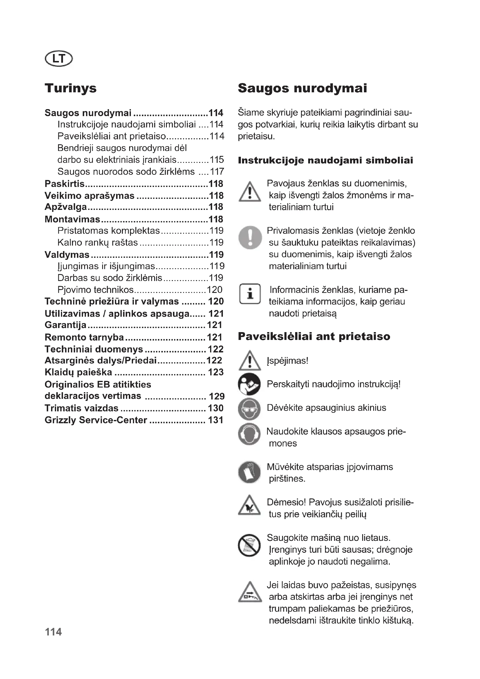 Saugos nurodymai Šiame skyriuje pateikiami pagrindiniai sau- gos potvarkiai, kurių reikia laikytis dirbant su prietaisu. Instrukcijoje naudojami simboliai Pavojaus ženklas su duomenimis, kaip išvengti žalos žmonėms ir ma- terialiniam turtui Privalomasis ženklas (vietoje ženklo su šauktuku pateiktas reikalavimas) su duomenimis, kaip išvengti žalos materialiniam turtui Informacinis ženklas, kuriame pa- teikiama informacijos, kaip geriau naudoti prietaisą Paveikslėliai ant prietaiso Įspėjimas! Perskaityti naudojimo instrukciją! Dėvėkite apsauginius akinius Naudokite klausos apsaugos prie- mones Mūvėkite atsparias įpjovimams pirštines. Dėmesio! Pavojus susižaloti prisilie- tus prie veikiančių peilių Saugokite mašiną nuo lietaus. Įrenginys turi būti sausas; drėgnoje aplinkoje jo naudoti negalima. Jei laidas buvo pažeistas, susipynęs arba atskirtas arba jei įrenginys net trumpam paliekamas be priežiūros, nedelsdami ištraukite tinklo kištuką. Turinys Saugos nurodymai ............................114 Instrukcijoje naudojami simboliai ....114 Paveikslėliai ant prietaiso ................ 114 Bendrieji saugos nurodymai dėl darbo su elektriniais įrankiais