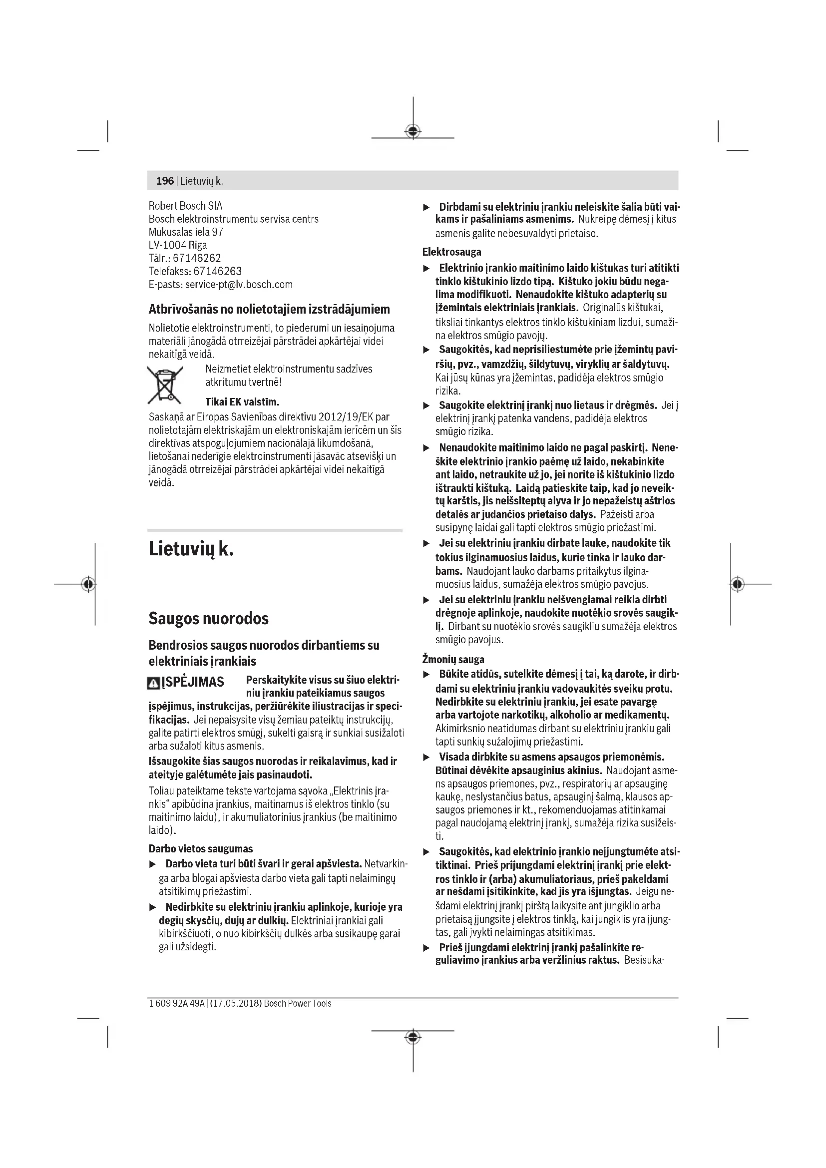 120/400 5/6 Lakas/glazūra 40/80 5/6 Minkštoji mediena 40/240 5/6 Kietoji mediena 60/320 5/6 Medienos lukštas 240/320 5/6 Aliuminis 80/240 5 Plienas 60/240 5 Rūdžių nuo plieno šalinimas 40/120 6 nerūd. plienas 120/240 5 Akmuo 80/200 6 Priežiūra ir servisas Priežiūra ir valymas u Prieš atliekant bet kokius elektrinio įrankio reguliavi- mo ar priežiūros darbus reikia ištraukti kištuką iš elektros tinklo lizdo. u Kad galėtumėte gerai ir saugiai dirbti, pasirūpinkite, kad elektrinis įrankis ir ventiliacinės angos būtų šva- rūs. Jei reikia pakeisti maitinimo laidą, dėl saugumo sumetimų tai turi būti atliekama Bosch įmonėje arba įgaliotose Bosch elektrinių įrankių remonto dirbtuvėse. Klientų aptarnavimo skyrius ir konsultavimo tarnyba Klientų aptarnavimo skyriuje gausite atsakymus į klausimus, susijusius su jūsų gaminio remontu, technine priežiūra bei at- sarginėmis dalimis. Detalius brėžinius ir informacijos apie at- sargines dalis rasite interneto puslapyje: www.bosch-pt.com Bosch konsultavimo tarnybos specialistai mielai pakonsul- tuos Jus apie gaminius ir jų papildomą įrangą. Ieškant informacijos ir užsakant atsargines dalis prašome bū- tinai nurodyti dešimtženklį gaminio numerį, esantį firminėje lentelėje. Lietuva Bosch įrankių servisas Informacijos tarnyba: (037) 713350 ļrankių remontas: (037) 713352 Faksas: (037) 713354 El. paštas: service-pt@lv.bosch.com Šalinimas Elektrinis įrankis, papildoma įranga ir pakuotė yra pagaminti iš medžiagų, tinkančių antriniam perdirbimui, ir vėliau priva- lo būti atitinkamai perdirbti. Nemeskite elektrinių įrankių į buitinių atliekų konteinerius! Tik ES šalims: Pagal Europos direktyvą 2012/19/EB dėl elektros ir elekt- roninės įrangos atliekų ir šios direktyvos perkėlimo į naciona- linę teisę aktus, naudoti nebetinkami elektriniai įrankiai turi būti surenkami atskirai ir perdirbami aplinkai nekenksmingu būdu.