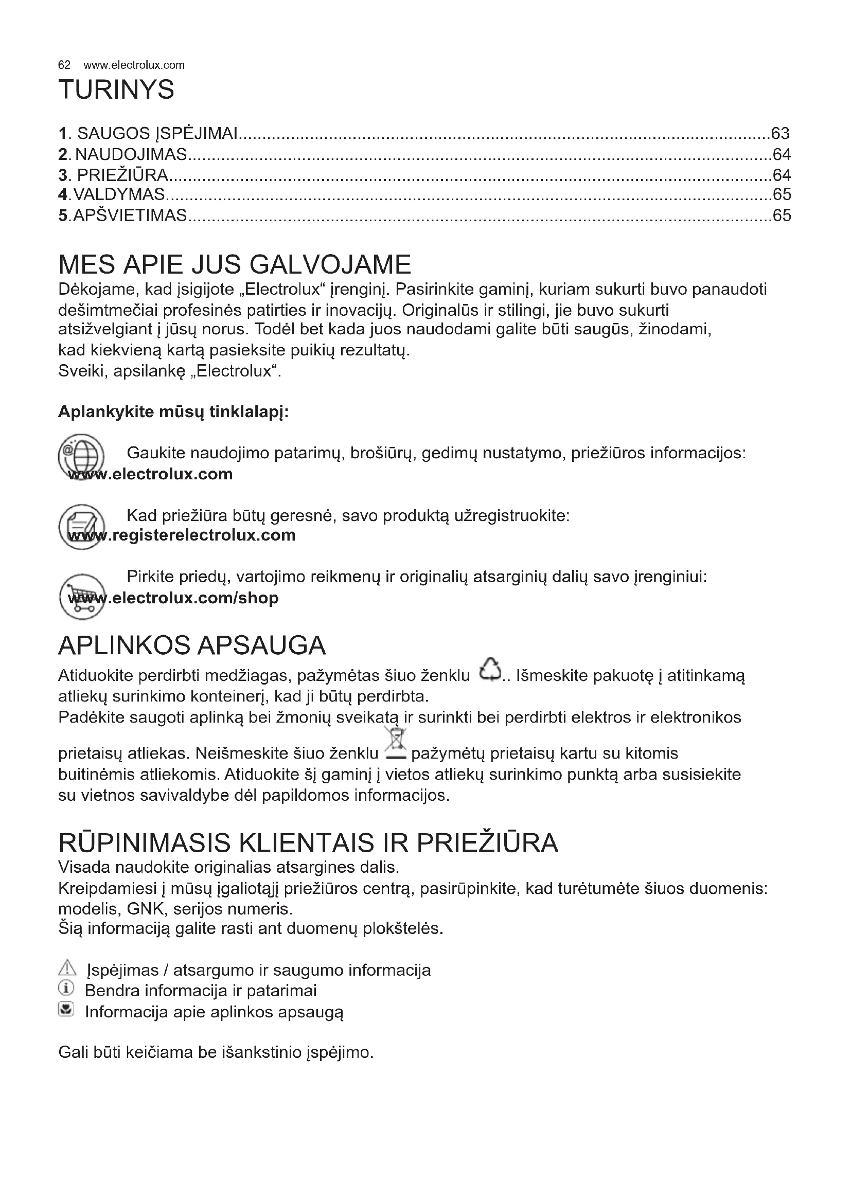 Dėkojame, kad įsigijote „Electrolux“ įrenginį. Pasirinkite gaminį, kuriam sukurti buvo panaudoti dešimtmečiai profesinės patirties ir inovacijų. Originalūs ir stilingi, jie buvo sukurti atsižvelgiant į jūsų norus. Todėl bet kada juos naudodami galite būti saugūs, žinodami, kad kiekvieną kartą pasieksite puikių rezultatų. Sveiki, apsilankę „Electrolux“. Aplankykite mūsų tinklalapį: Gaukite naudojimo patarimų, brošiūrų, gedimų nustatymo, priežiūros informacijos: www.electrolux.com Kad priežiūra būtų geresnė, savo produktą užregistruokite: www.registerelectrolux.com Pirkite priedų, vartojimo reikmenų ir originalių atsarginių dalių savo įrenginiui: www.electrolux.com/shop APLINKOS APSAUGA Atiduokite perdirbti medžiagas, pažymėtas šiuo ženklu .. Išmeskite pakuotę į atitinkamą atliekų surinkimo konteinerį, kad ji būtų perdirbta. Padėkite saugoti aplinką bei žmonių sveikatą ir surinkti bei perdirbti elektros ir elektronikos prietaisų atliekas. Neišmeskite šiuo ženklu pažymėtų prietaisų kartu su kitomis buitinėmis atliekomis. Atiduokite šį gaminį į vietos atliekų surinkimo punktą arba susisiekite su vietnos savivaldybe dėl papildomos informacijos. RŪPINIMASIS KLIENTAIS IR PRIEŽIŪRA Visada naudokite originalias atsargines dalis. Kreipdamiesi į mūsų įgaliotąjį priežiūros centrą, pasirūpinkite, kad turėtumėte šiuos duomenis: modelis, GNK, serijos numeris. Šią informaciją galite rasti ant duomenų plokštelės. Įspėjimas / atsargumo ir saugumo informacija Bendra informacija ir patarimai Informacija apie aplinkos apsaugą Gali būti keičiama be išankstinio įspėjimo.63LIETUVIŠKAI