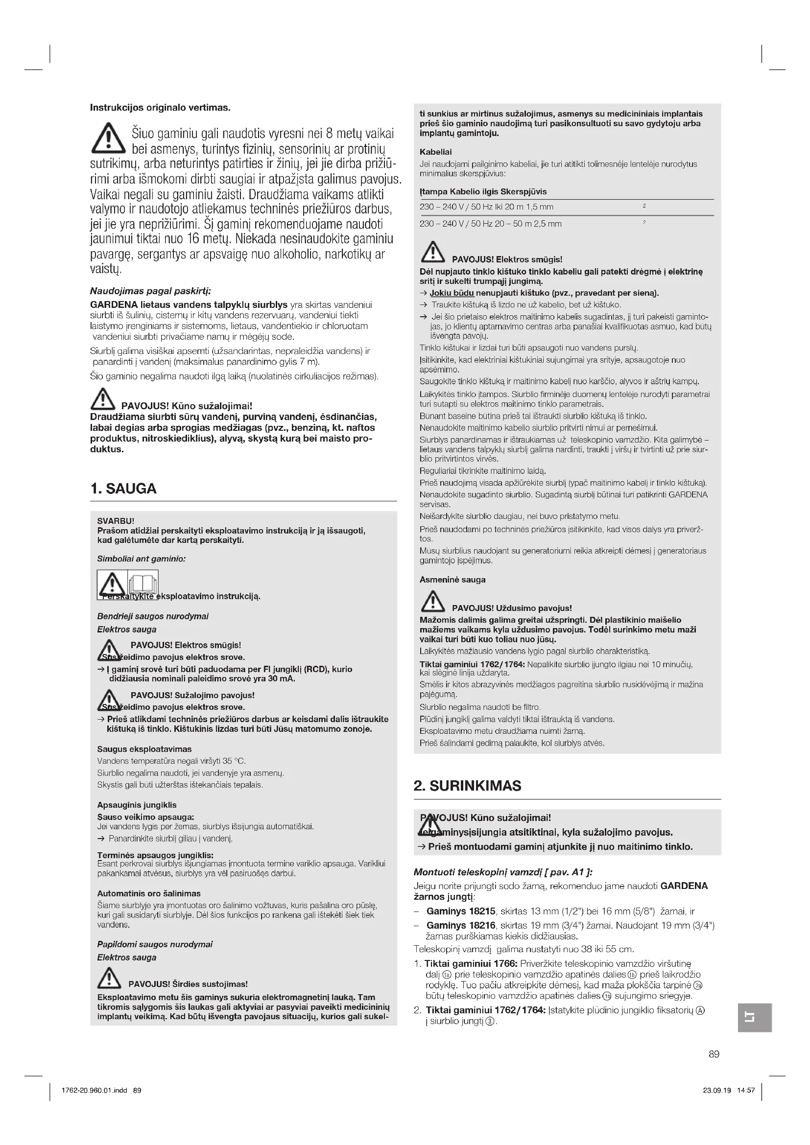 PAVOJUS! Elektros smūgis! Dėl nupjauto tinklo kištuko tinklo kabeliu gali patekti drėgmė į elektrinę sritį ir sukelti trumpąjį jungimą. v Jokiu būdu nenupjauti kištuko (pvz., pravedant per sieną). v Traukite kištuką iš lizdo ne už kabelio, bet už kištuko. v Jei šio prietaiso elektros maitinimo kabelis sugadintas, jį turi pakeisti gaminto- jas, jo klientų aptarnavimo centras arba panašiai kvalifikuotas asmuo, kad būtų išvengta pavojų. Tinklo kištukai ir lizdai turi būti apsaugoti nuo vandens purslų. Įsitikinkite, kad elektriniai kištukiniai sujungimai yra srityje, apsaugotoje nuo apsėmimo. Saugokite tinklo kištuką ir maitinimo kabelį nuo karščio, alyvos ir aštrių kampų. Laikykitės tinklo įtampos. Siurblio firminėje duomenų lentelėje nurodyti parametrai turi sutapti su elektros maitinimo tinklo parametrais. Būnant baseine būtina prieš tai ištraukti siurblio kištuką iš tinklo. Nenaudokite maitinimo kabelio siurblio pritvirti nimui ar pernešimui. Siurblys panardinamas ir ištraukiamas už teleskopinio vamzdžio. Kita galimybė – lietaus vandens talpyklų siurblį galima nardinti, traukti į viršų ir tvirtinti už prie siur- blio pritvirtintos virvės. Reguliariai tikrinkite maitinimo laidą. Prieš naudojimą visada apžiūrėkite siurblį (ypač maitinimo kabelį ir tinklo kištuką). Nenaudokite sugadinto siurblio. Sugadintą siurblį būtinai turi patikrinti GARDENA servisas. Neišardykite siurblio daugiau, nei buvo pristatymo metu. Prieš naudodami po techninės priežiūros įsitikinkite, kad visos dalys yra priverž- tos. Mūsų siurblius naudojant su generatoriumi reikia atkreipti dėmesį į generatoriaus gamintojo įspėjimus. Asmeninė sauga PAVOJUS! Uždusimo pavojus! Mažomis dalimis galima greitai užspringti. Dėl plastikinio maišelio mažiems vaikams kyla uždusimo pavojus. Todėl surinkimo metu maži vaikai turi būti kuo toliau nuo jūsų. Laikykitės mažiausio vandens lygio pagal siurblio charakteristiką. Tiktai gaminiui 1762 / 1764: Nepalikite siurblio įjungto ilgiau nei 10 minučių, kai slėginė linija uždaryta. Smėlis ir kitos abrazyvinės medžiagos pagreitina siurblio nusidėvėjimą ir mažina pajėgumą. Siurblio negalima naudoti be filtro. Plūdinį jungiklį galima valdyti tiktai ištrauktą iš vandens. Eksploatavimo metu draudžiama nuimti žarną. Prieš šalindami gedimą palaukite, kol siurblys atvės. SVARBU! Prašom atidžiai perskaityti eksploatavimo instrukciją ir ją išsaugoti, kad galėtumėte dar kartą perskaityti. Simboliai ant gaminio: Perskaitykite eksploatavimo instrukciją. Bendrieji saugos nurodymai Elektros sauga PAVOJUS! Elektros smūgis! Susižeidimo pavojus elektros srove. v Į gaminį srovė turi būti paduodama per FI jungiklį (RCD), kurio didžiausia nominali paleidimo srovė yra 30 mA. PAVOJUS! Sužalojimo pavojus! Susižeidimo pavojus elektros srove. v Prieš atlikdami techninės priežiūros darbus ar keisdami dalis ištraukite kištuką iš tinklo. Kištukinis lizdas turi būti Jūsų matomumo zonoje. Saugus eksploatavimas Vandens temperatūra negali viršyti 35 °C. Siurblio negalima naudoti, jei vandenyje yra asmenų. Skystis gali būti užterštas ištekančiais tepalais. Apsauginis jungiklis Sauso veikimo apsauga: Jei vandens lygis per žemas, siurblys išsijungia automatiškai. v Panardinkite siurblį giliau į vandenį. Terminės apsaugos jungiklis: Esant perkrovai siurblys išjungiamas įmontuota termine variklio apsauga. Varikliui pakankamai atvėsus, siurblys yra vėl pasiruošęs darbui. Automatinis oro šalinimas Šiame siurblyje yra įmontuotas oro šalinimo vožtuvas, kuris pašalina oro pūslę, kuri gali susidaryti siurblyje. Dėl šios funkcijos po rankena gali ištekėti šiek tiek vandens. Papildomi saugos nurodymai Elektros sauga PAVOJUS! Širdies sustojimas! Eksploatavimo metu šis gaminys sukuria elektromagnetinį lauką. Tam tikromis sąlygomis šis laukas gali aktyviai ar pasyviai paveikti medicininių implantų veikimą. Kad būtų išvengta pavojaus situacijų, kurios gali sukel-