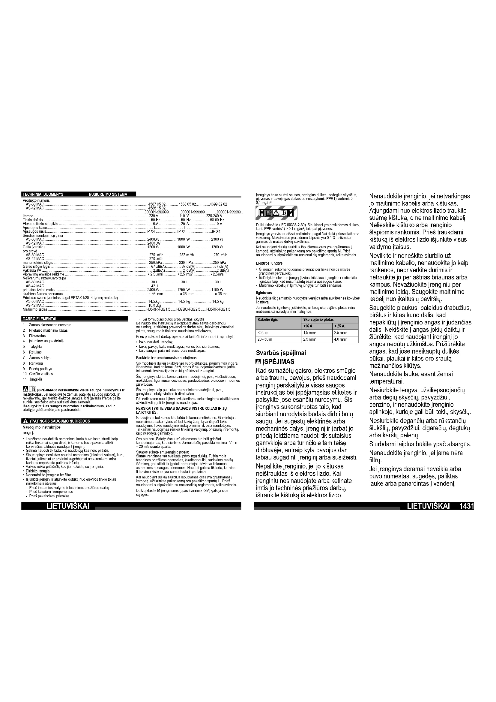 LAIKYKITĖS. Naudojimas bet kuriuo kitu būdu laikomas netinkamu. Gamintojas neprisiima atsakomybės už bet kokią žalą, kylančią dė l tokio naudojimo. Tokio naudojimo riziką prisiima tik pats naudotojas. Tinkamas naudojimas reiškia tinkamą valdymą, priežiūrą ir remontą, kaip nurodyta gamintojo. Oro srautas „Safety Vacuum“ sistemose turi būti griežtai kontroliuojamas, kad siurbimo žarnoje būtų pasiekta minimali Vmin = 20 m/s srauto sparta. Saugos etiketė ant įrenginio įspėja: Šiame įrenginyje yra sveikatai pavojingų dulkių. Tuštinimo ir techninės priežiūros operacijas, įskaitant dulkių surinkimo maišų išėmimą, gali atlikti tik įgalioti darbuotojai, dėvintys tinkamas asmeninės apsaugos priemones. Naudoti galima tik tada, kai visa fi ltravimo sistema yra sumontuota ir patikrinta. Kai naudojant dulkių siurblius išpučiamas oras yra grąžinamas į kambarį, užtikrinkite pakankamą oro pakeitimo spartą H. Prieš naudodami susipažinkite su nacionalinių reglamentų reikalavimais. Dulkių klasės M įrenginiams (tipas žymimas -2M) galioja šios sąlygos: Įrenginys tinka siurbti sausas, nedegias dulkes, nedegius skysčius, pjuvenas ir pavojingas dulkes su nustatytomis PPR1) vertėmis > 0,1 mg/m³ Dulkių klasė M (IEC 60335-2-69). Šiai klasei yra priskiriamos dulkės, kurių PPR vertės1) > 0,1 mg/m³, taip pat pjuvenos. Įrenginys yra visapusiškai patikrintas pagal šiai dulkių klasei taikomą vakuumą. Maksimalus pralaidumo laipsnis yra 0,1 %, o išmetant galimas tik mažas dulkių sukėlimas. Kai naudojant dulkių siurblius išpučiamas oras yra grąžinamas į kambarį, užtikrinkite pakankamą oro pakeitimo spartą M. Prieš naudodami susipažinkite su nacionalinių reglamentų reikalavimais. Elektros jungtys