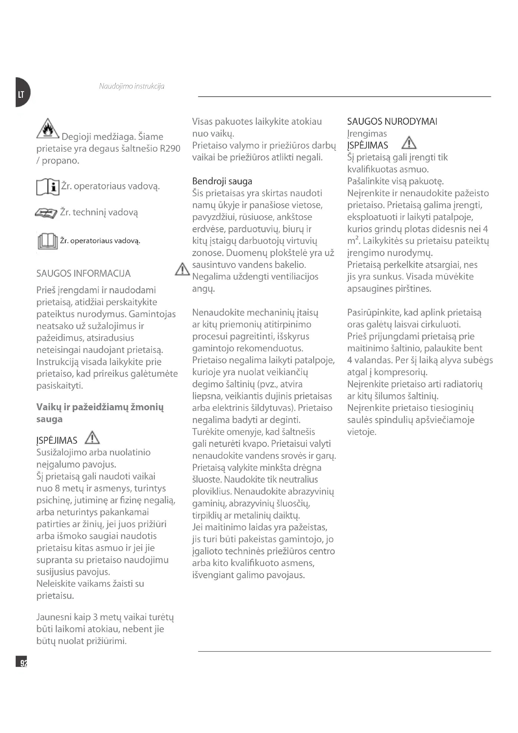 Naudojimo instrukcija Degioji medžiaga. Šiame prietaise yra degaus šaltnešio R290 / propano. Žr. operatoriaus vadovą. Žr. techninį vadovą Žr. operatoriaus vadovą. SAUGOS INFORMACIJA Prieš įrengdami ir naudodami prietaisą, atidžiai perskaitykite pateiktus nurodymus. Gamintojas neatsako už sužalojimus ir pažeidimus, atsiradusius neteisingai naudojant prietaisą. Instrukciją visada laikykite prie prietaiso, kad prireikus galėtumėte pasiskaityti. Vaikų ir pažeidžiamų žmonių sauga ĮSPĖJIMAS Susižalojimo arba nuolatinio neįgalumo pavojus. Šį prietaisą gali naudoti vaikai nuo 8 metų ir asmenys, turintys psichinę, jutiminę ar fizinę negalią, arba neturintys pakankamai patirties ar žinių, jei juos prižiūri arba išmoko saugiai naudotis prietaisu kitas asmuo ir jei jie supranta su prietaiso naudojimu susijusius pavojus. Neleiskite vaikams žaisti su prietaisu. Jaunesni kaip 3 metų vaikai turėtų būti laikomi atokiau, nebent jie būtų nuolat prižiūrimi. Visas pakuotes laikykite atokiau nuo vaikų. Prietaiso valymo ir priežiūros darbų vaikai be priežiūros atlikti negali. Bendroji sauga Šis prietaisas yra skirtas naudoti namų ūkyje ir panašiose vietose, pavyzdžiui, rūsiuose, ankštose erdvėse, parduotuvių, biurų ir kitų įstaigų darbuotojų virtuvių zonose. Duomenų plokštelė yra už sausintuvo vandens bakelio. Negalima uždengti ventiliacijos angų. Nenaudokite mechaninių įtaisų ar kitų priemonių atitirpinimo procesui pagreitinti, išskyrus gamintojo rekomenduotus. Prietaiso negalima laikyti patalpoje, kurioje yra nuolat veikiančių degimo šaltinių (pvz., atvira liepsna, veikiantis dujinis prietaisas arba elektrinis šildytuvas). Prietaiso negalima badyti ar deginti. Turėkite omenyje, kad šaltnešis gali neturėti kvapo. Prietaisui valyti nenaudokite vandens srovės ir garų. Prietaisą valykite minkšta drėgna šluoste. Naudokite tik neutralius ploviklius. Nenaudokite abrazyvinių gaminių, abrazyvinių šluosčių, tirpiklių ar metalinių daiktų. Jei maitinimo laidas yra pažeistas, jis turi būti pakeistas gamintojo, jo įgalioto techninės priežiūros centro arba kito kvalifikuoto asmens, išvengiant galimo pavojaus. SAUGOS NURODYMAI Įrengimas ĮSPĖJIMAS Šį prietaisą gali įrengti tik kvalifikuotas asmuo. Pašalinkite visą pakuotę. Neįrenkite ir nenaudokite pažeisto prietaiso. Prietaisą galima įrengti, eksploatuoti ir laikyti patalpoje, kurios grindų plotas didesnis nei 4 m². Laikykitės su prietaisu pateiktų įrengimo nurodymų. Prietaisą perkelkite atsargiai, nes jis yra sunkus. Visada mūvėkite apsaugines pirštines. Pasirūpinkite, kad aplink prietaisą oras galėtų laisvai cirkuluoti. Prieš prijungdami prietaisą prie maitinimo šaltinio, palaukite bent 4 valandas. Per šį laiką alyva subėgs atgal į kompresorių. Neįrenkite prietaiso arti radiatorių ar kitų šilumos šaltinių. Neįrenkite prietaiso tiesioginių saulės spindulių apšviečiamoje vietoje.LT