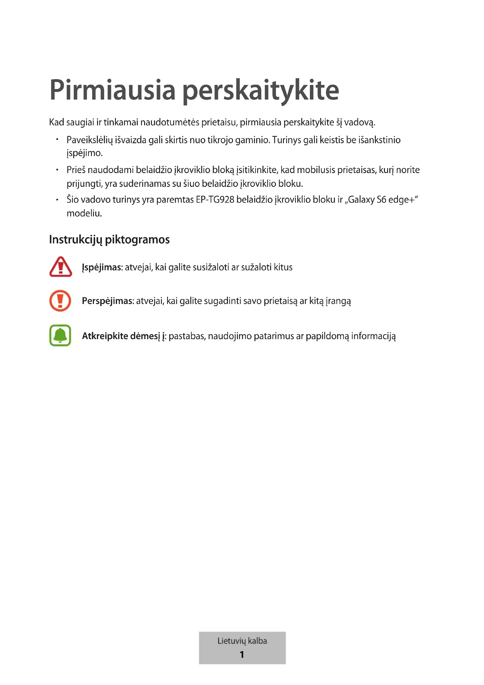Šio vadovo turinys yra paremtas EP-TG928 belaidžio įkroviklio bloku ir „Galaxy S6 edge+“ modeliu. Instrukcijų piktogramos Įspėjimas: atvejai, kai galite susižaloti ar sužaloti kitus Perspėjimas: atvejai, kai galite sugadinti savo prietaisą ar kitą įrangą Atkreipkite dėmesį į: pastabas, naudojimo patarimus ar papildomą informaciją Lietuvių kalba