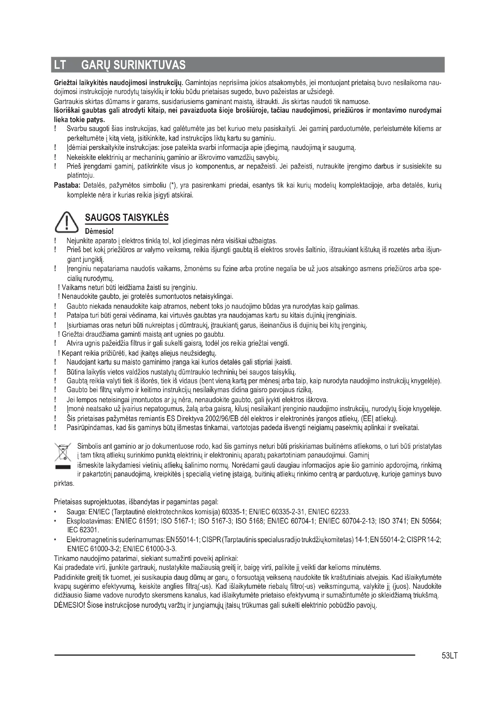 Griežtailaikykitėsnaudojimosiinstrukcijų. Gamintojas neprisiima jokios atsakomybės, jei montuojant prietaisą buvo nesilaikoma nau- dojimosi instrukcijoje nurodytų taisyklių ir tokiu būdu prietaisas sugedo, buvo pažeistas ar užsidegė. Gartraukis skirtas dūmams ir garams, susidariusiems gaminant maistą, ištraukti. Jis skirtas naudoti tik namuose. Išoriškaigaubtasgaliatrodytikitaip,neipavaizduotašiojebrošiūroje,tačiaunaudojimosi,priežiūrosirmontavimonurodymai lieka tokie patys. ! Svarbu saugoti šias instrukcijas, kad galėtumėte jas bet kuriuo metu pasiskaityti. Jei gaminį parduotumėte, perleistumėte kitiems ar perkeltumėte į kitą vietą, įsitikinkite, kad instrukcijos liktų kartu su gaminiu. ! Įdėmiai perskaitykite instrukcijas: jose pateikta svarbi informacija apie įdiegimą, naudojimą ir saugumą. ! Nekeiskite elektrinių ar mechaninių gaminio ar iškrovimo vamzdžių savybių. ! Prieš įrengdami gaminį, patikrinkite visus jo komponentus, ar nepažeisti. Jei pažeisti, nutraukite įrengimo darbus ir susisiekite su platintoju. Pastaba: Detalės, pažymėtos simboliu (*), yra pasirenkami priedai, esantys tik kai kurių modelių komplektacijoje, arba detalės, kurių komplekte nėra ir kurias reikia įsigyti atskirai. SAUGOSTAISYKLĖS Dėmesio! ! Nejunkite aparato į elektros tinklą tol, kol įdiegimas nėra visiškai užbaigtas. ! Prieš bet kokį priežiūros ar valymo veiksmą, reikia išjungti gaubtą iš elektros srovės šaltinio, ištraukiant kištuką iš rozetės arba išjun- giant jungiklį. ! Įrenginiu nepatariama naudotis vaikams, žmonėms su zine arba protine negalia be už juos atsakingo asmens priežiūros arba spe- cialių nurodymų. ! Vaikams neturi būti leidžiama žaisti su įrenginiu. ! Nenaudokite gaubto, jei grotelės sumontuotos netaisyklingai. ! Gaubto niekada nenaudokite kaip atramos, nebent toks jo naudojimo būdas yra nurodytas kaip galimas. ! Patalpa turi būti gerai vėdinama, kai virtuvės gaubtas yra naudojamas kartu su kitais dujinių įrenginiais. ! Įsiurbiamas oras neturi būti nukreiptas į dūmtraukį, įtraukiantį garus, išeinančius iš dujinių bei kitų įrenginių. ! Griežtai draudžiama gaminti maistą ant ugnies po gaubtu. ! Atvira ugnis pažeidžia ltrus ir gali sukelti gaisrą, todėl jos reikia griežtai vengti. ! Kepant reikia prižiūrėti, kad įkaitęs aliejus neužsidegtų. ! Naudojant kartu su maisto gaminimo įranga kai kurios detalės gali stipriai įkaisti. ! Būtina laikytis vietos valdžios nustatytų dūmtraukio techninių bei saugos taisyklių. ! Gaubtą reikia valyti tiek iš išorės, tiek iš vidaus (bent vieną kartą per mėnesį arba taip, kaip nurodyta naudojimo instrukcijų knygelėje). ! Gaubto bei ltrų valymo ir keitimo instrukcijų nesilaikymas didina gaisro pavojaus riziką. ! Jei lempos neteisingai įmontuotos ar jų nėra, nenaudokite gaubto, gali įvykti elektros iškrova. ! Įmonė neatsako už įvairius nepatogumus, žalą arba gaisrą, kilusį nesilaikant įrenginio naudojimo instrukcijų, nurodytų šioje knygelėje. ! Šis prietaisas pažymėtas remiantis ES Direktyva 2002/96/EB dėl elektros ir elektroninės įrangos atliekų, (EEĮ atliekų). ! Pasirūpindamas, kad šis gaminys būtų išmestas tinkamai, vartotojas padeda išvengti neigiamų pasekmių aplinkai ir sveikatai. Simbolis ant gaminio ar jo dokumentuose rodo, kad šis gaminys neturi būti priskiriamas buitinėms atliekoms, o turi būti pristatytas į tam tikrą atliekų surinkimo punktą elektrinių ir elektroninių aparatų pakartotiniam panaudojimui. Gaminį išmeskite laikydamiesi vietinių atliekų šalinimo normų. Norėdami gauti daugiau informacijos apie šio gaminio apdorojimą, rinkimą ir pakartotinį panaudojimą, kreipkitės į specialią vietinę įstaigą, buitinių atliekų rinkimo centrą ar parduotuvę, kurioje gaminys buvo pirktas. Prietaisas suprojektuotas, išbandytas ir pagamintas pagal: