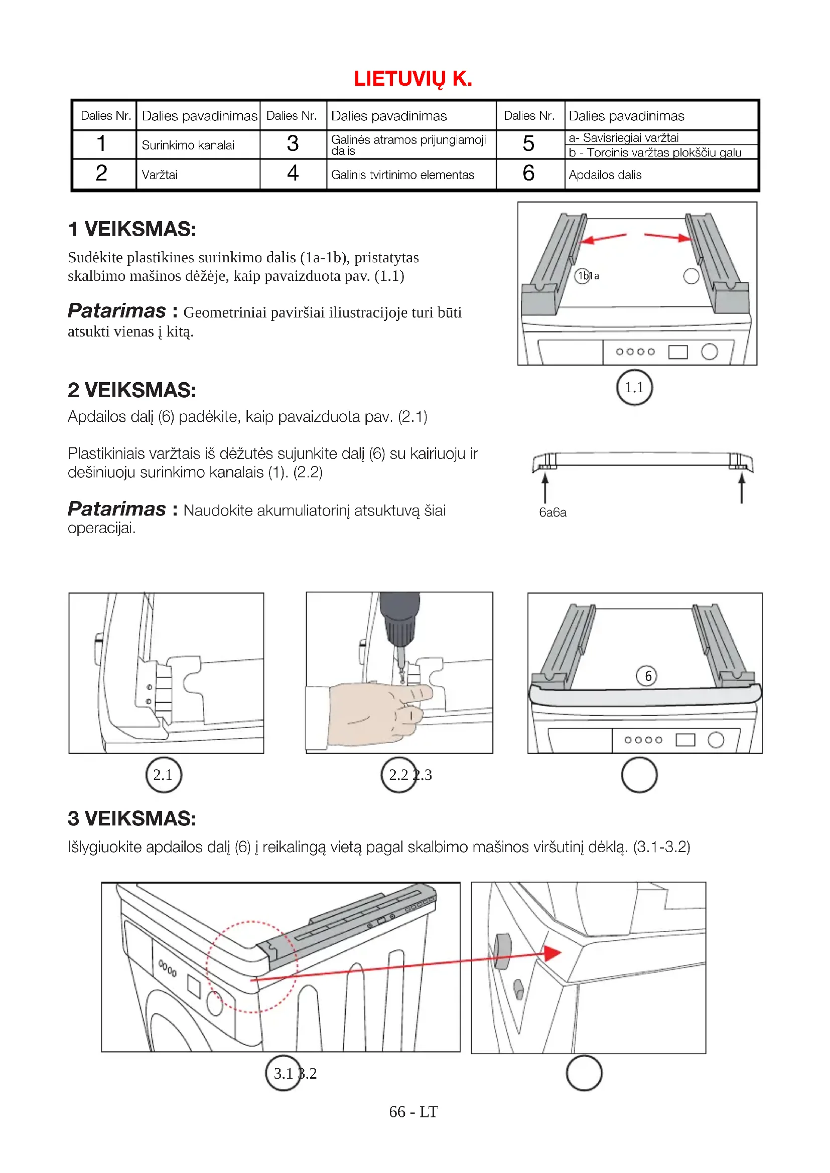 Elektrické šroubováky použijte pouze v případě šroubových spojů. 4a66 - LT 1 VEIKSMAS: Sudėkite plastikines surinkimo dalis (1a-1b), pristatytas skalbimo mašinos dėžėje, kaip pavaizduota pav. (1.1) Patarimas : Geometriniai paviršiai iliustracijoje turi būti atsukti vienas į kitą. 2 VEIKSMAS: Apdailos dalį (6) padėkite, kaip pavaizduota pav. (2.1) Plastikiniais varžtais iš dėžutės sujunkite dalį (6) su kairiuoju ir dešiniuoju surinkimo kanalais (1). (2.2) Patarimas : Naudokite akumuliatorinį atsuktuvą šiai operacijai. 3 VEIKSMAS: Išlygiuokite apdailos dalį (6) į reikalingą vietą pagal skalbimo mašinos viršutinį dėklą. (3.1-3.2) Dalies Nr.Dalies pavadinimas Surinkimo kanalai VaržtaiDalies Nr.Dalies pavadinimas Galinės atramos prijungiamoji dalis Galinis tvirtinimo elementasDalies Nr.Dalies pavadinimas a- Savisriegiai varžtaib - Torcinis varžtas plokščiu galu Apdailos dalis1b 1a 6a 6a