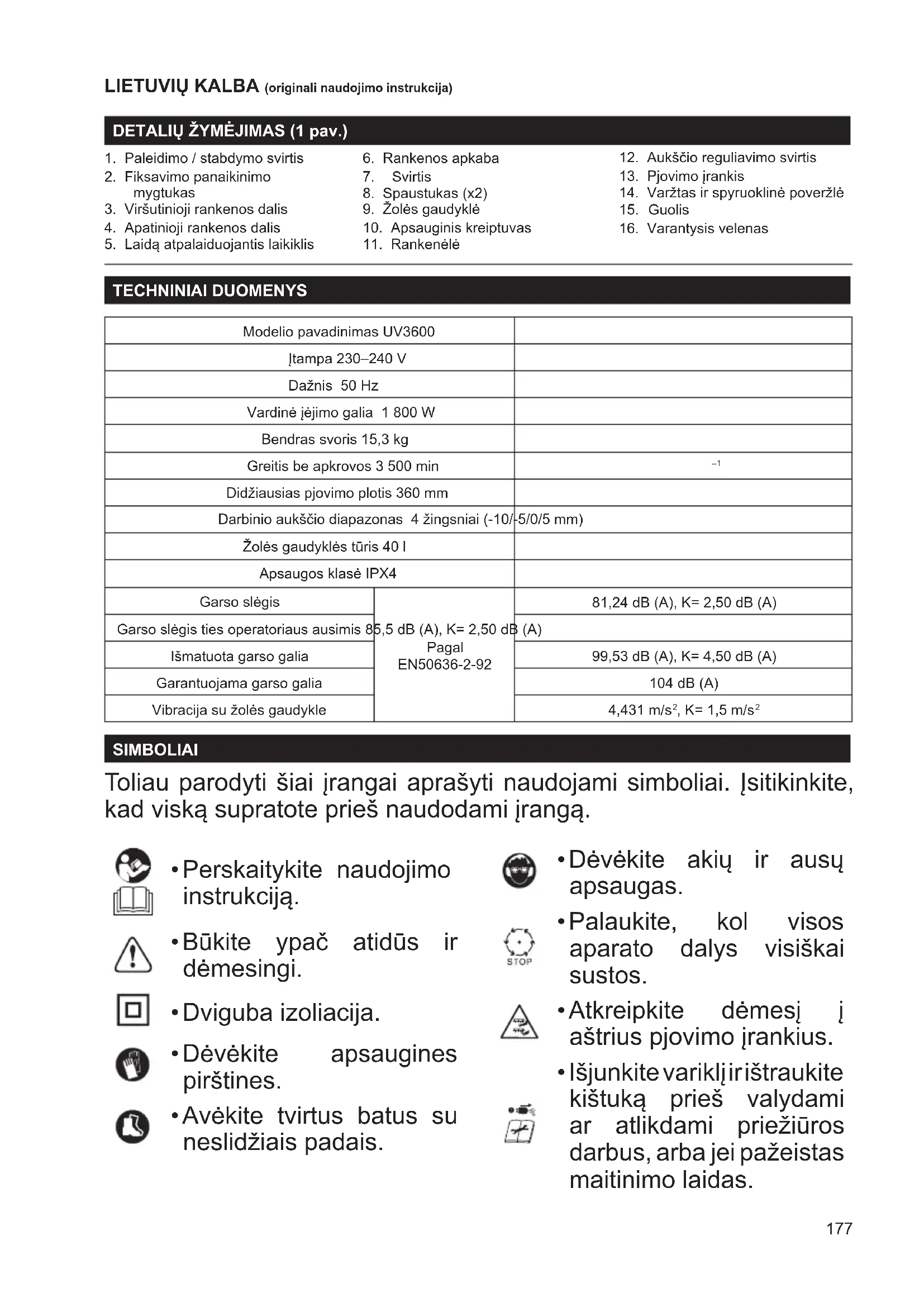 TECHNINIAI DUOMENYS Modelio pavadinimas UV3600 Įtampa 230–240 V Dažnis 50 Hz Vardinė įėjimo galia 1 800 W Bendras svoris 15,3 kg Greitis be apkrovos 3 500 min