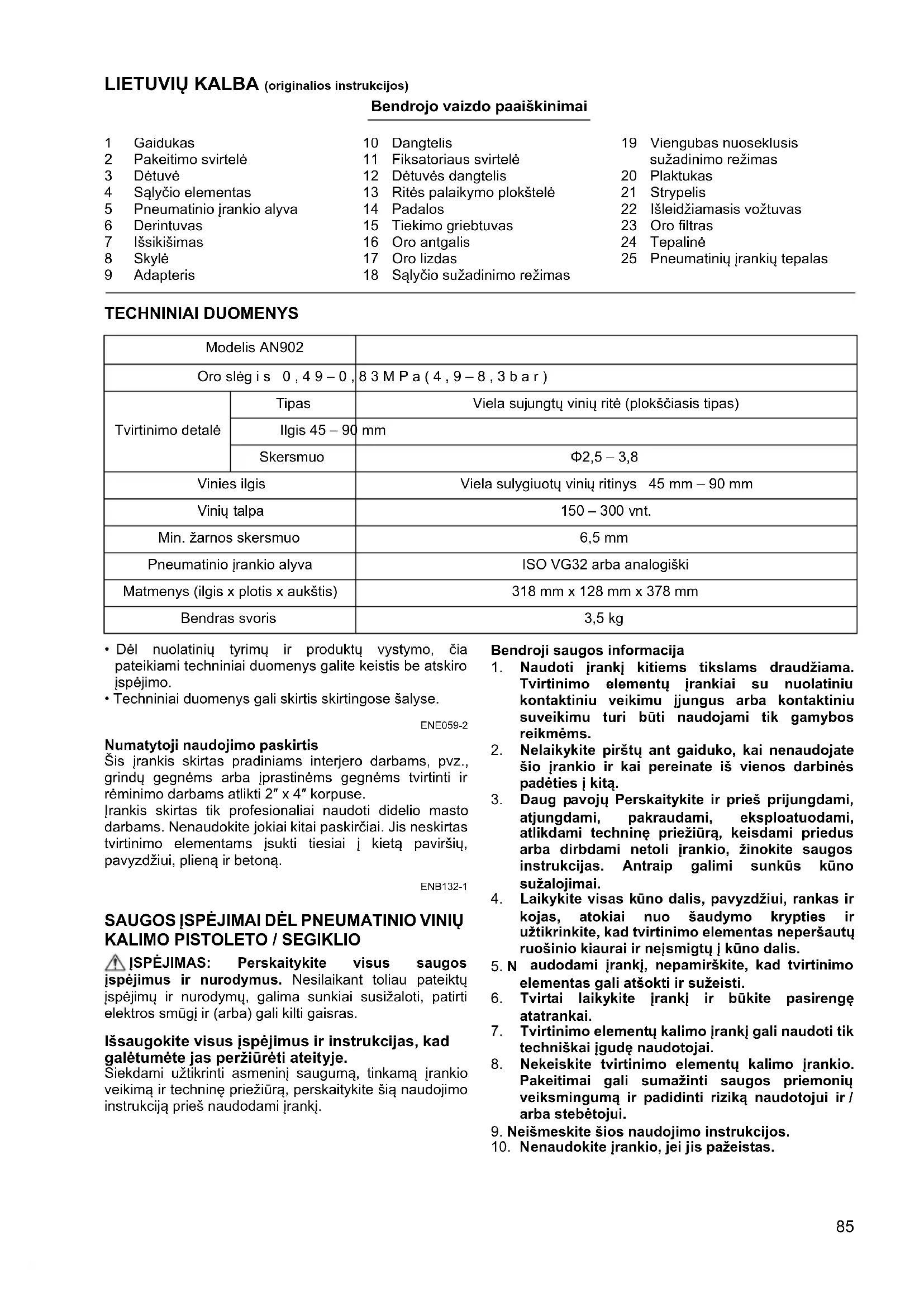- Techniniai duomenys gali skirtis skirtingose šalyse. ENE059-2 Numatytoji naudojimo paskirtis Šis įrankis skirtas pradiniams interjero darbams, pvz., grindų gegnėms arba įprastinėms gegnėms tvirtinti ir rėminimo darbams atlikti 2″ x 4″ korpuse. Įrankis skirtas tik profesionaliai naudoti didelio masto darbams. Nenaudokite jokiai kitai paskirčiai. Jis neskirtas tvirtinimo elementams įsukti tiesiai į kietą paviršių, pavyzdžiui, plieną ir betoną. ENB132-1 SAUGOS ĮSPĖJIMAI DĖL PNEUMATINIO VINIŲ