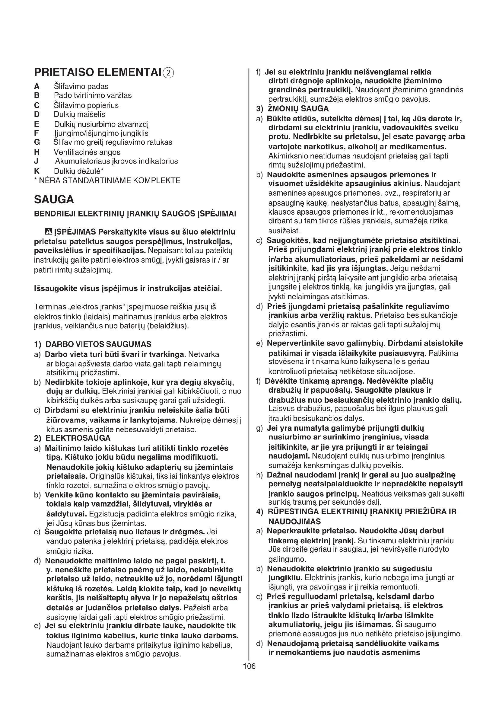 NAUDOJIMAS a) Neperkraukite prietaiso. Naudokite Jūsų darbui tinkamą elektrinį įrankį. Su tinkamu elektriniu įrankiu Jūs dirbsite geriau ir saugiau, jei neviršysite nurodyto galingumo. b) Nenaudokite elektrinio įrankio su sugedusiu jungikliu. Elektrinis įrankis, kurio nebegalima įjungti ar išjungti, yra pavojingas ir jį reikia remontuoti. c) Prieš reguliuodami prietaisą, keisdami darbo įrankius ar prieš valydami prietaisą, iš elektros tinklo lizdo ištraukite kištuką ir/arba išimkite akumuliatorių, jeigu jis išimamas. Ši saugumo priemonė apsaugos jus nuo netikėto prietaiso įsijungimo. d) Nenaudojamą prietaisą sandėliuokite vaikams ir nemokantiems juo naudotis asmenims PRIETAISO ELEMENTAI