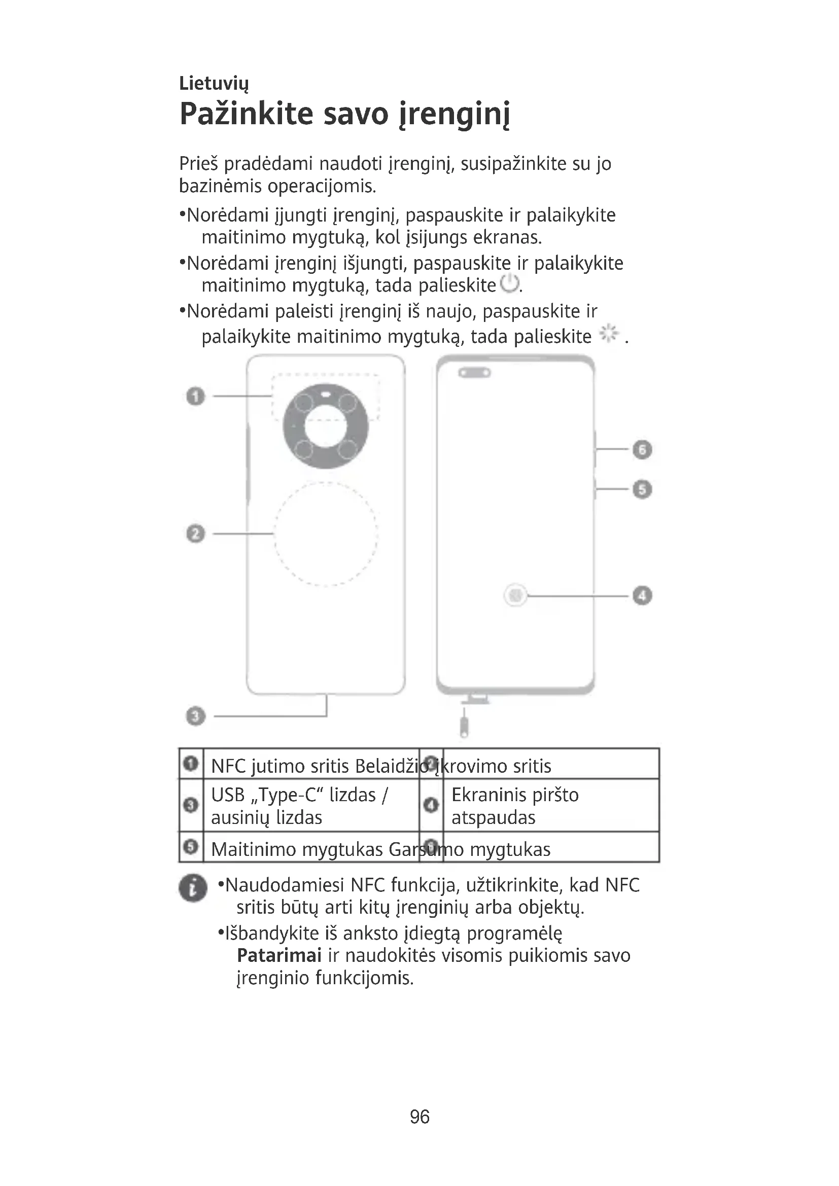 - Jūsų įrenginys buvo išbandytas kontroliuojamoje aplinkoje ir patvirtintas kaip atsparus aptaškymui, vandeniui ir dulkėms tam tikrose situacijose (atitinka IP68 klasikacijos reikalavimus, kaip apibūdina tarptautinis standartas IEC 60529). Atsparumas aptaškymui, vandeniui ir dulkėms nėra nuolatinė charakteristika ir dėl įprasto dėvėjimosi gali sumažėti. Nekraukite įrenginio drėgnomis sąlygomis. Išsamų šios funkcijos aprašymą rasite apsilankę https://consumer.huawei.com/en/support. Informacija apie atliekų tvarkymą ir perdirbimą Ant gaminio, akumuliatoriaus, literatūroje arba ant pakuotės pateiktas simbolis reiškia, kad gaminiai ir akumuliatoriai eksploatacijos pabaigoje turi būti nugabenti į savivaldybės nurodytą atskirą atliekų surinkimo vietą. Tokiu būdu bus užtikrinta, kad EEĮ atliekos būtų tinkamai perdirbtos ir tvarkomos tausojant vertingus medžiagų išteklius, saugant žmonių sveikatą ir aplinką. Daugiau informacijos gausite kreipęsi į savivaldybę, mažmenininką ar buitinių atliekų tvarkymo tarnybą, taip pat – apsilankę interneto svetainėje https://consumer.huawei.com/en/. Pavojingų medžiagų kiekio mažinimas Šis įrenginys ir jo elektriniai priedai dera su vietoje galiojančiomis taisyklėmis dėl tam tikrų pavojingų medžiagų naudojimo elektros ir elektroninėje įrangoje apribojimo, pvz., ES REACH reglamentu, PMNA ir akumuliatorių (jei yra) direktyvomis. Atitikties REACH ir 100PMNA reikalavimams deklaracijas rasite svetainėje https://consumer.huawei.com/certication. Radijo dažnių poveikio informacija Pasaulio sveikatos organizacija yra paskelbusi, kad poveikį galima sumažinti apribojant naudojimą arba tiesiog naudojantis laisvųjų rankų įranga, kad įrenginys būtų laikomas toliau nuo galvos ir kūno. Įsitikinkite, kad įrenginio prieduose, pvz., jo dėkle ar laikiklyje, nėra metalinių komponentų. Laikykite įrenginį nurodytu atstumu nuo kūno. Skirta šalims, kuriose priimtas SAR 2,0 W/kg (10 gramų audinio) apribojimas. Šis įrenginys atitinka radijo dažnių specikacijas, naudojant jį prie ausies arba 0,50 cm atstumu nuo kūno. Didžiausia užregistruota SAR vertė: SAR prie galvos: 0,49 W/kg; SAR kūnui: 0,99 W/kg. Atitiktis ES reglamentams Pareiškimas Šiuo dokumentu „Huawei Device Co., Ltd.“ pareiškia, kad įrenginys NOH-NX9 atitinka direktyvas RED 2014/53/ES, PMNA 2011/65/ES ir ErP 2009/125/EB. Visą ES atitikties deklaracijos versiją, išsamios ErP informacijos ir naujausios informacijos apie priedus bei programinę įrangą rasite šioje svetainėje: https://consumer.huawei.com/certication. Šį prietaisą leidžiama naudoti visose Europos Sąjungos (ES) valstybėse narėse. Laikykitės įrenginio naudojimo vietovėje galiojančių šalies ir vietinių reglamentų. Atsižvelgiant į vietinį tinklą, galimybės naudotis įrenginiu gali būti ribotos. Ribojimas 5 GHz dažnių juostoje: 5 150–5 350 MHz dažnių juosta skirta naudoti tik patalpose šiose šalyse: AT, BE, BG, CH, CY, CZ, DE, DK, EE, EL, ES, FI, FR, HR, HU, IE, IS, IT, LI, LT, LU, LV, MT, NL, NO, PL, PT, RO, SE, SI, SK, TR, UK. Dažnio diapazonai ir galia Dažnio diapazonų ir perduodamos galios (spinduliuojamos ir (arba) perduodamos) vardinės ribos, taikomos šiai radijo įrangai: 101NOH- NX9 GSM900: 35.5 dBm, GSM1800: 32.5 dBm, WCDMA900/2100: 25.7 dBm, LTE Band 1/3/7/8/20/28/34/38/40: 25.7 dBm, LTE Band 42: 26 dBm, 5G NR Band: n41: 29 dBm, 5G NR band: n1/n3/n7/n8/n28/n38/n40/n77/n78/n80/ n84: 26 dBm, Wi-Fi 2.4G: 20 dBm, Bluetooth: 20 dBm, Wi-Fi 5G: 5150-5250 MHz: 23 dBm, 5250-5350: 23 dBm, 5470-5725 MHz: 23 dBm, 5725-5850 MHz: 14dBm, NFC: 42 dBμA/m, 10 metrų atstumu, Belaidis įkrovimas: < 42 dBμA/m, 10 metrų atstumu Teisinis pranešimas Prekybiniai ženklai ir leidimai „Android“ yra „Google LLC.“ prekės ženklas. LTE yra ETSI prekybinis ženklas. Bluetooth