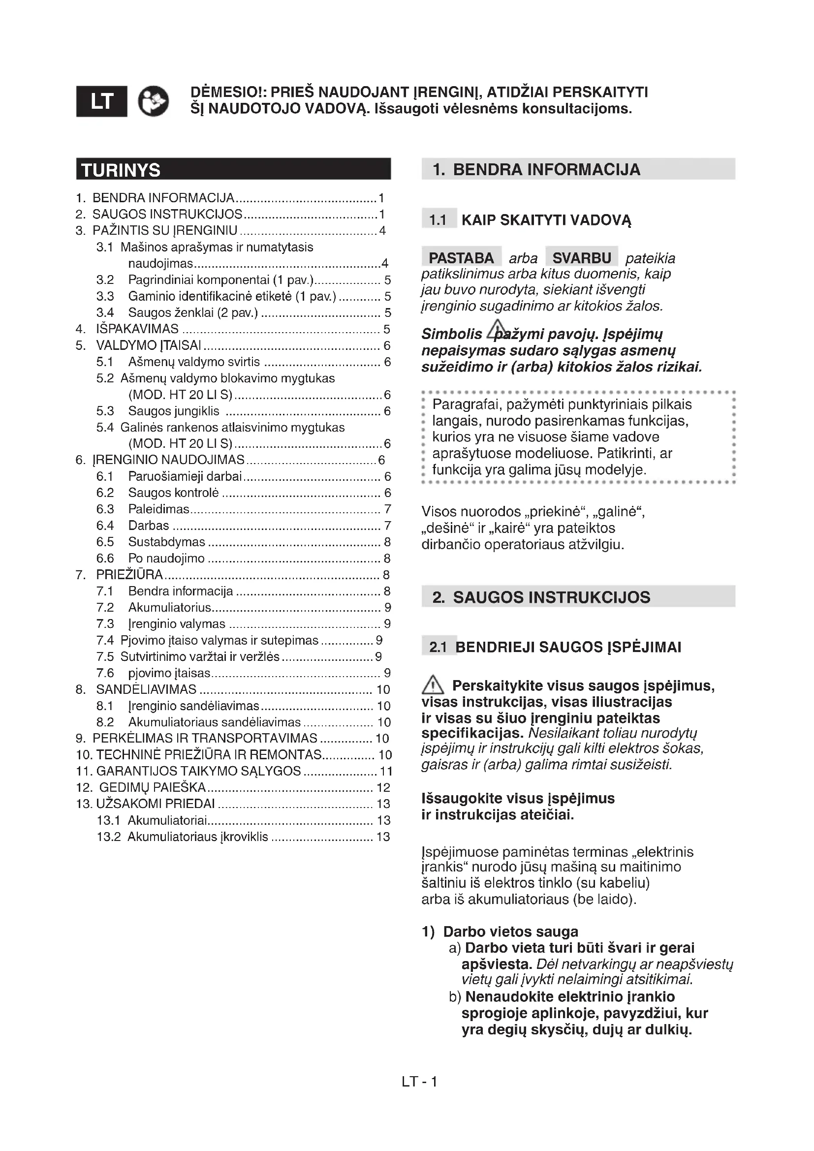 a) Darbo vieta turi būti švari ir gerai apšviesta. Dėl netvarkingų ar neapšviestų vietų gali įvykti nelaimingi atsitikimai. b) Nenaudokite elektrinio įrankio sprogioje aplinkoje, pavyzdžiui, kur yra degių skysčių, dujų ar dulkių. TURINYS