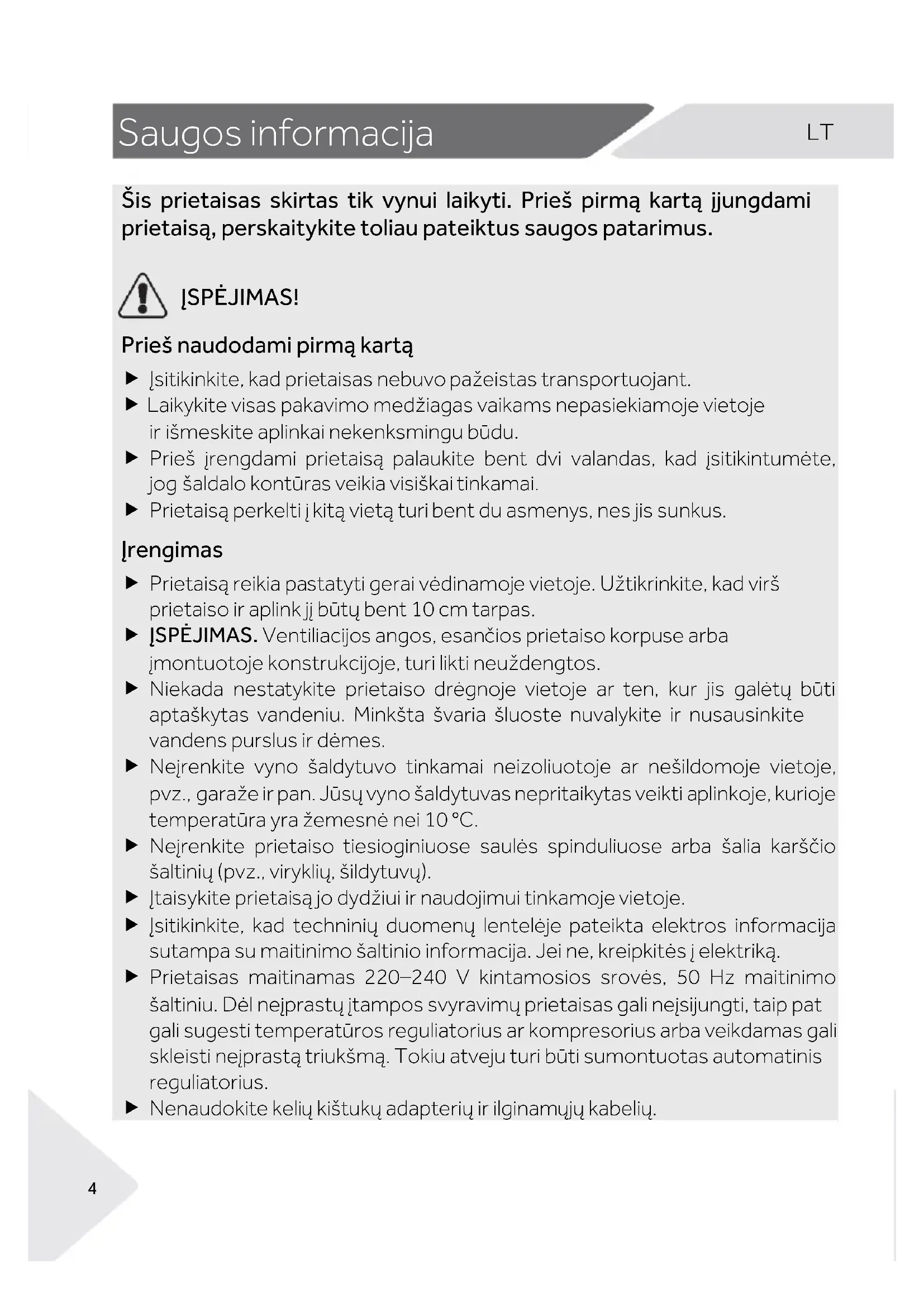 ĮSPĖJIMAS! ĮSPĖJIMAS. Už prietaiso nelaikykite kelių nešiojamųjų kištukinių lizdų arba nešiojamųjų maitinimo šaltinių. ĮSPĖJIMAS. Pastatydami prietaisą įsitikinkite, kad maitinimo laidas neįstrigęs ir nepažeistas. Neužlipkite ant maitinimo kabelio. Energijos tiekimui naudokite atskirą įžemintą lizdą, kuris būtų lengvai pasiekiamas. Prietaisas turi būti įžemintas. Taikoma tik JK. Prietaiso maitinimo kabelis turi 3 laidų (įžeminimo) kištuką, kuris tinka standartiniam 3 laidų (įžemintam) lizdui. Nenupjaukite ir neišmontuokite trečiojo kaiščio (įžeminimo). Įrengus prietaisą, kištukas turi būti pasiekiamas. ĮSPĖJIMAS. Nepažeiskite šaldalo kontūro. Kasdienis naudojimas Šį prietaisą gali naudoti vaikai nuo 8 metų ir asmenys, kurių fiziniai, jutiminiai ar protiniai gebėjimai yra riboti arba kurie neturi patirties ir žinių, jei jie prižiūrimi arba jiems duoti nurodymai, kaip saugiai naudoti prietaisą, ir jie supranta su tuo susijusius pavojus. Vaikai negali žaisti su prietaisu. Vaikams nuo 3 iki 8 metų leidžiama pakrauti ir iškrauti šaldymo prietaisus, bet neleidžiama jų valyti ir įrengti. Neleiskite prie prietaiso artintis vaikams iki 3 metų, jei jie nebus nuolat prižiūrimi. Vaikai be priežiūros negali valyti ir tvarkyti šio prietaiso. Prietaisas turi būti pastatytas taip, kad kištukas būtų pasiekiamas. Jei prie prietaiso nuteka akmens anglių dujų ar kitų degiųjų dujų, užsukite čiaupą, iš kurio teka dujos, atidarykite duris, langus, ir neatjunkite prietaiso maitinimo kabelio. Atjungę maitinimą palaukite bent 7 minutes prieš jį vėl įjungdami. Nekelkite prietaiso už durelių rankenų. Raktelius laikykite vaikams nepasiekiamoje vietoje ir atokiau nuo prietaiso, kad vaikai neužsidarytų prietaiso viduje.Saugos informacija