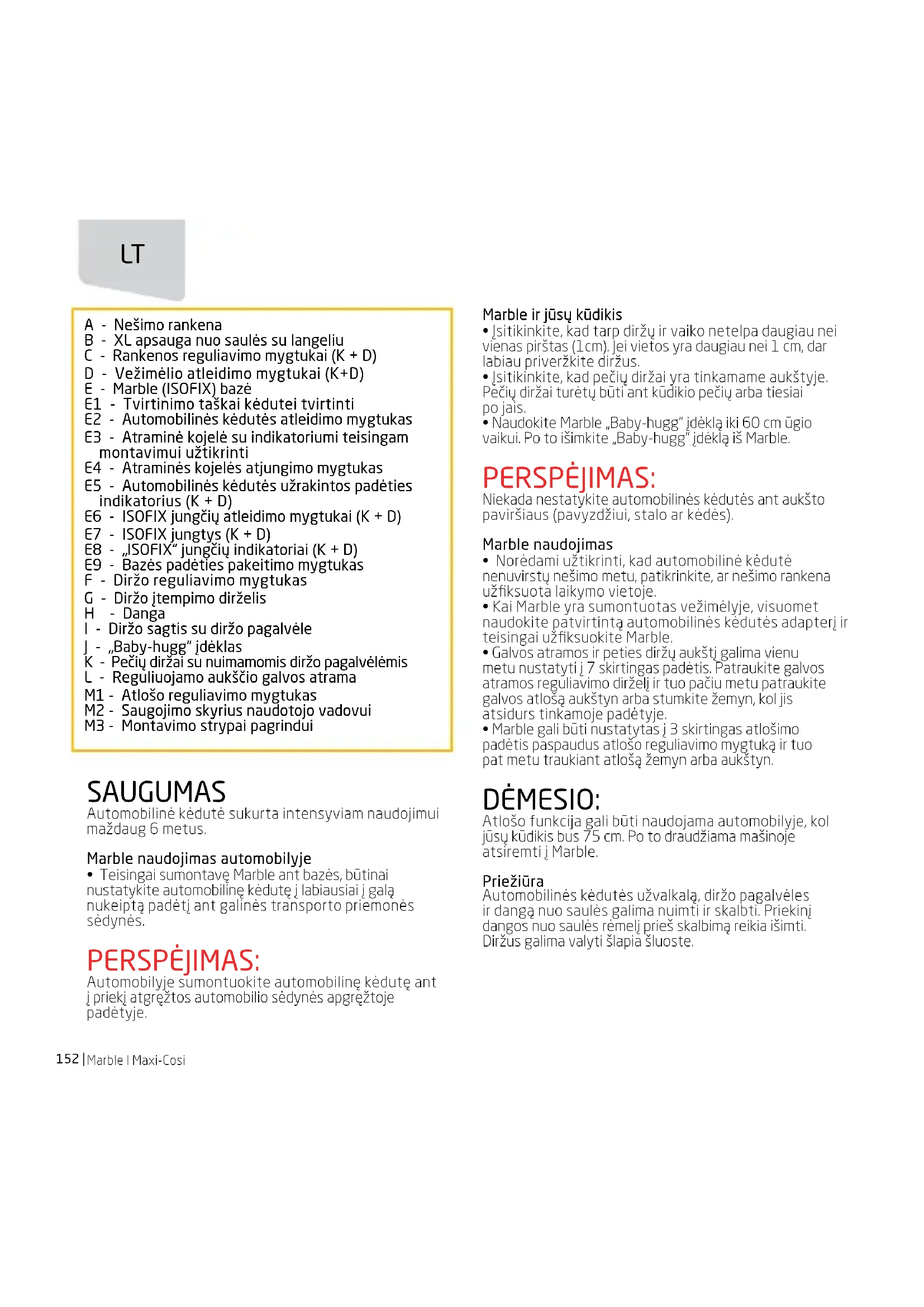 - Marble gali būti nustatytas į 3 skirtingas atlošimo padėtis paspaudus atlošo reguliavimo mygtuką ir tuo pat metu traukiant atlošą žemyn arba aukštyn. DĖMESIO: Atlošo funkcija gali būti naudojama automobilyje, kol jūsų kūdikis bus 75 cm. Po to draudžiama mašinoje atsiremti į Marble. Priežiūra Automobilinės kėdutės užvalkalą, diržo pagalvėles ir dangą nuo saulės galima nuimti ir skalbti. Priekinį dangos nuo saulės rėmelį prieš skalbimą reikia išimti. Diržus galima valyti šlapia šluoste. A - Nešimo rankena B - XL apsauga nuo saulės su langeliu C - Rankenos reguliavimo mygtukai (K + D) D - Vežimėlio atleidimo mygtukai (K+D) E - Marble (ISOFIX) bazė E1 - Tvirtinimo taškai kėdutei tvirtinti E2 - Automobilinės kėdutės atleidimo mygtukas E3 - Atraminė kojelė su indikatoriumi teisingam montavimui užtikrinti E4 - Atraminės kojelės atjungimo mygtukas E5 - Automobilinės kėdutės užrakintos padėties indikatorius (K + D) E6 - ISOFIX jungčių atleidimo mygtukai (K + D) E7 - ISOFIX jungtys (K + D) E8 - „ISOFIX“ jungčių indikatoriai (K + D) E9 - Bazės padėties pakeitimo mygtukas F - Diržo reguliavimo mygtukas G - Diržo įtempimo dirželis H - Danga I - Diržo sagtis su diržo pagalvėle J - „Baby-hugg“ įdėklas K - Pečių diržai su nuimamomis diržo pagalvėlėmis L - Reguliuojamo aukščio galvos atrama M1 - Atlošo reguliavimo mygtukas M2 - Saugojimo skyrius naudotojo vadovui M3 - Montavimo strypai pagrinduiMaxi-Cosi