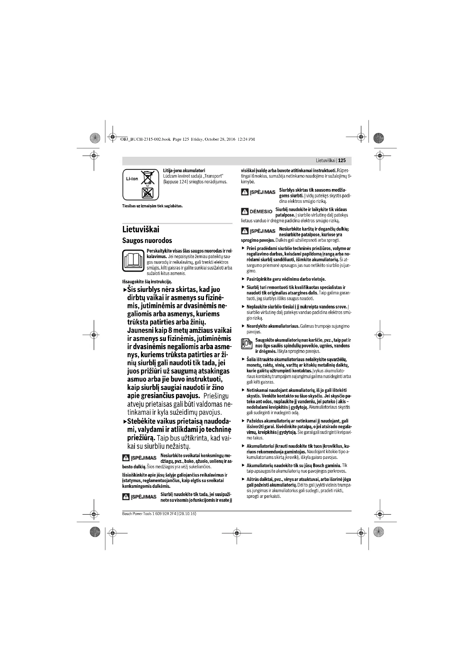 Techniniai duomenys nustatyti su tiekiamame komplekte esančiais akumuliatoriais. priklausomai nuo naudojamo akumuliatoriaus ribota galia, esant temperatūrai <0 °C tik induktyviesiems akumuliatoriams OBJ_BUCH-2315-002.book Page 126 Friday, October 28, 2016 12:24 PMLietuviškai | 127 Bosch Power Tools 1 609 92A 2F4 | (28.10.16) Montavimas Akumuliatoriaus įkrovimas