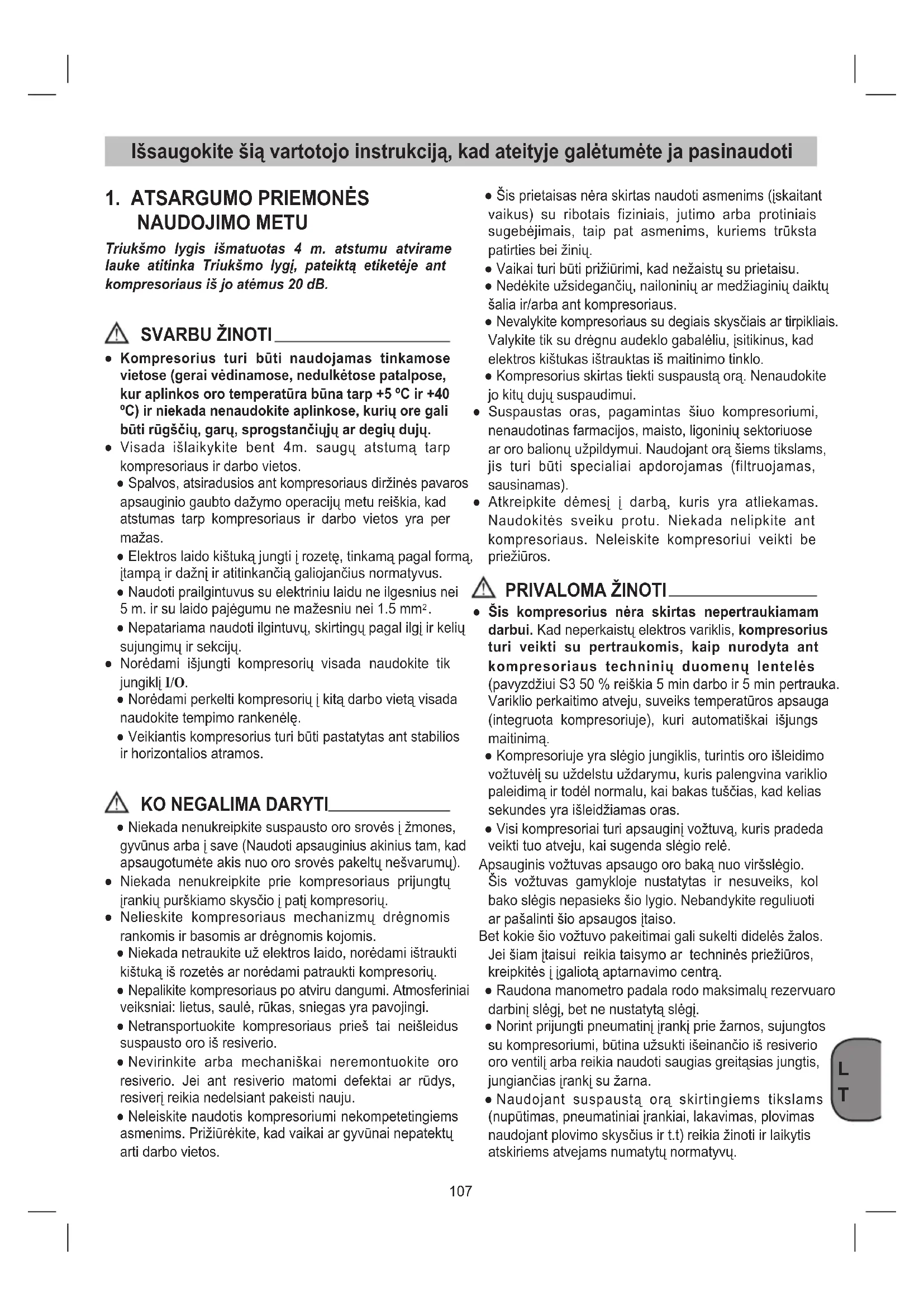 ● Niekada nenukreipkite suspausto oro srovės į žmones, gyvūnus arba į save (Naudoti apsauginius akinius tam, kad apsaugotumėte akis nuo oro srovės pakeltų nešvarumų). ● Niekada nenukreipkite prie kompresoriaus prijungtų įrankių purškiamo skysčio į patį kompresorių. ● Nelieskite kompresoriaus mechanizmų drėgnomis rankomis ir basomis ar drėgnomis kojomis. ● Niekada netraukite už elektros laido, norėdami ištraukti kištuką iš rozetės ar norėdami patraukti kompresorių. ● Nepalikite kompresoriaus po atviru dangumi. Atmosferiniai veiksniai: lietus, saulė, rūkas, sniegas yra pavojingi. ● Netransportuokite kompresoriaus prieš tai neišleidus suspausto oro iš resiverio. ● Nevirinkite arba mechaniškai neremontuokite oro resiverio. Jei ant resiverio matomi defektai ar rūdys, resiverį reikia nedelsiant pakeisti nauju. ● Neleiskite naudotis kompresoriumi nekompetetingiems asmenims. Prižiūrėkite, kad vaikai ar gyvūnai nepatektų arti darbo vietos. ● Šis prietaisas nėra skirtas naudoti asmenims (įskaitant vaikus) su ribotais fiziniais, jutimo arba protiniais sugebėjimais, taip pat asmenims, kuriems trūksta patirties bei žinių. ● Vaikai turi būti prižiūrimi, kad nežaistų su prietaisu. ● Nedėkite užsidegančių, nailoninių ar medžiaginių daiktų šalia ir/arba ant kompresoriaus. ● Nevalykite kompresoriaus su degiais skysčiais ar tirpikliais. Valykite tik su drėgnu audeklo gabalėliu, įsitikinus, kad elektros kištukas ištrauktas iš maitinimo tinklo. ● Kompresorius skirtas tiekti suspaustą orą. Nenaudokite jo kitų dujų suspaudimui. ● Suspaustas oras, pagamintas šiuo kompresoriumi, nenaudotinas farmacijos, maisto, ligoninių sektoriuose ar oro balionų užpildymui. Naudojant orą šiems tikslams, jis turi būti specialiai apdorojamas (filtruojamas, sausinamas). ● Atkreipkite dėmesį į darbą, kuris yra atliekamas. Naudokitės sveiku protu. Niekada nelipkite ant kompresoriaus. Neleiskite kompresoriui veikti be priežiūros. PRIVALOMA ŽINOTI ● Šis kompresorius nėra skirtas nepertraukiamam darbui. Kad neperkaistų elektros variklis, kompresorius turi veikti su pertraukomis, kaip nurodyta ant kompresoriaus techninių duomenų lentelės (pavyzdžiui S3 50 % reiškia 5 min darbo ir 5 min pertrauka. Variklio perkaitimo atveju, suveiks temperatūros apsauga (integruota kompresoriuje), kuri automatiškai išjungs maitinimą. ● Kompresoriuje yra slėgio jungiklis, turintis oro išleidimo vožtuvėlį su uždelstu uždarymu, kuris palengvina variklio paleidimą ir todėl normalu, kai bakas tuščias, kad kelias sekundes yra išleidžiamas oras. ● Visi kompresoriai turi apsauginį vožtuvą, kuris pradeda veikti tuo atveju, kai sugenda slėgio relė. Apsauginis vožtuvas apsaugo oro baką nuo viršslėgio. Šis vožtuvas gamykloje nustatytas ir nesuveiks, kol bako slėgis nepasieks šio lygio. Nebandykite reguliuoti ar pašalinti šio apsaugos įtaiso. Bet kokie šio vožtuvo pakeitimai gali sukelti didelės žalos. Jei šiam įtaisui reikia taisymo ar techninės priežiūros, kreipkitės į įgaliotą aptarnavimo centrą. ● Raudona manometro padala rodo maksimalų rezervuaro darbinį slėgį, bet ne nustatytą slėgį. ● Norint prijungti pneumatinį įrankį prie žarnos, sujungtos su kompresoriumi, būtina užsukti išeinančio iš resiverio oro ventilį arba reikia naudoti saugias greitąsias jungtis, jungiančias įrankį su žarna. ● Naudojant suspaustą orą skirtingiems tikslams (nupūtimas, pneumatiniai įrankiai, lakavimas, plovimas naudojant plovimo skysčius ir t.t) reikia žinoti ir laikytis atskiriems atvejams numatytų normatyvų.108