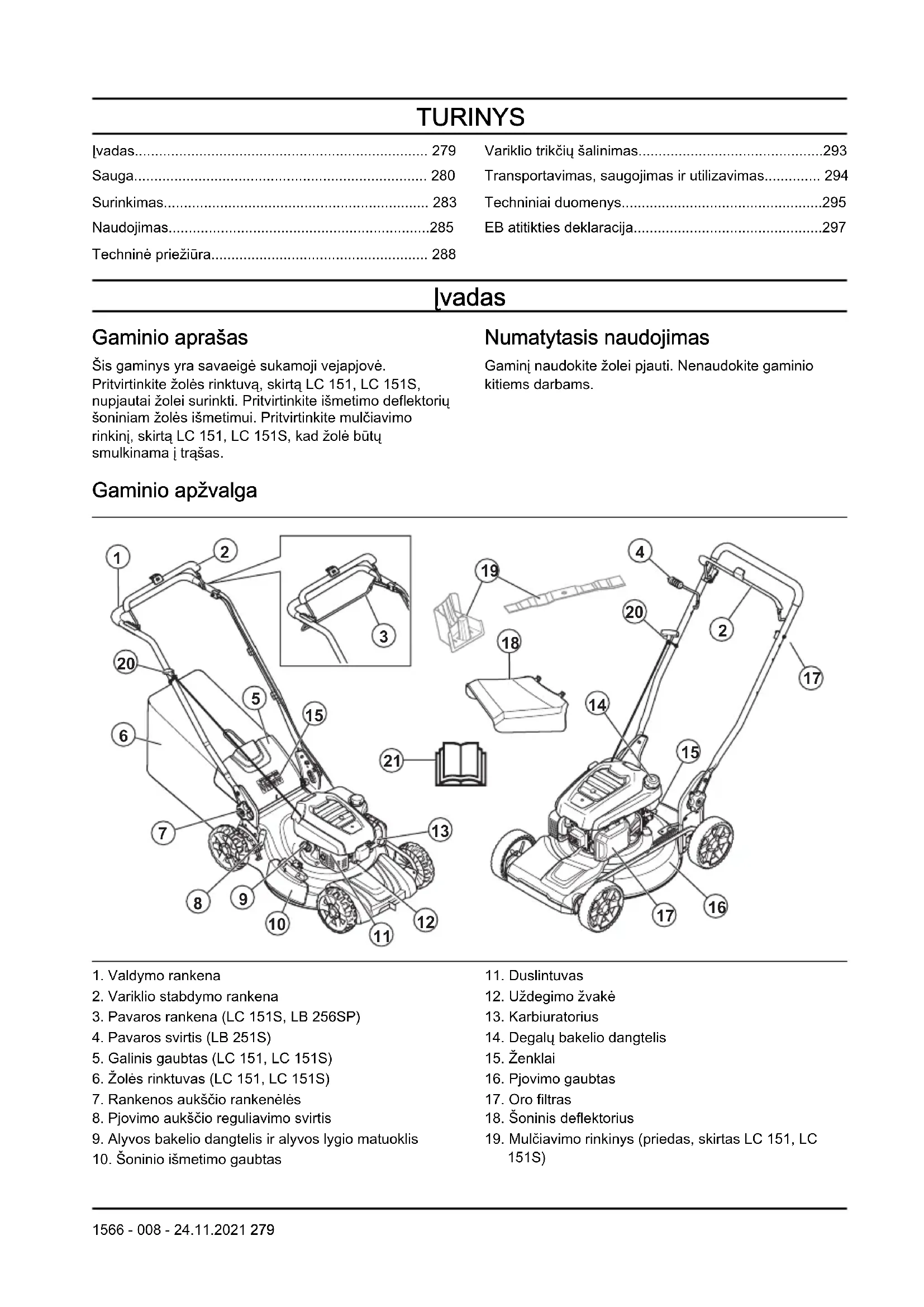 - EB atitikties deklaracija Įvadas Gaminio aprašas Šis gaminys yra savaeigė sukamoji vejapjovė. Pritvirtinkite žolės rinktuvą, skirtą LC 151, LC 151S, nupjautai žolei surinkti. Pritvirtinkite išmetimo deflektorių šoniniam žolės išmetimui. Pritvirtinkite mulčiavimo rinkinį, skirtą LC 151, LC 151S, kad žolė būtų smulkinama į trąšas. Numatytasis naudojimas Gaminį naudokite žolei pjauti. Nenaudokite gaminio kitiems darbams. Gaminio apžvalga p. 297
