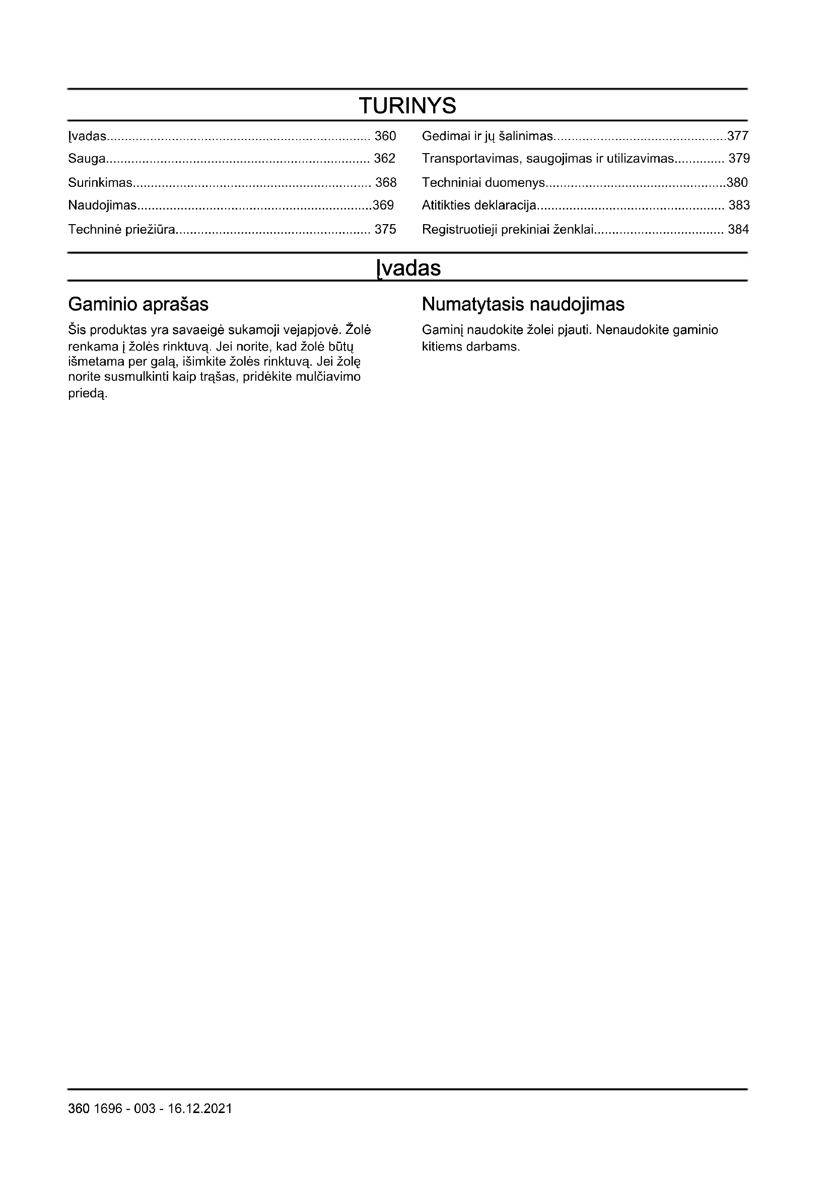 - Registruotieji prekiniai ženklai Įvadas Gaminio aprašas Šis produktas yra savaeigė sukamoji vejapjovė. Žolė renkama į žolės rinktuvą. Jei norite, kad žolė būtų išmetama per galą, išimkite žolės rinktuvą. Jei žolę norite susmulkinti kaip trąšas, pridėkite mulčiavimo priedą. Numatytasis naudojimas Gaminį naudokite žolei pjauti. Nenaudokite gaminio kitiems darbams. 360 1696 - 003 - 16.12.2021Gaminio apžvalga p. 384