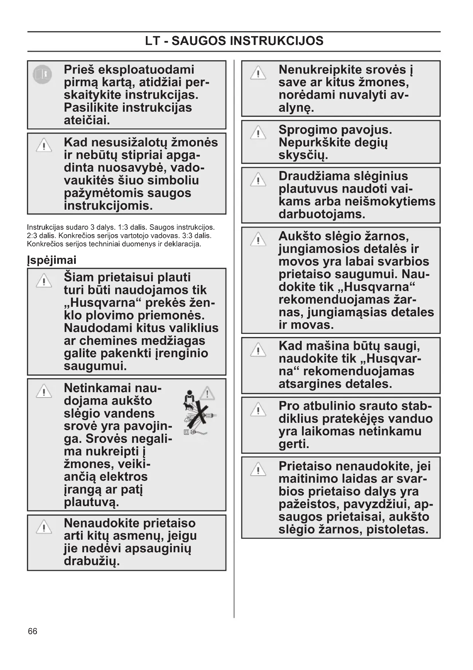 Prieš eksploatuodami pirmą kartą, atidžiai per- skaitykite instrukcijas. Pasilikite instrukcijas ateičiai. Kad nesusižalotų žmonės ir nebūtų stipriai apga- dinta nuosavybė, vado- vaukitės šiuo simboliu pažymėtomis saugos instrukcijomis. Instrukcijas sudaro 3 dalys. 1:3 dalis. Saugos instrukcijos. 2:3 dalis. Konkrečios serijos vartotojo vadovas. 3:3 dalis. Konkrečios serijos techniniai duomenys ir deklaracija. Įspėjimai Šiam prietaisui plauti turi būti naudojamos tik „Husqvarna“ prekės žen- klo plovimo priemonės. Naudodami kitus valiklius ar chemines medžiagas galite pakenkti įrenginio saugumui. Netinkamai nau- dojama aukšto slėgio vandens srovė yra pavojin- ga. Srovės negali- ma nukreipti į žmones, veiki- ančią elektros įrangą ar patį plautuvą. Nenaudokite prietaiso arti kitų asmenų, jeigu jie nedėvi apsauginių drabužių. Nenukreipkite srovės į save ar kitus žmones, norėdami nuvalyti av- alynę. Sprogimo pavojus. Nepurkškite degių skysčių. Draudžiama slėginius plautuvus naudoti vai- kams arba neišmokytiems darbuotojams. Aukšto slėgio žarnos, jungiamosios detalės ir movos yra labai svarbios prietaiso saugumui. Nau- dokite tik „Husqvarna“ rekomenduojamas žar- nas, jungiamąsias detales ir movas. Kad mašina būtų saugi, naudokite tik „Husqvar- na“ rekomenduojamas atsargines detales. Pro atbulinio srauto stab- diklius pratekėjęs vanduo yra laikomas netinkamu gerti. Prietaiso nenaudokite, jei maitinimo laidas ar svar- bios prietaiso dalys yra pažeistos, pavyzdžiui, ap- saugos prietaisai, aukšto slėgio žarnos, pistoletas. OM 1-3 Safety FINAL rev 1 draft.indd 66 2017-06-14 13:59:5567