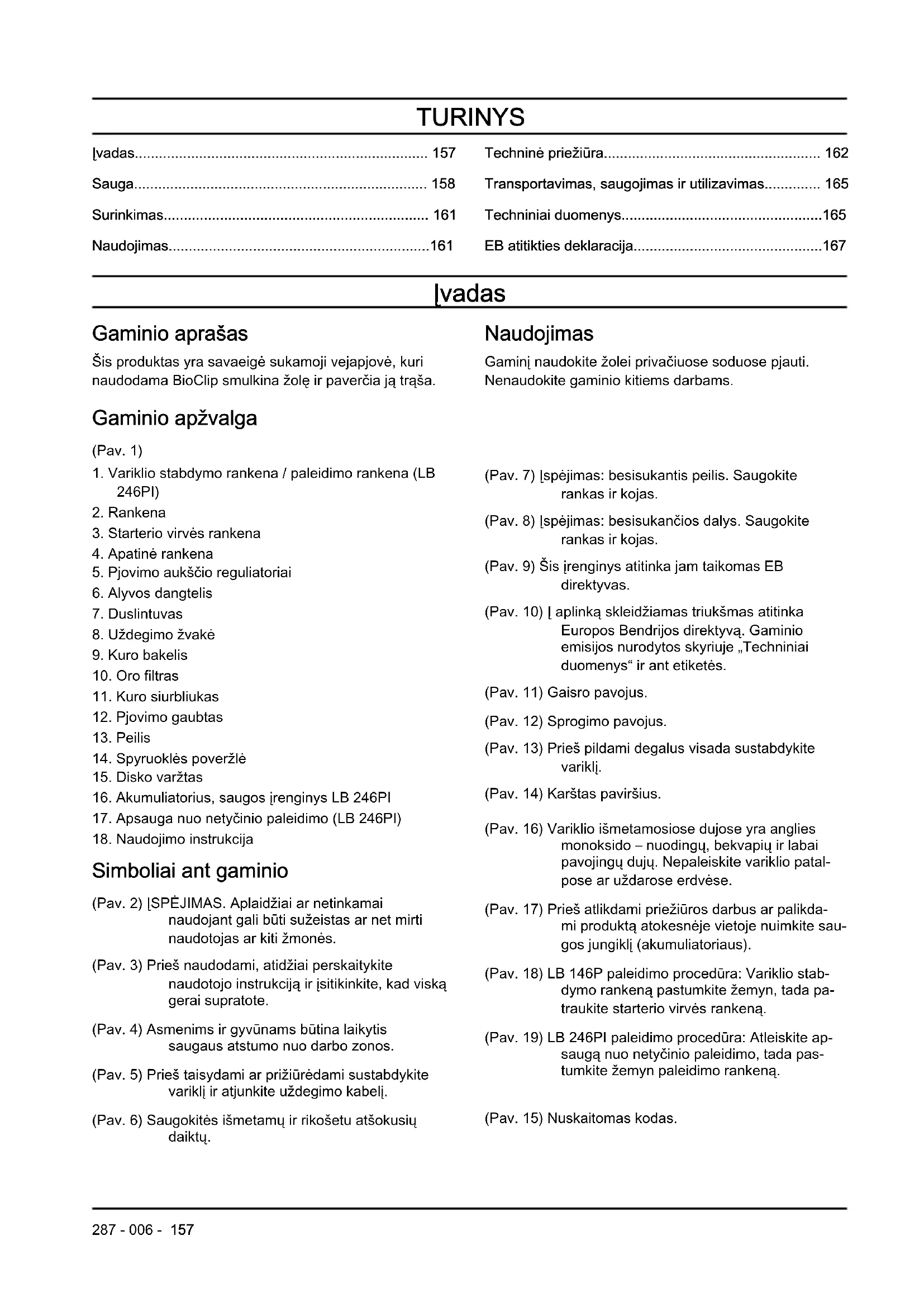 Simboliai ant gaminio (Pav. 2) ĮSPĖJIMAS. Aplaidžiai ar netinkamai naudojant gali būti sužeistas ar net mirti naudotojas ar kiti žmonės. (Pav. 3) Prieš naudodami, atidžiai perskaitykite naudotojo instrukciją ir įsitikinkite, kad viską gerai supratote. (Pav. 4) Asmenims ir gyvūnams būtina laikytis saugaus atstumo nuo darbo zonos. (Pav. 5) Prieš taisydami ar prižiūrėdami sustabdykite variklį ir atjunkite uždegimo kabelį. (Pav. 6) Saugokitės išmetamų ir rikošetu atšokusių daiktų. (Pav. 7) Įspėjimas: besisukantis peilis. Saugokite rankas ir kojas. (Pav. 8) Įspėjimas: besisukančios dalys. Saugokite rankas ir kojas. (Pav. 9) Šis įrenginys atitinka jam taikomas EB direktyvas. (Pav. 10) Į aplinką skleidžiamas triukšmas atitinka Europos Bendrijos direktyvą. Gaminio emisijos nurodytos skyriuje „Techniniai duomenys“ ir ant etiketės. (Pav. 11) Gaisro pavojus. (Pav. 12) Sprogimo pavojus. (Pav. 13) Prieš pildami degalus visada sustabdykite variklį. (Pav. 14) Karštas paviršius. (Pav. 16) Variklio išmetamosiose dujose yra anglies monoksido – nuodingų, bekvapių ir labai pavojingų dujų. Nepaleiskite variklio patal- pose ar uždarose erdvėse. (Pav. 17) Prieš atlikdami priežiūros darbus ar palikda- mi produktą atokesnėje vietoje nuimkite sau- gos jungiklį (akumuliatoriaus). (Pav. 18) LB 146P paleidimo procedūra: Variklio stab- dymo rankeną pastumkite žemyn, tada pa- traukite starterio virvės rankeną. (Pav. 19) LB 246PI paleidimo procedūra: Atleiskite ap- saugą nuo netyčinio paleidimo, tada pas- tumkite žemyn paleidimo rankeną. (Pav. 15) Nuskaitomas kodas.