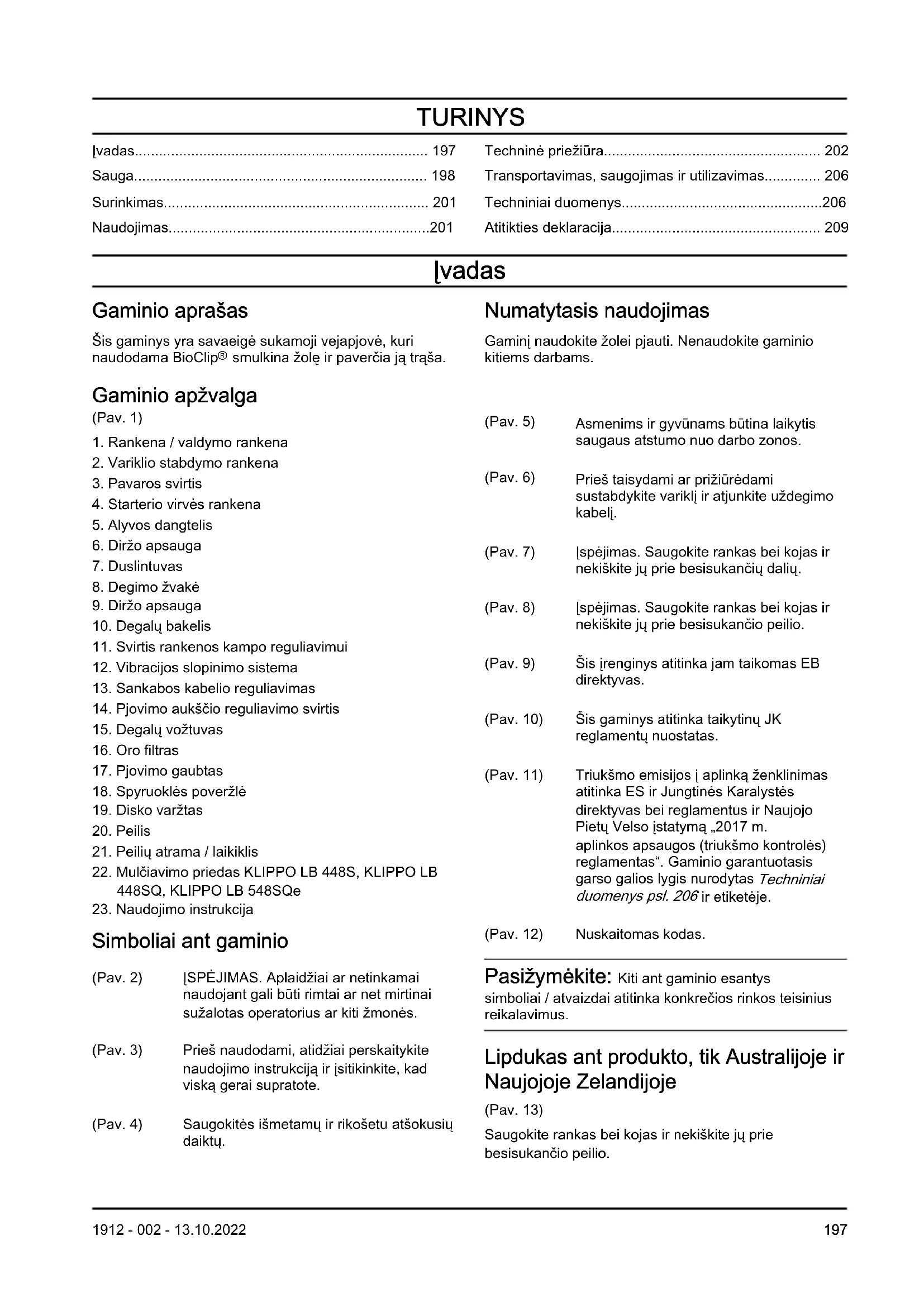 Simboliai ant gaminio (Pav. 2) ĮSPĖJIMAS. Aplaidžiai ar netinkamai naudojant gali būti rimtai ar net mirtinai sužalotas operatorius ar kiti žmonės. (Pav. 3) Prieš naudodami, atidžiai perskaitykite naudojimo instrukciją ir įsitikinkite, kad viską gerai supratote. (Pav. 4) Saugokitės išmetamų ir rikošetu atšokusių daiktų. (Pav. 5) Asmenims ir gyvūnams būtina laikytis saugaus atstumo nuo darbo zonos. (Pav. 6) Prieš taisydami ar prižiūrėdami sustabdykite variklį ir atjunkite uždegimo kabelį. (Pav. 7) Įspėjimas. Saugokite rankas bei kojas ir nekiškite jų prie besisukančių dalių. (Pav. 8) Įspėjimas. Saugokite rankas bei kojas ir nekiškite jų prie besisukančio peilio. (Pav. 9) Šis įrenginys atitinka jam taikomas EB direktyvas. (Pav. 10) Šis gaminys atitinka taikytinų JK reglamentų nuostatas. (Pav. 11) Triukšmo emisijos į aplinką ženklinimas atitinka ES ir Jungtinės Karalystės direktyvas bei reglamentus ir Naujojo Pietų Velso įstatymą „2017m. aplinkos apsaugos (triukšmo kontrolės) reglamentas“. Gaminio garantuotasis garso galios lygis nurodytas Techniniai duomenys psl. 206 ir etiketėje. (Pav. 12) Nuskaitomas kodas. Pasižymėkite: Kiti ant gaminio esantys simboliai / atvaizdai atitinka konkrečios rinkos teisinius reikalavimus. Lipdukas ant produkto, tik Australijoje ir Naujojoje Zelandijoje (Pav. 13) Saugokite rankas bei kojas ir nekiškite jų prie besisukančio peilio. 1912 - 002 - 13.10.2022 197„Euro V“ standartas PERSPĖJIMAS: Variklio modifikavimas panaikina šio produkto ES tipo patvirtinimą. Atsakomybė už gaminį Kaip nurodyta atsakomybės už gaminį įstatymuose, mes nesame atsakingi už mūsų gaminio sukeltą žalą, jei: