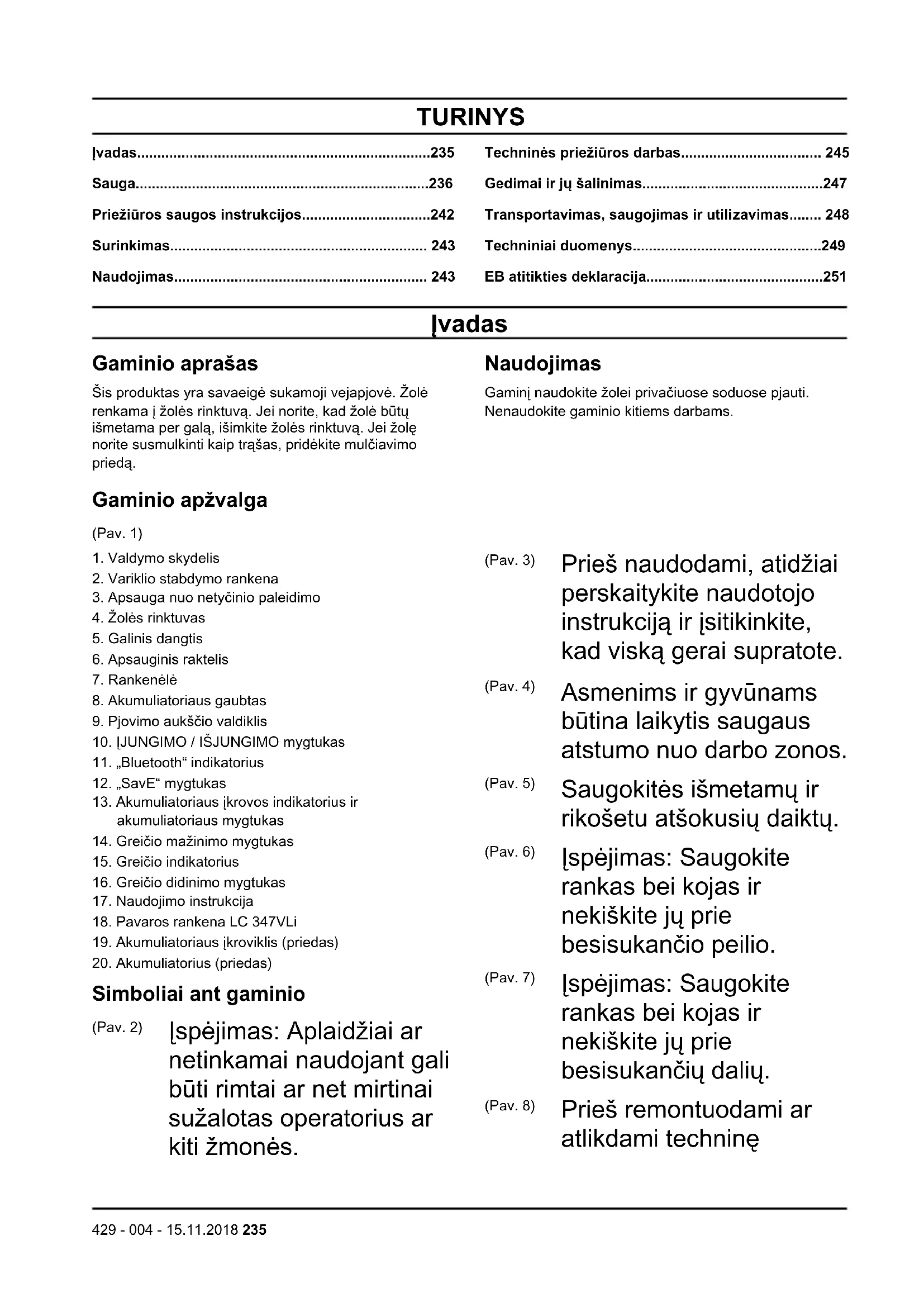 Simboliai ant gaminio (Pav. 2) Įspėjimas: Aplaidžiai ar netinkamai naudojant gali būti rimtai ar net mirtinai sužalotas operatorius ar kiti žmonės. (Pav. 3) Prieš naudodami, atidžiai perskaitykite naudotojo instrukciją ir įsitikinkite, kad viską gerai supratote. (Pav. 4) Asmenims ir gyvūnams būtina laikytis saugaus atstumo nuo darbo zonos. (Pav. 5) Saugokitės išmetamų ir rikošetu atšokusių daiktų. (Pav. 6) Įspėjimas: Saugokite rankas bei kojas ir nekiškite jų prie besisukančio peilio. (Pav. 7) Įspėjimas: Saugokite rankas bei kojas ir nekiškite jų prie besisukančių dalių. (Pav. 8) Prieš remontuodami ar atlikdami techninę