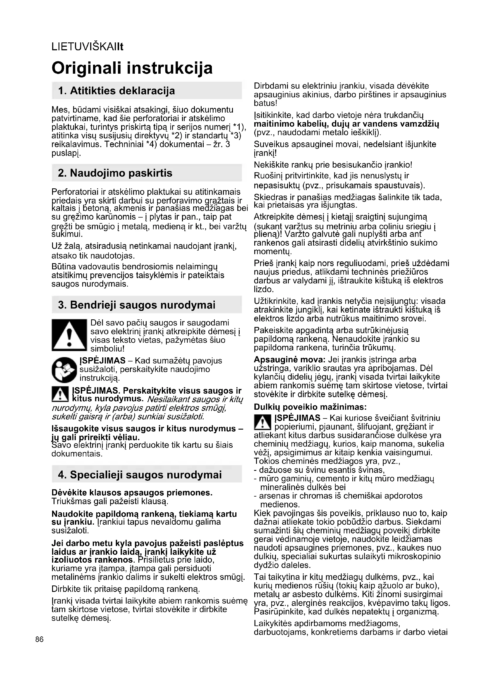 Mes, būdami visiškai atsakingi, šiuo dokumentu patvirtiname, kad šie perforatoriai ir atskėlimo plaktukai, turintys priskirtą tipą ir serijos numerį *1), atitinka visų susijusių direktyvų *2) ir standartų *3) reikalavimus. Techniniai *4) dokumentai – žr. 3 puslapį. Perforatoriai ir atskėlimo plaktukai su atitinkamais priedais yra skirti darbui su perforavimo grąžtais ir kaltais į betoną, akmenis ir panašias medžiagas bei su gręžimo karūnomis – į plytas ir pan., taip pat gręžti be smūgio į metalą, medieną ir kt., bei varžtų sukimui. Už žalą, atsiradusią netinkamai naudojant įrankį, atsako tik naudotojas. Būtina vadovautis bendrosiomis nelaimingų atsitikimų prevencijos taisyklėmis ir pateiktais saugos nurodymais. Dėl savo pačių saugos ir saugodami savo elektrinį įrankį atkreipkite dėmesį į visas teksto vietas, pažymėtas šiuo simboliu! ĮSPĖJIMAS – Kad sumažėtų pavojus susižaloti, perskaitykite naudojimo instrukciją. ĮSPĖJIMAS. Perskaitykite visus saugos ir kitus nurodymus. Nesilaikant saugos ir kitų nurodymų, kyla pavojus patirti elektros smūgį, sukelti gaisrą ir (arba) sunkiai susižaloti. Išsaugokite visus saugos ir kitus nurodymus – jų gali prireikti vėliau. Savo elektrinį įrankį perduokite tik kartu su šiais dokumentais. Dėvėkite klausos apsaugos priemones. Triukšmas gali pažeisti klausą. Naudokite papildomą rankeną, tiekiamą kartu su įrankiu. Įrankiui tapus nevaldomu galima susižaloti. Jei darbo metu kyla pavojus pažeisti paslėptus laidus ar įrankio laidą, įrankį laikykite už izoliuotos rankenos. Prisilietus prie laido, kuriame yra įtampa, įtampa gali persiduoti metalinėms įrankio dalims ir sukelti elektros smūgį. Dirbkite tik pritaisę papildomą rankeną. Įrankį visada tvirtai laikykite abiem rankomis suėmę tam skirtose vietose, tvirtai stovėkite ir dirbkite sutelkę dėmesį. Dirbdami su elektriniu įrankiu, visada dėvėkite apsauginius akinius, darbo pirštines ir apsauginius batus! Įsitikinkite, kad darbo vietoje nėra trukdančių maitinimo kabelių, dujų ar vandens vamzdžių (pvz., naudodami metalo ieškiklį). Suveikus apsauginei movai, nedelsiant išjunkite įrankį! Nekiškite rankų prie besisukančio įrankio! Ruošinį pritvirtinkite, kad jis nenuslystų ir nepasisuktų (pvz., prisukamais spaustuvais). Skiedras ir panašias medžiagas šalinkite tik tada, kai prietaisas yra išjungtas. Atkreipkite dėmesį į kietąjį sraigtinį sujungimą (sukant varžtus su metriniu arba coliniu sriegiu į plieną)! Varžto galvutė gali nuplyšti arba ant rankenos gali atsirasti didelių atvirkštinio sukimo momentų. Prieš įrankį kaip nors reguliuodami, prieš uždėdami naujus priedus, atlikdami techninės priežiūros darbus ar valydami jį, ištraukite kištuką iš elektros lizdo. Užtikrinkite, kad įrankis netyčia neįsijungtų: visada atrakinkite jungiklį, kai ketinate ištraukti kištuką iš elektros lizdo arba nutrūkus maitinimo srovei. Pakeiskite apgadintą arba sutrūkinėjusią papildomą rankeną. Nenaudokite įrankio su papildoma rankena, turinčia trūkumų. Apsauginė mova: Jei įrankis įstringa arba užstringa, variklio srautas yra apribojamas. Dėl kylančių didelių jėgų, įrankį visada tvirtai laikykite abiem rankomis suėmę tam skirtose vietose, tvirtai stovėkite ir dirbkite sutelkę dėmesį. Dulkių poveikio mažinimas: ĮSPĖJIMAS – Kai kuriose šveičiant švitriniu popieriumi, pjaunant, šlifuojant, gręžiant ir atliekant kitus darbus susidarančiose dulkėse yra cheminių medžiagų, kurios, kaip manoma, sukelia vėžį, apsigimimus ar kitaip kenkia vaisingumui. Tokios cheminės medžiagos yra, pvz., - dažuose su švinu esantis švinas, - mūro gaminių, cemento ir kitų mūro medžiagų mineralinės dulkės bei - arsenas ir chromas iš chemiškai apdorotos medienos. Kiek pavojingas šis poveikis, priklauso nuo to, kaip dažnai atliekate tokio pobūdžio darbus. Siekdami sumažinti šių cheminių medžiagų poveikį dirbkite gerai vėdinamoje vietoje, naudokite leidžiamas naudoti apsaugines priemones, pvz., kaukes nuo dulkių, specialiai sukurtas sulaikyti mikroskopinio dydžio daleles. Tai taikytina ir kitų medžiagų dulkėms, pvz., kai kurių medienos rūšių (tokių kaip ąžuolo ar buko), metalų ar asbesto dulkėms. Kiti žinomi susirgimai yra, pvz., alerginės reakcijos, kvėpavimo takų ligos. Pasirūpinkite, kad dulkės nepatektų į organizmą. Laikykitės apdirbamoms medžiagoms, darbuotojams, konkretiems darbams ir darbo vietai Originali instrukcija