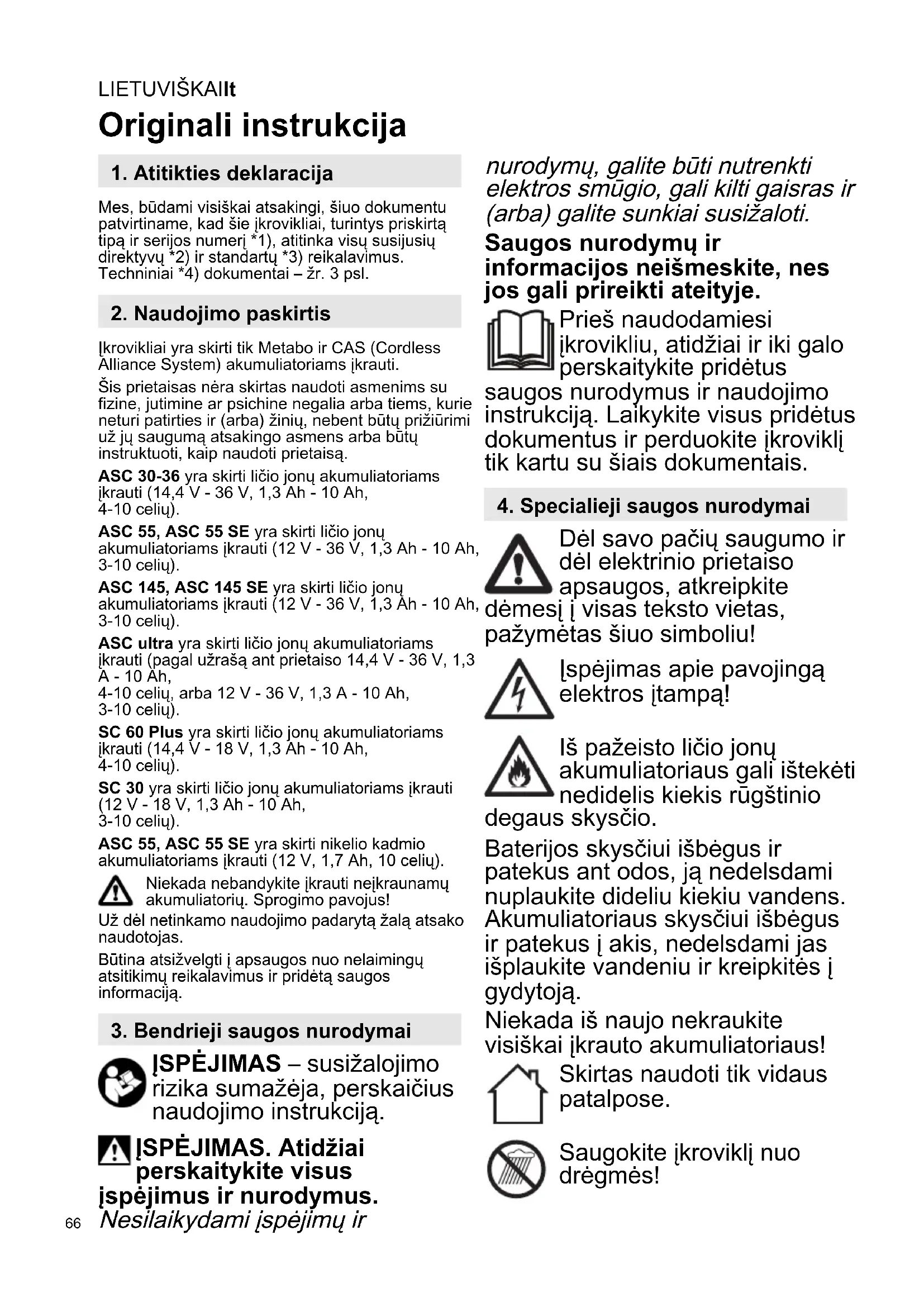 Originali instrukcija Mes, būdami visiškai atsakingi, šiuo dokumentu patvirtiname, kad šie įkrovikliai, turintys priskirtą tipą ir serijos numerį *1), atitinka visų susijusių direktyvų *2) ir standartų *3) reikalavimus. Techniniai *4) dokumentai – žr. 3 psl. Įkrovikliai yra skirti tik Metabo ir CAS (Cordless Alliance System) akumuliatoriams įkrauti. Šis prietaisas nėra skirtas naudoti asmenims su fizine, jutimine ar psichine negalia arba tiems, kurie neturi patirties ir (arba) žinių, nebent būtų prižiūrimi už jų saugumą atsakingo asmens arba būtų instruktuoti, kaip naudoti prietaisą. ASC 30-36 yra skirti ličio jonų akumuliatoriams įkrauti (14,4 V - 36 V, 1,3 Ah - 10 Ah, 4-10 celių). ASC 55, ASC 55 SE yra skirti ličio jonų akumuliatoriams įkrauti (12 V - 36 V, 1,3 Ah - 10 Ah, 3-10 celių). ASC 145, ASC 145 SE yra skirti ličio jonų akumuliatoriams įkrauti (12 V - 36 V, 1,3 Ah - 10 Ah, 3-10 celių). ASC ultra yra skirti ličio jonų akumuliatoriams įkrauti (pagal užrašą ant prietaiso 14,4 V - 36 V, 1,3 A - 10 Ah, 4-10 celių, arba 12 V - 36 V, 1,3 A - 10 Ah, 3-10 celių). SC 60 Plus yra skirti ličio jonų akumuliatoriams įkrauti (14,4 V - 18 V, 1,3 Ah - 10 Ah, 4-10 celių). SC 30 yra skirti ličio jonų akumuliatoriams įkrauti (12 V - 18 V, 1,3 Ah - 10 Ah, 3-10 celių). ASC 55, ASC 55 SE yra skirti nikelio kadmio akumuliatoriams įkrauti (12 V, 1,7 Ah, 10 celių). Niekada nebandykite įkrauti neįkraunamų akumuliatorių. Sprogimo pavojus! Už dėl netinkamo naudojimo padarytą žalą atsako naudotojas. Būtina atsižvelgti į apsaugos nuo nelaimingų atsitikimų reikalavimus ir pridėtą saugos informaciją. ĮSPĖJIMAS – susižalojimo rizika sumažėja, perskaičius naudojimo instrukciją. ĮSPĖJIMAS. Atidžiai perskaitykite visus įspėjimus ir nurodymus. Nesilaikydami įspėjimų ir nurodymų, galite būti nutrenkti elektros smūgio, gali kilti gaisras ir (arba) galite sunkiai susižaloti. Saugos nurodymų ir informacijos neišmeskite, nes jos gali prireikti ateityje. Prieš naudodamiesi įkrovikliu, atidžiai ir iki galo perskaitykite pridėtus saugos nurodymus ir naudojimo instrukciją. Laikykite visus pridėtus dokumentus ir perduokite įkroviklį tik kartu su šiais dokumentais. Dėl savo pačių saugumo ir dėl elektrinio prietaiso apsaugos, atkreipkite dėmesį į visas teksto vietas, pažymėtas šiuo simboliu! Įspėjimas apie pavojingą elektros įtampą! Iš pažeisto ličio jonų akumuliatoriaus gali ištekėti nedidelis kiekis rūgštinio degaus skysčio. Baterijos skysčiui išbėgus ir patekus ant odos, ją nedelsdami nuplaukite dideliu kiekiu vandens. Akumuliatoriaus skysčiui išbėgus ir patekus į akis, nedelsdami jas išplaukite vandeniu ir kreipkitės į gydytoją. Niekada iš naujo nekraukite visiškai įkrauto akumuliatoriaus! Skirtas naudoti tik vidaus patalpose. Saugokite įkroviklį nuo drėgmės!