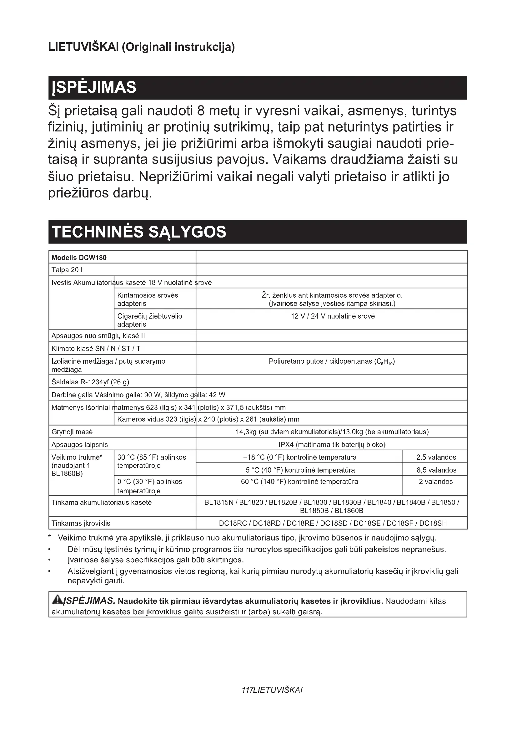 Modelis DCW180Talpa 20 lĮvestis Akumuliatoriaus kasetė 18 V nuolatinė srovėKintamosios srovės adapterisŽr. ženklus ant kintamosios srovės adapterio.(Įvairiose šalyse įvesties įtampa skiriasi.)Cigarečių žiebtuvėlio adapteris12 V / 24 V nuolatinė srovėApsaugos nuo smūgių klasė IIIKlimato klasė SN / N / ST / TIzoliacinė medžiaga / putų sudarymo medžiagaPoliuretano putos / ciklopentanas (C