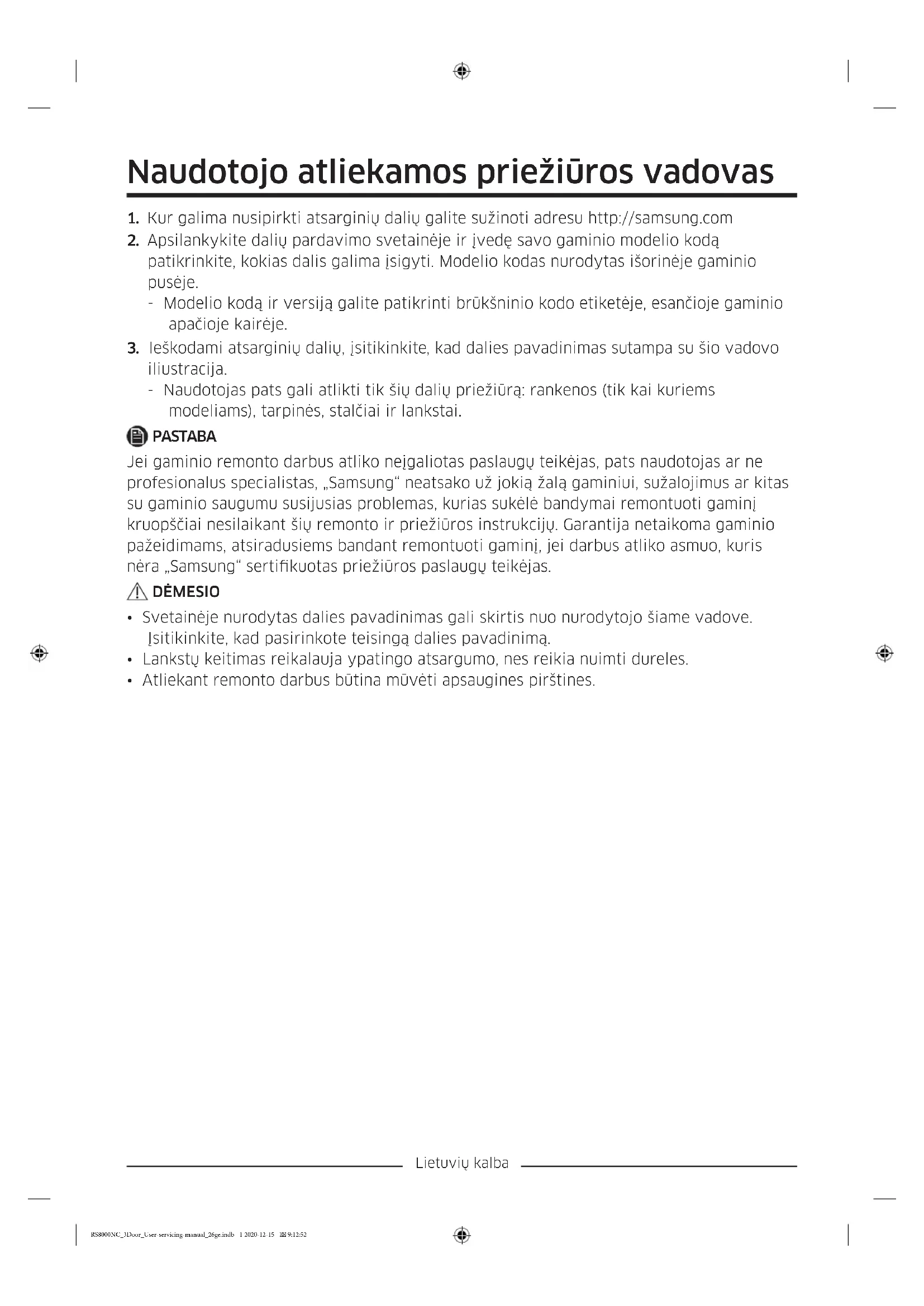 - Atliekant remonto darbus būtina mūvėti apsaugines pirštines. RS8000NC_3Door_User-servicing-manual_26ge.indb 1 2020-12-15 9:12:52Lietuvių kalba Tikras vaizdas ir tiekiamos dalys gali skirtis priklausomai nuo modelio ir šalies.