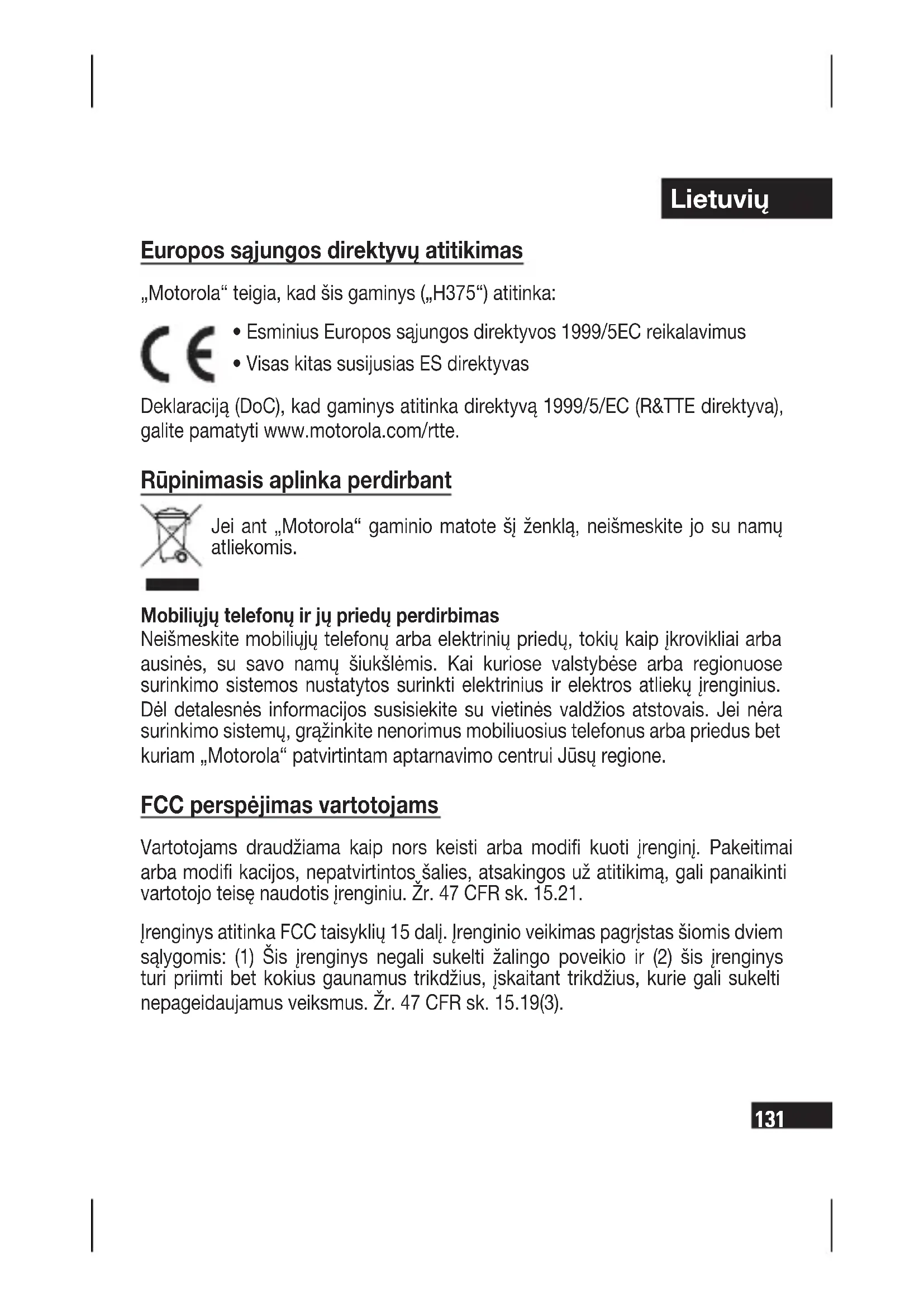 - Visas kitas susijusias ES direktyvas Deklaraciją (DoC), kad gaminys atitinka direktyvą 1999/5/EC (R&TTE direktyva), galite pamatyti www.motorola.com/rtte. Rūpinimasis aplinka perdirbant Jei ant „Motorola“ gaminio matote šį ženklą, neišmeskite jo su namų atliekomis. Mobiliųjų telefonų ir jų priedų perdirbimas Neišmeskite mobiliųjų telefonų arba elektrinių priedų, tokių kaip įkrovikliai arba ausinės, su savo namų šiukšlėmis. Kai kuriose valstybėse arba regionuose surinkimo sistemos nustatytos surinkti elektrinius ir elektros atliekų įrenginius. Dėl detalesnės informacijos susisiekite su vietinės valdžios atstovais. Jei nėra surinkimo sistemų, grąžinkite nenorimus mobiliuosius telefonus arba priedus bet kuriam „Motorola“ patvirtintam aptarnavimo centrui Jūsų regione. FCC perspėjimas vartotojams Vartotojams draudžiama kaip nors keisti arba modifi kuoti įrenginį. Pakeitimai arba modifi kacijos, nepatvirtintos šalies, atsakingos už atitikimą, gali panaikinti vartotojo teisę naudotis įrenginiu. Žr. 47 CFR sk. 15.21. Įrenginys atitinka FCC taisyklių 15 dalį. Įrenginio veikimas pagrįstas šiomis dviem sąlygomis: (1) Šis įrenginys negali sukelti žalingo poveikio ir (2) šis įrenginys turi priimti bet kokius gaunamus trikdžius, įskaitant trikdžius, kurie gali sukelti nepageidaujamus veiksmus. Žr. 47 CFR sk. 15.19(3).Lietuvių