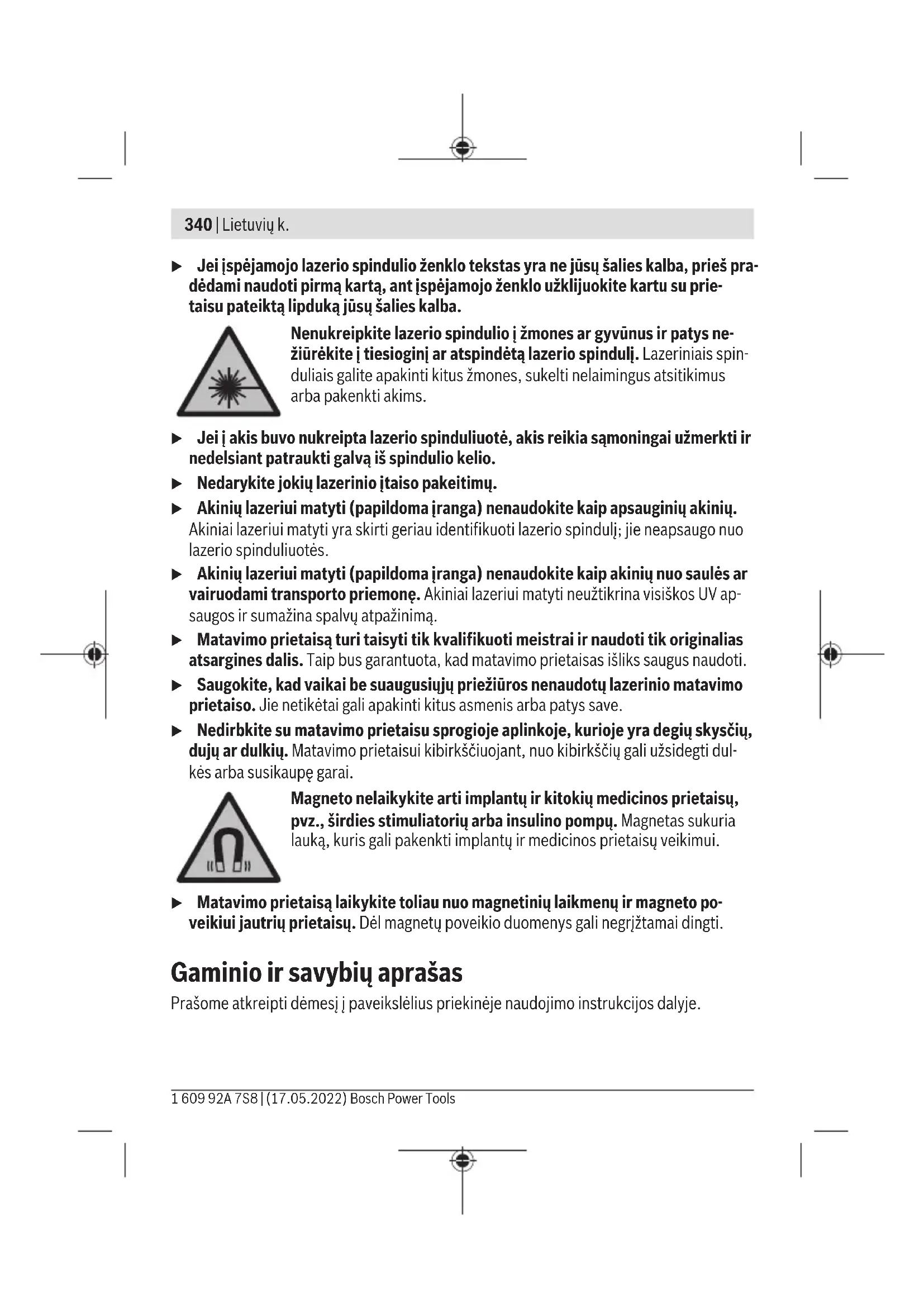 180° – Matavimo prietaisą pasukite 180° kampu. Nustatykite jį į tokią padėtį, kad apatinio la- zerio taško vidurys būtų jau pažymėtame taške II. Palaukite, kol matavimo prietaisas susiniveliuos. Pažymėkite viršutinio lazerio taško vidurį (taškasIII). – Abiejų pažymėtų taškų Ⅰ ir Ⅲ skirtumas d rodo faktinę matavimo prietaiso nuokrypą nuo vertikalės. Maksimalų leidžiamąjį nuokrypį apskaičiuokite taip: dvigubas atstumas tarp grindų ir lubų ×0,35mm/m. Pavyzdžiui: kai atstumas tarp grindų ir lubų 2,5m, nuokrypis turi būti ne didesnis kaip 2×2,5m×±0,35mm/m=±1,75mm. Taškai I ir III turi būti nutolę vienas nuo kito ne daugiau kaip 1,75mm. 1 609 92A 7S8 | (17.05.2022) Bosch Power ToolsLietuvių k. | 349 Darbo patarimai u Visada žymėkite tik lazerio taško vidurį. Spindulio skersmuo kinta priklausomai nuo atstumo. Darbas su stovu (papildoma įranga) Ant stovo prietaisas stovi stabiliai ir juo galima reguliuoti prietaiso aukštį. Naudodamiesi 1/4" jungtimi tvirtinti prie stovo (4), matavimo prietaisą prisukite prie stovo (11) sriegio arba prie standartinio trikojo stovo. Matavimo prietaisą tvirtai prisukite stovo fiksuoja- muoju varžtu. Prieš įjungdami matavimo prietaisą, stovą apytiksliai išlyginkite. Tvirtinimas sukamuoju magnetiniu laikikliu (žr.A−Bpav.) Integruotu sukamuoju magnetiniu laikikliu(3) galite pritvirtinti matavimo prietaisą prie įsimagnetinančių objektų. u Kai sukamąjį laikiklį tvirtinate prie paviršiaus, nelieskite pirštais magnetinio sukamojo laikiklio užpakalinės pusės. Dėl stiprios magneto(7) traukiamosios jėgos gali būti prispausti pirštai. Prieš įjungdami matavimo prietaisą, sukamąjį magnetinį laikiklį(3) apytiksliai išlyginkite. Sukite matavimo prietaisą ant sukamojo magnetinio laikiklio(3), kad galėtumėte matyti apatinį lazerio tašką arba kad horizontaliu lazerio tašku galėtumėte perkelti aukščius. Jei matavimo prietaisą išjungiate ar transportuojate, jį vėl užfiksuokite sukamajame laikiklyje (žr.Bpav.). Akiniai lazerio matomumui pagerinti (papildoma įranga) Akiniai lazerio matomumui pagerinti išfiltruoja aplinkos šviesą. Todėl lazerio šviesa tam- pa akiai aiškiau matoma. u Akinių lazeriui matyti (papildoma įranga) nenaudokite kaip apsauginių akinių. Akiniai lazeriui matyti yra skirti geriau identifikuoti lazerio spindulį; jie neapsaugo nuo lazerio spinduliuotės. u Akinių lazeriui matyti (papildoma įranga) nenaudokite kaip akinių nuo saulės ar vairuodami transporto priemonę. Akiniai lazeriui matyti neužtikrina visiškos UV ap- saugos ir sumažina spalvų atpažinimą. Darbo pavyzdžiai (žr. C–E pav.) Pavyzdžių apie matavimo prietaiso naudojimo galimybes rasite grafiniuose puslapiuose. Bosch Power Tools 1 609 92A 7S8 | (17.05.2022)350 | Lietuvių k. Priežiūra ir servisas Priežiūra ir valymas Matavimo prietaisas visuomet turi būti švarus. Nepanardinkite matavimo prietaiso į vandenį ir kitokius skysčius. Visus nešvarumus nuvalykite drėgnu minkštu skudurėliu. Nenaudokite valymo priemonių ir tirpiklių. Paviršius ties lazerio spindulio išėjimo anga valykite reguliariai. Atkreipkite dėmesį, kad po valymo neliktų prilipusių siūlelių. Matavimo prietaisą laikykite ir transportuokite tik apsauginiame krepšyje (12). Remonto atveju matavimo prietaisą atsiųskite apsauginiame krepšyje (12). Klientų aptarnavimo skyrius ir konsultavimo tarnyba Klientų aptarnavimo skyriuje gausite atsakymus į klausimus, susijusius su jūsų gaminio remontu, technine priežiūra bei atsarginėmis dalimis. Detalius brėžinius ir informacijos apie atsargines dalis rasite interneto puslapyje: www.bosch-pt.com Bosch konsultavimo tarnybos specialistai mielai pakonsultuos Jus apie gaminius ir jų pa- pildomą įrangą. Ieškant informacijos ir užsakant atsargines dalis prašome būtinai nurodyti dešimtženklį gaminio numerį, esantį firminėje lentelėje. Lietuva Bosch įrankių servisas Informacijos tarnyba: (037) 713350 ļrankių remontas: (037) 713352 Faksas: (037) 713354 El. paštas: service-pt@lv.bosch.com Kitus techninės priežiūros skyriaus adresus rasite čia: www.bosch-pt.com/serviceaddresses Šalinimas Matavimo prietaisai, papildoma įranga ir pakuotė turi būti surenkami ir perdirbami apli- nkai nekenksmingu būdu. Matavimo prietaisų ir baterijų nemeskite į buitinių atliekų konteinerį! 1 609 92A 7S8 | (17.05.2022) Bosch Power Tools日本語 | 351 Tik ES šalims: Pagal Europos direktyvą 2012/19/ES dėl elektros ir elektroninės įrangos atliekų ir šios direktyvos perkėlimo į nacionalinę teisę aktus nebetinkami naudoti matavimo prietaisai ir pagal 2006/66/EB pažeisti ir susidėvėję akumuliatoriai/baterijos turi būti surenkami at- skirai ir perdirbami aplinkai nekenksmingu būdu. Netinkamai pašalintos elektros ir elektroninės įrangos atliekos dėl galimų pavojingų me- džiagų gali turėti žalingą poveikį aplinkai ir žmonių sveikatai.