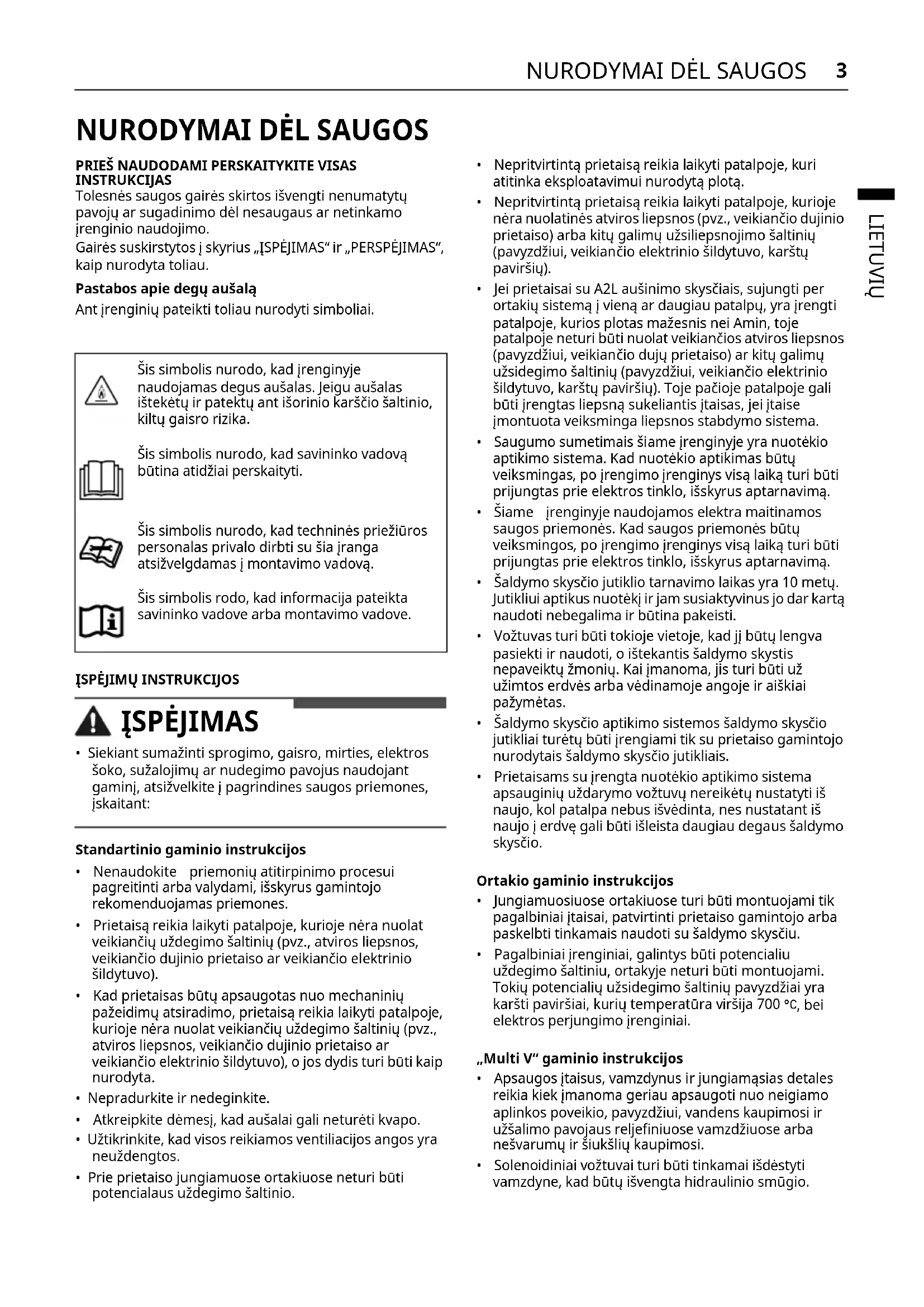 INSTRUKCIJAS Tolesnės saugos gairės skirtos išvengti nenumatytų pavojų ar sugadinimo dėl nesaugaus ar netinkamo įrenginio naudojimo. Gairės suskirstytos į skyrius „ĮSPĖJIMAS“ ir „PERSPĖJIMAS“, kaip nurodyta toliau. Pastabos apie degų aušalą Ant įrenginių pateikti toliau nurodyti simboliai.