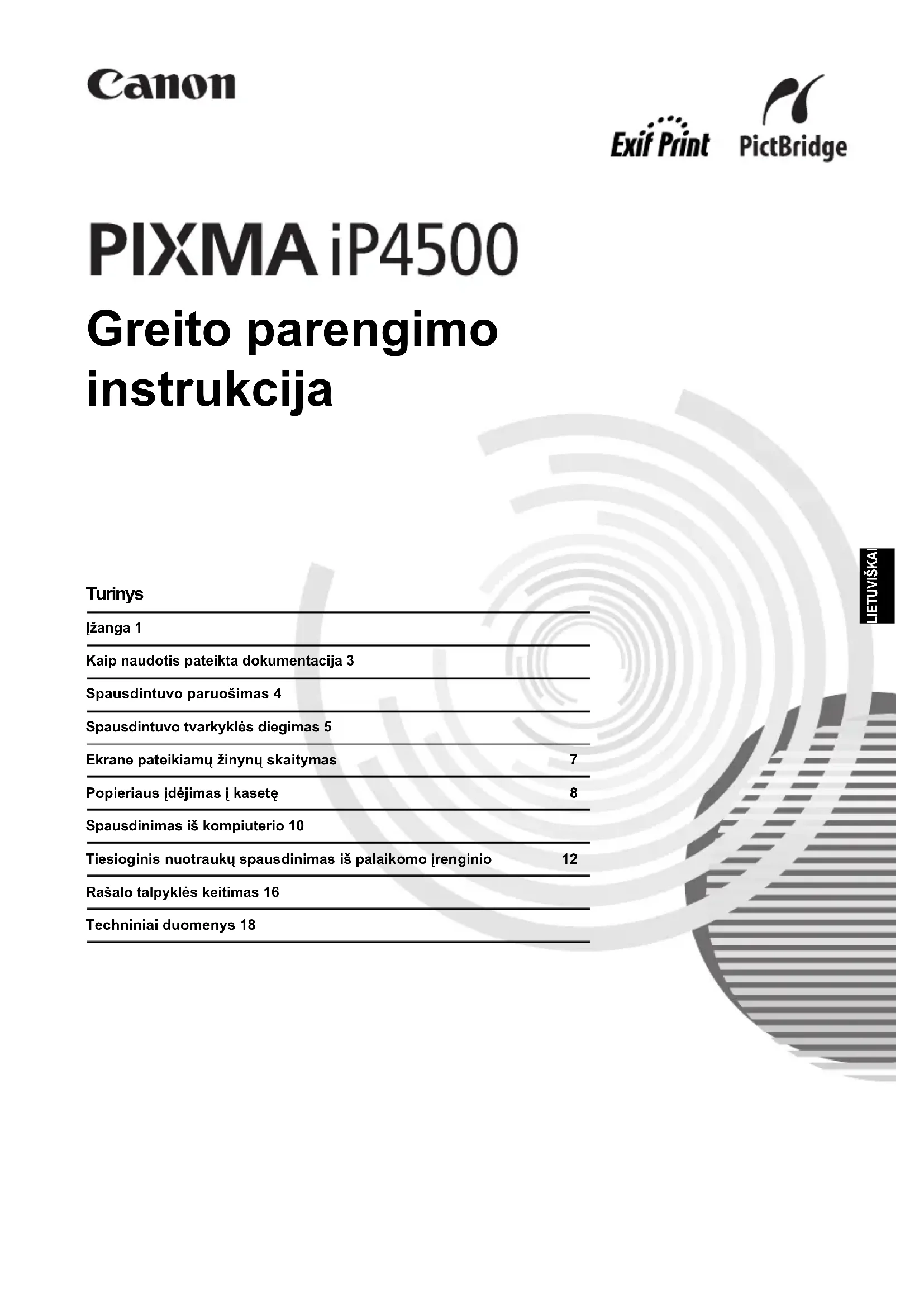 Internet Explorer 5.0 vai jaunāka versija. Atkarībā no operētājsistēmas vai Internet Explorer versijas elektroniskā rokasgrāmata var tikt parādīta nepareizi. Mēs iesakām regulāri atjaunināt sistēmu, izmantojot Windows Update. Pārlūkprogramma: Help Viewer Piezīme: atkarībā no operētājsistēmas vai Internet Explorer versijas elektroniskā rokasgrāmata var tikt parādīta nepareizi. Mēs iesakām regulāri atjaunināt sistēmu, izmantojot Software Update.LIETUVIŠKAI Greito parengimo instrukcija Turinys Įžanga 1 Kaip naudotis pateikta dokumentacija 3 Spausdintuvo paruošimas 4 Spausdintuvo tvarkyklės diegimas 5 Ekrane pateikiamų žinynų skaitymas 7 Popieriaus įdėjimas į kasetę 8 Spausdinimas iš kompiuterio 10 Tiesioginis nuotraukų spausdinimas iš palaikomo įrenginio 12 Rašalo talpyklės keitimas 16 Techniniai duomenys 18LIETUVIŠKAI Tik Europos Sąjunga (ir EEE). Šis ženklas reiškia, kad gaminio negalima išmesti su buitinėmis atliekomis, kaip yra nustatyta Direktyvoje (2002/96/EB) ir nacionaliniuose teisė aktuose dėl EE atliekų tvarkymo. Šį gaminį reikia atiduoti į tam skirtą surinkimo punktą, pvz., pagal patvirtintą keitimo sistemą, kai perkamas panašus gaminys, arba į elektros ir elektroninės įrangos (EE) atliekų perdirbimo punktą. Netinkamas tokios rūšies atliekų tvarkymas dėl elektros ir elektroninėje įrangoje esančių pavojingų medžiagų gali pakenkti aplinkai ir žmonių sveikatai. Padėdami užtikrinti tinkamą šio gaminio šalinimo tvarką kartu prisidėsite prie veiksmingo gamtos išteklių naudojimo. Jei reikia daugiau informacijos kaip šalinti tokias atliekas, kad jos būtų toliau perdirbamos, kreipkitės į savo miesto valdžios institucijas, atliekų tvarkymo organizacijas, patvirtintų EE atliekų sistemų arba jūsų buitinių atliekų tvarkymo įstaigų atstovus. Išsamesnės informacijos apie EE atliekų grąžinimo ir perdirbimo tvarką galite rasti apsilankę www.canon-europe.com/environment