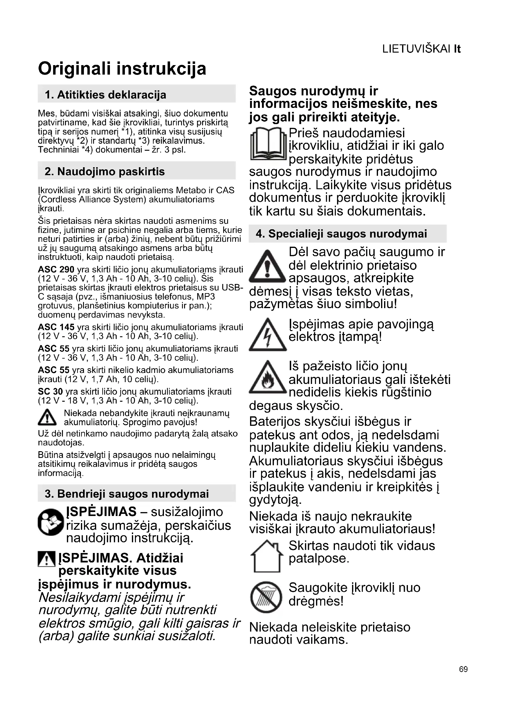 Originali instrukcija Mes, būdami visiškai atsakingi, šiuo dokumentu patvirtiname, kad šie įkrovikliai, turintys priskirtą tipą ir serijos numerį *1), atitinka visų susijusių direktyvų *2) ir standartų *3) reikalavimus. Techniniai *4) dokumentai – žr. 3 psl. Įkrovikliai yra skirti tik originaliems Metabo ir CAS (Cordless Alliance System) akumuliatoriams įkrauti. Šis prietaisas nėra skirtas naudoti asmenims su fizine, jutimine ar psichine negalia arba tiems, kurie neturi patirties ir (arba) žinių, nebent būtų prižiūrimi už jų saugumą atsakingo asmens arba būtų instruktuoti, kaip naudoti prietaisą. ASC 290 yra skirti ličio jonų akumuliatoriams įkrauti (12 V - 36 V, 1,3 Ah - 10 Ah, 3-10 celių). Šis prietaisas skirtas įkrauti elektros prietaisus su USB- C sąsaja (pvz., išmaniuosius telefonus, MP3 grotuvus, planšetinius kompiuterius ir pan.); duomenų perdavimas nevyksta. ASC 145 yra skirti ličio jonų akumuliatoriams įkrauti (12 V - 36 V, 1,3 Ah - 10 Ah, 3-10 celių). ASC 55 yra skirti ličio jonų akumuliatoriams įkrauti (12 V - 36 V, 1,3 Ah - 10 Ah, 3-10 celių). ASC 55 yra skirti nikelio kadmio akumuliatoriams įkrauti (12 V, 1,7 Ah, 10 celių). SC 30 yra skirti ličio jonų akumuliatoriams įkrauti (12 V - 18 V, 1,3 Ah - 10 Ah, 3-10 celių). Niekada nebandykite įkrauti neįkraunamų akumuliatorių. Sprogimo pavojus! Už dėl netinkamo naudojimo padarytą žalą atsako naudotojas. Būtina atsižvelgti į apsaugos nuo nelaimingų atsitikimų reikalavimus ir pridėtą saugos informaciją. ĮSPĖJIMAS – susižalojimo rizika sumažėja, perskaičius naudojimo instrukciją. ĮSPĖJIMAS. Atidžiai perskaitykite visus įspėjimus ir nurodymus. Nesilaikydami įspėjimų ir nurodymų, galite būti nutrenkti elektros smūgio, gali kilti gaisras ir (arba) galite sunkiai susižaloti. Saugos nurodymų ir informacijos neišmeskite, nes jos gali prireikti ateityje. Prieš naudodamiesi įkrovikliu, atidžiai ir iki galo perskaitykite pridėtus saugos nurodymus ir naudojimo instrukciją. Laikykite visus pridėtus dokumentus ir perduokite įkroviklį tik kartu su šiais dokumentais. Dėl savo pačių saugumo ir dėl elektrinio prietaiso apsaugos, atkreipkite dėmesį į visas teksto vietas, pažymėtas šiuo simboliu! Įspėjimas apie pavojingą elektros įtampą! Iš pažeisto ličio jonų akumuliatoriaus gali ištekėti nedidelis kiekis rūgštinio degaus skysčio. Baterijos skysčiui išbėgus ir patekus ant odos, ją nedelsdami nuplaukite dideliu kiekiu vandens. Akumuliatoriaus skysčiui išbėgus ir patekus į akis, nedelsdami jas išplaukite vandeniu ir kreipkitės į gydytoją. Niekada iš naujo nekraukite visiškai įkrauto akumuliatoriaus! Skirtas naudoti tik vidaus patalpose. Saugokite įkroviklį nuo drėgmės! Niekada neleiskite prietaiso naudoti vaikams.