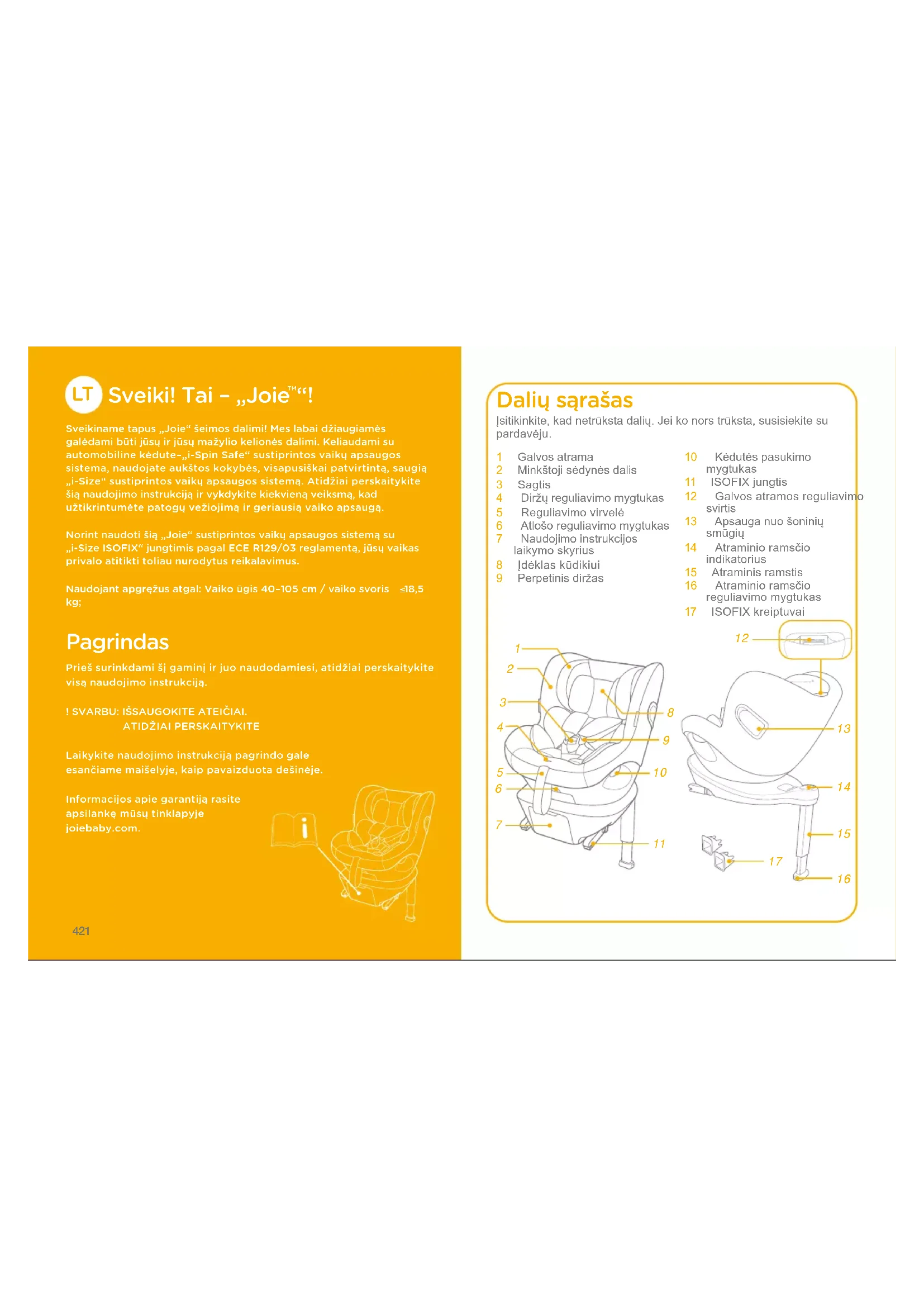 Sveikiname tapus „Joie“ šeimos dalimi! Mes labai džiaugiamės galėdami būti jūsų ir jūsų mažylio kelionės dalimi. Keliaudami su automobiline kėdute–„i-Spin Safe“ sustiprintos vaikų apsaugos sistema, naudojate aukštos kokybės, visapusiškai patvirtintą, saugią „i-Size“ sustiprintos vaikų apsaugos sistemą. Atidžiai perskaitykite šią naudojimo instrukciją ir vykdykite kiekvieną veiksmą, kad užtikrintumėte patogų vežiojimą ir geriausią vaiko apsaugą.Norint naudoti šią „Joie“ sustiprintos vaikų apsaugos sistemą su „i-Size ISOFIX“ jungtimis pagal ECE R129/03 reglamentą, jūsų vaikas privalo atitikti toliau nurodytus reikalavimus.Naudojant apgręžus atgal: Vaiko ūgis 40–105 cm / vaiko svoris 18,5 kg; Pagrindas Prieš surinkdami šį gaminį ir juo naudodamiesi, atidžiai perskaitykite visą naudojimo instrukciją.! SVARBU: IŠSAUGOKITE ATEIČIAI.ATIDŽIAI PERSKAITYKITELaikykite naudojimo instrukciją pagrindo gale esančiame maišelyje, kaip pavaizduota dešinėje.Informacijos apie garantiją rasite apsilankę mūsų tinklapyje joiebaby.com. Dalių sąrašas 1 Galvosatrama2 Minkštojisėdynėsdalis3 Sagtis4 Diržųreguliavimomygtukas5 Reguliavimovirvelė6 Atlošoreguliavimomygtukas7 Naudojimoinstrukcijoslaikymoskyrius8 Įdėklaskūdikiui9 Perpetinisdiržas10 Kėdutėspasukimomygtukas11 ISOFIXjungtis12 Galvosatramosreguliavimosvirtis13 Apsauganuošoniniųsmūgių14 Atraminioramsčioindikatorius15 Atraminisramstis16 Atraminioramsčioreguliavimomygtukas17 ISOFIXkreiptuvaiĮsitikinkite,kadnetrūkstadalių.Jeikonorstrūksta,susisiekitesupardavėju.