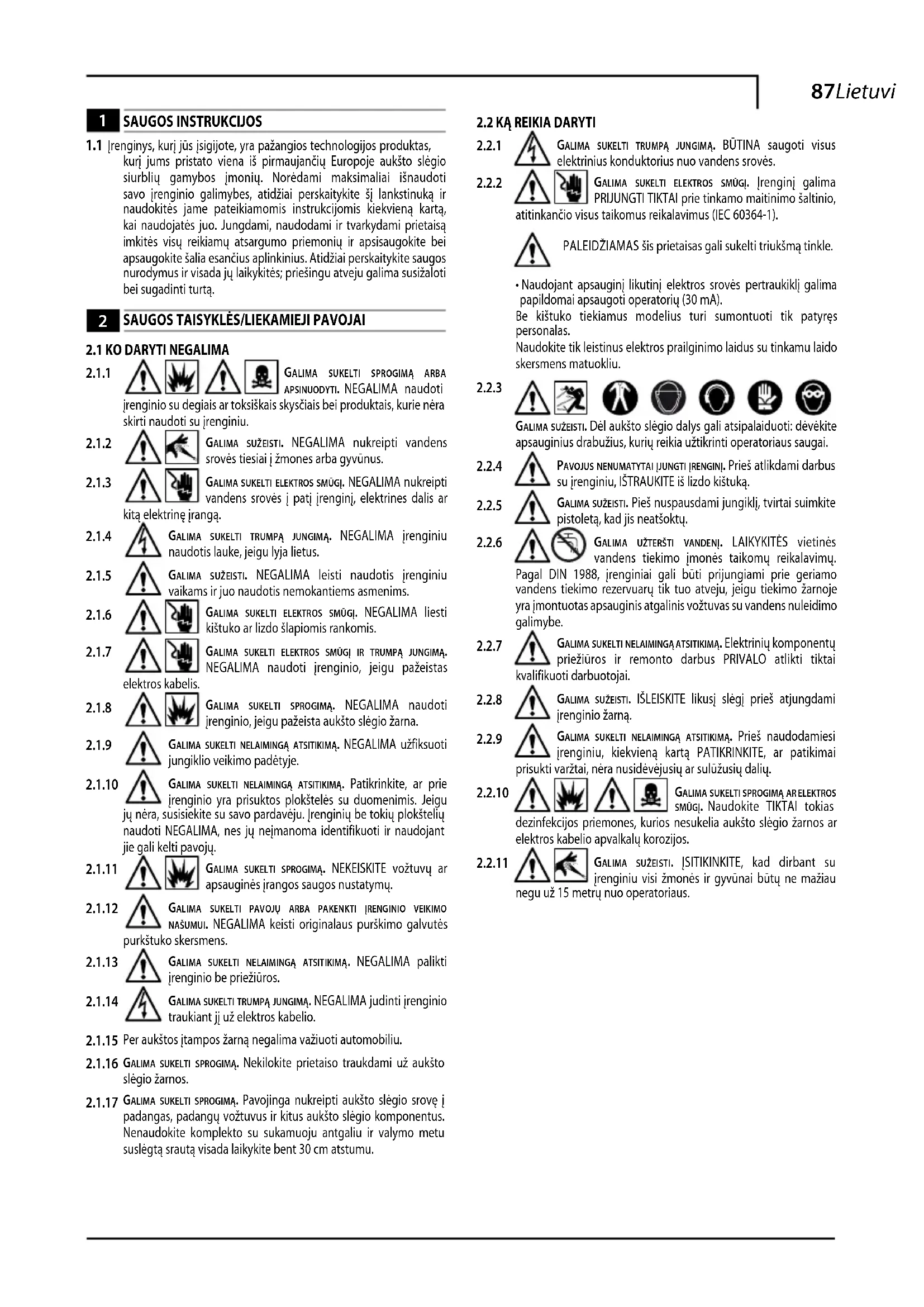 galima sužeisti. ĮSITIKINKITE, kad dirbant su įrenginiu visi žmonės ir gyvūnai būtų ne mažiau negu už 15 metrų nuo operatoriaus.88 Lietuviškai