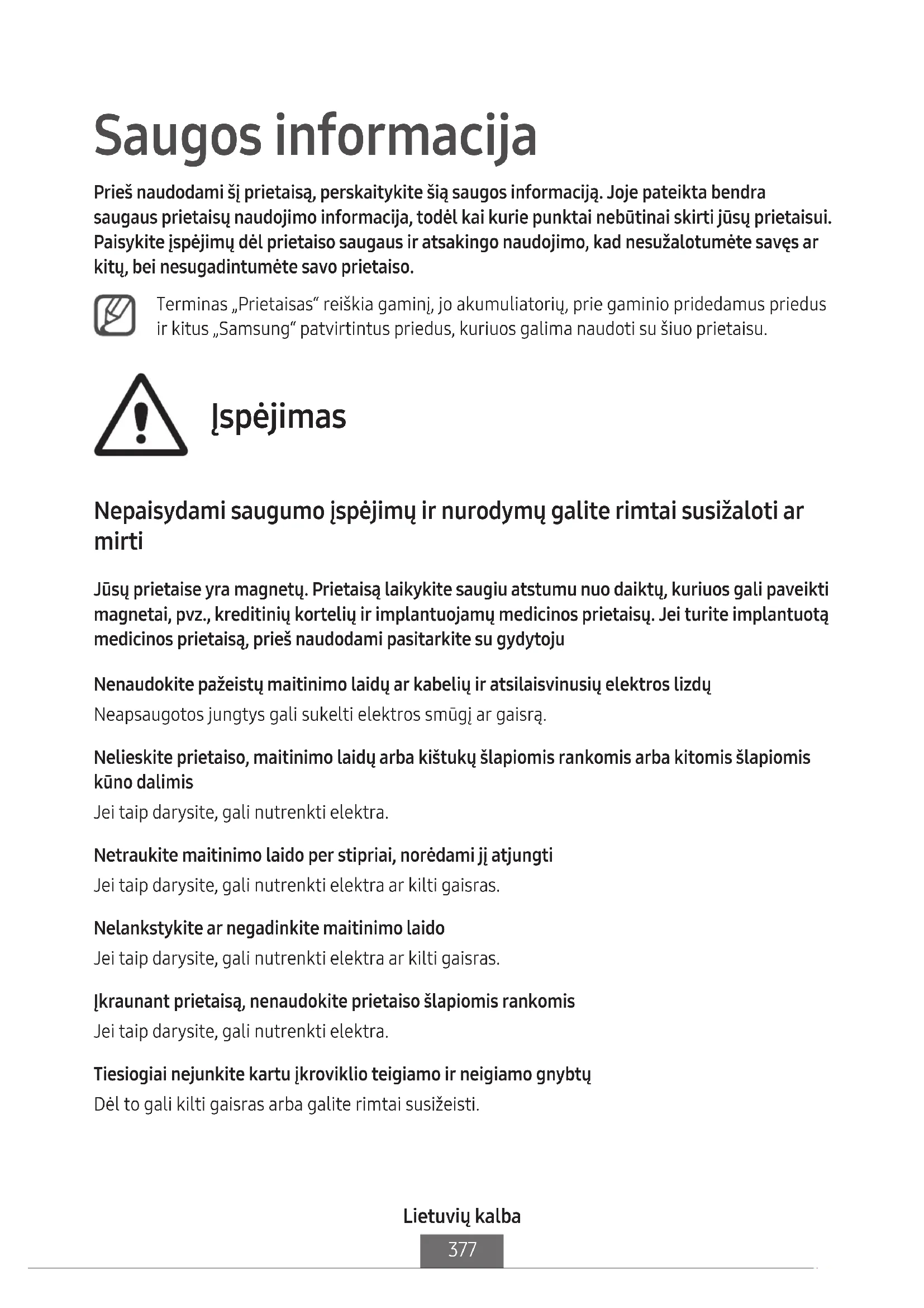 Saugos informacija Prieš naudodami šį prietaisą, perskaitykite šią saugos informaciją. Joje pateikta bendra saugaus prietaisų naudojimo informacija, todėl kai kurie punktai nebūtinai skirti jūsų prietaisui. Paisykite įspėjimų dėl prietaiso saugaus ir atsakingo naudojimo, kad nesužalotumėte savęs ar kitų, bei nesugadintumėte savo prietaiso. Terminas „Prietaisas“ reiškia gaminį, jo akumuliatorių, prie gaminio pridedamus priedus ir kitus „Samsung“ patvirtintus priedus, kuriuos galima naudoti su šiuo prietaisu. Įspėjimas Nepaisydami saugumo įspėjimų ir nurodymų galite rimtai susižaloti ar mirti Jūsų prietaise yra magnetų. Prietaisą laikykite saugiu atstumu nuo daiktų, kuriuos gali paveikti magnetai, pvz., kreditinių kortelių ir implantuojamų medicinos prietaisų. Jei turite implantuotą medicinos prietaisą, prieš naudodami pasitarkite su gydytoju Nenaudokite pažeistų maitinimo laidų ar kabelių ir atsilaisvinusių elektros lizdų Neapsaugotos jungtys gali sukelti elektros smūgį ar gaisrą. Nelieskite prietaiso, maitinimo laidų arba kištukų šlapiomis rankomis arba kitomis šlapiomis kūno dalimis Jei taip darysite, gali nutrenkti elektra. Netraukite maitinimo laido per stipriai, norėdami jį atjungti Jei taip darysite, gali nutrenkti elektra ar kilti gaisras. Nelankstykite ar negadinkite maitinimo laido Jei taip darysite, gali nutrenkti elektra ar kilti gaisras. Įkraunant prietaisą, nenaudokite prietaiso šlapiomis rankomis Jei taip darysite, gali nutrenkti elektra. Tiesiogiai nejunkite kartu įkroviklio teigiamo ir neigiamo gnybtų Dėl to gali kilti gaisras arba galite rimtai susižeisti.Lietuvių kalba